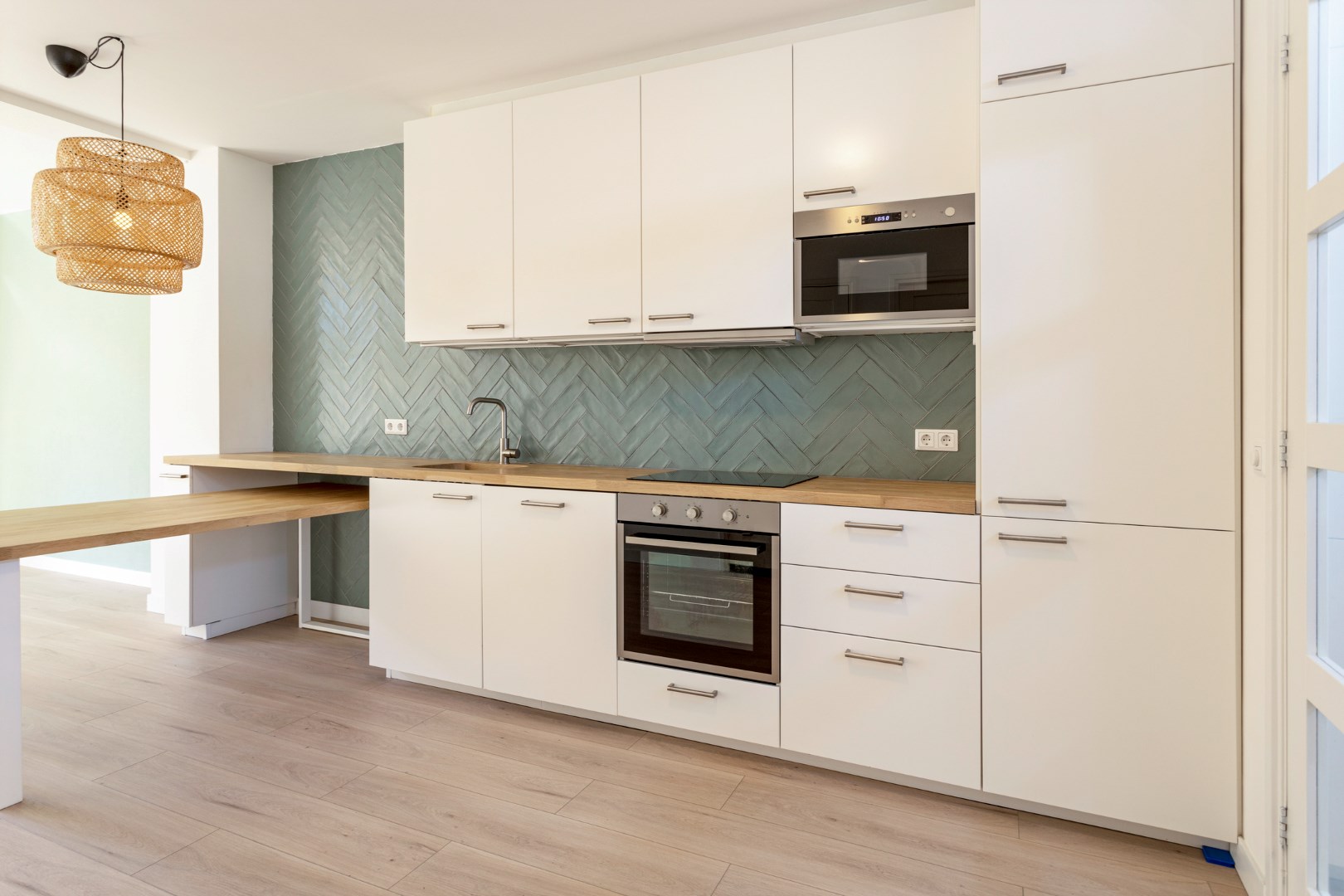Het woongedeelte bestaat uit een moderne witte keuken voorzien van o.a. een inductie kookplaat, vaatwasser, grote koel-/vriescombinatie, oven en een magnetron.