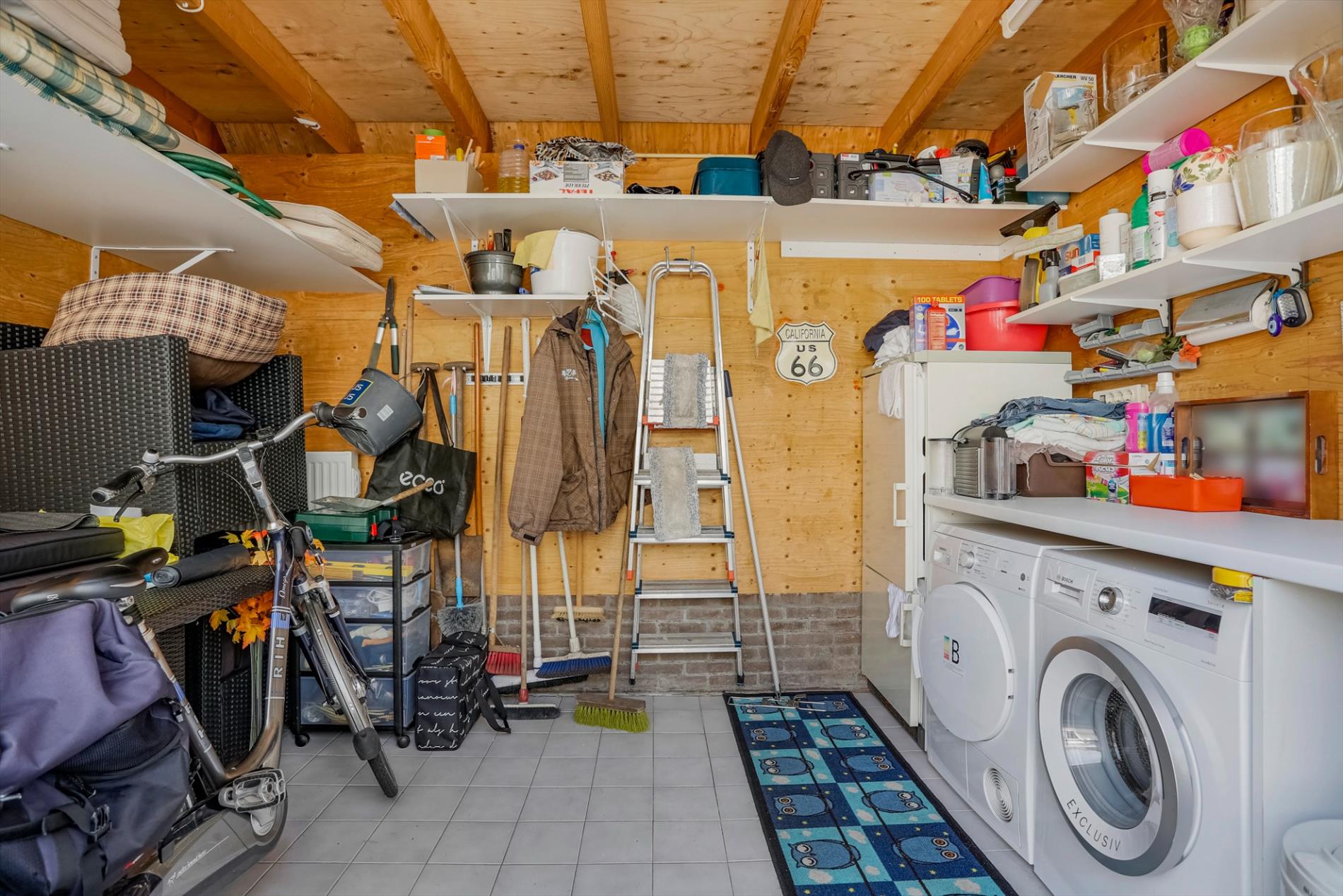 Entrance, hallway with storage and guest toilet, living room with wooden-floor and electric fireplace and double doors to the garden, semi-open kitchen with Boretti gas stove, good sized back-yard with storage provided with connections for washer, dryer and a second fridge.