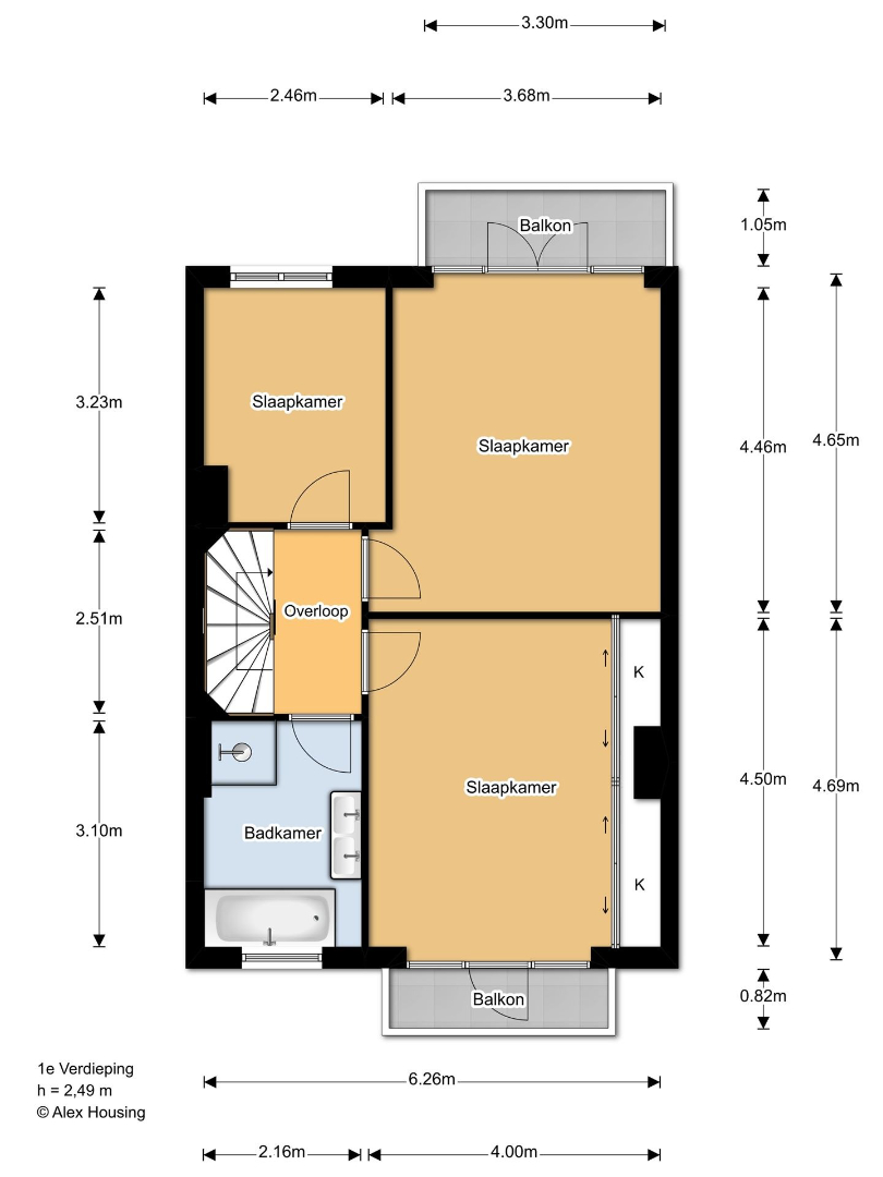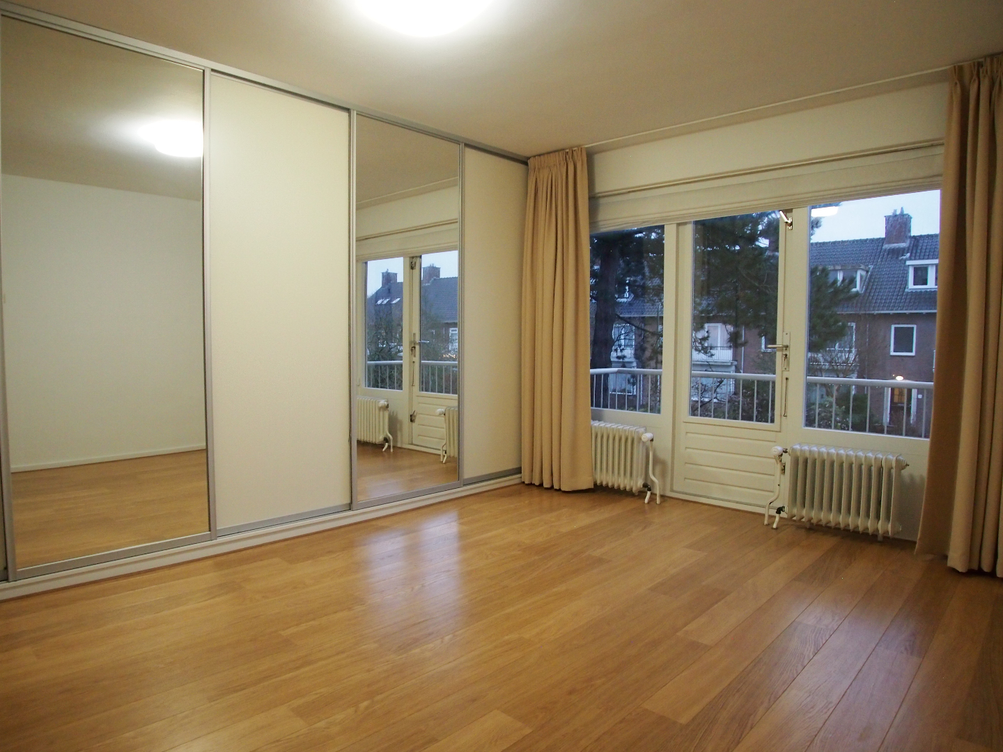 Trap naar de eerste verdieping, overloop, ouderslaapkamer aan de voorzijde met inbouwkast en balkon, ruime badkamer met ligbad, toilet, dubbele wastafel en separate douche, grote slaapkamer aan de achterzijde met balkon, ruime derde slaapkamer.
