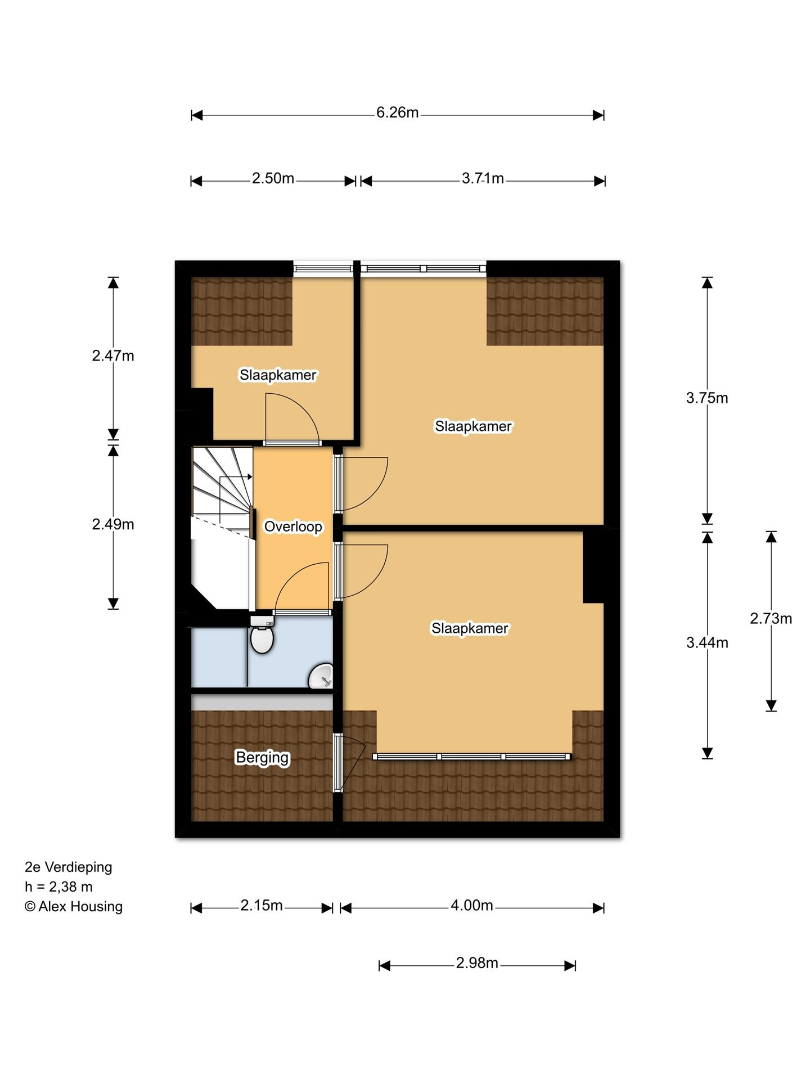Stairs to the top floor, landing, two spacious bedrooms with dormer windows and one smaller (study)room, 2nd shower room with toilet.