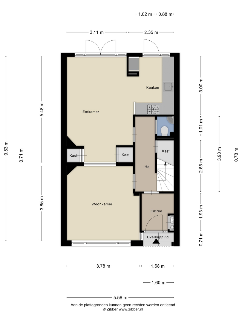 Voortuin, entree, tochtportaal met garderobe en meterkast, gang met toilet en trapkast, woonkamer met schuifseparatie naar de eetkamer, via de openslaande deuren heeft u toegang tot de achtertuin van ca.11 meter op het zuidwesten. De open keuken is voorzien van koel-/vriescombinatie, 5-pits gasfornuis, oven, magnetron en vaatwasser.