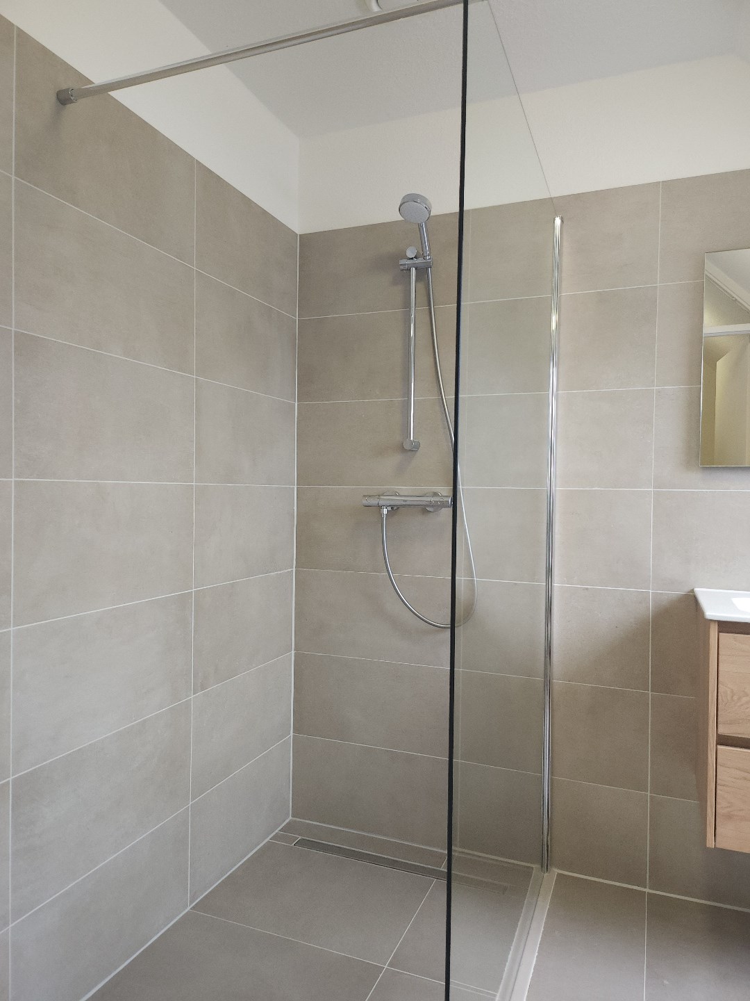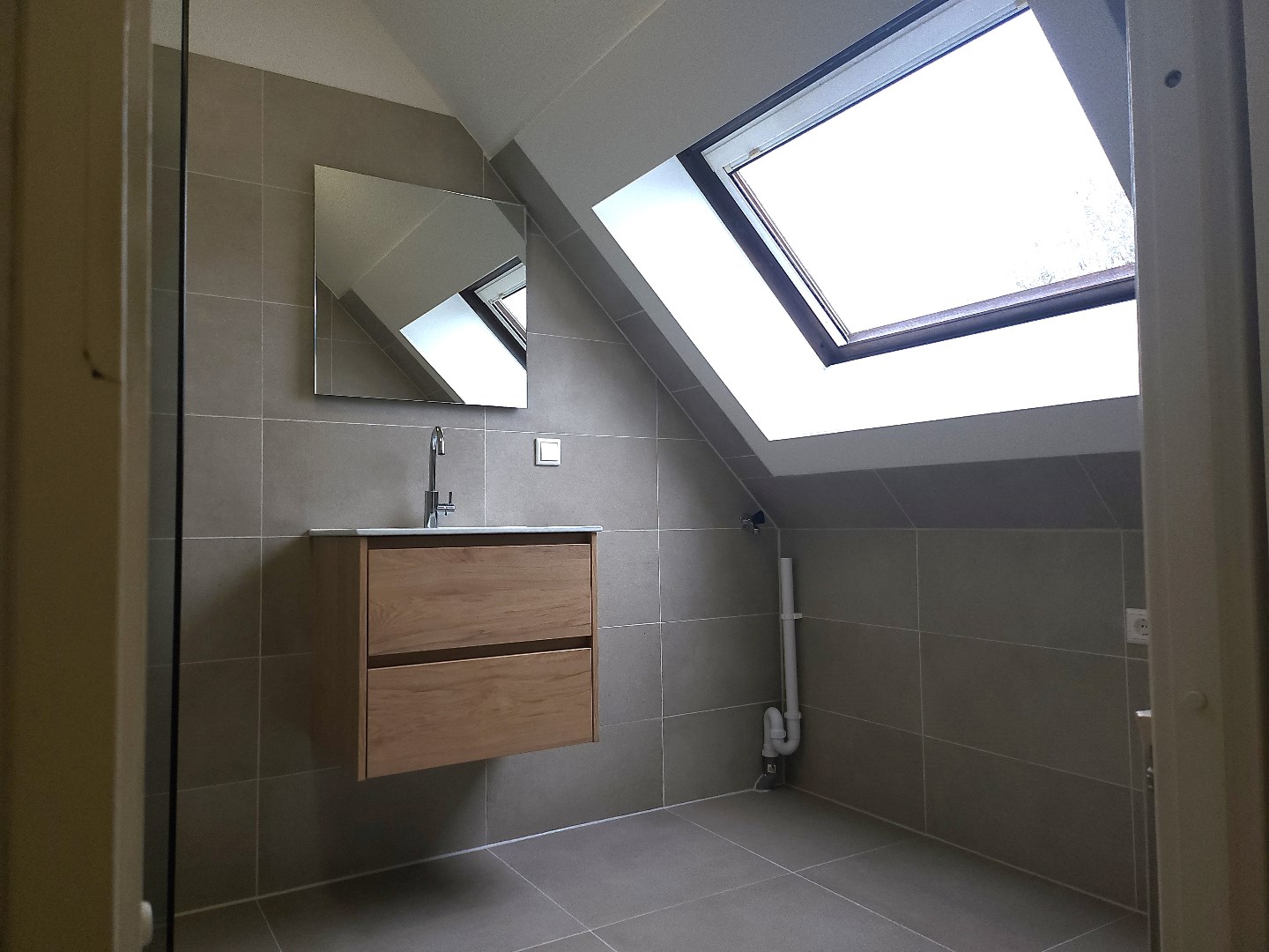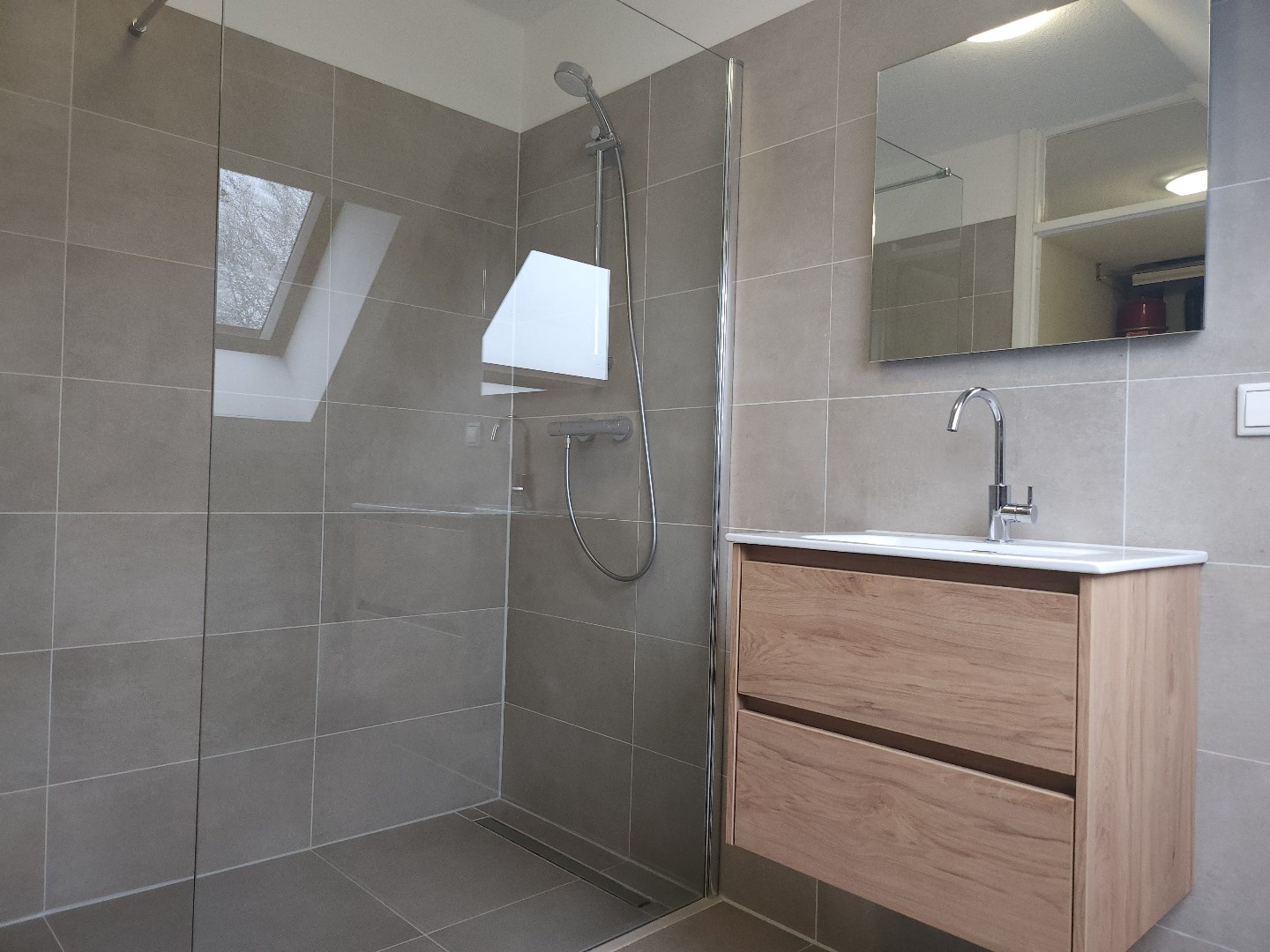 Overloop, ruime slaapkamer (ca. 16 m2) met inbouwkasten, moderne recent gerenoveerde badkamer met inloopdouche, wastafel en opstelplaats voor wasmachine en droger.