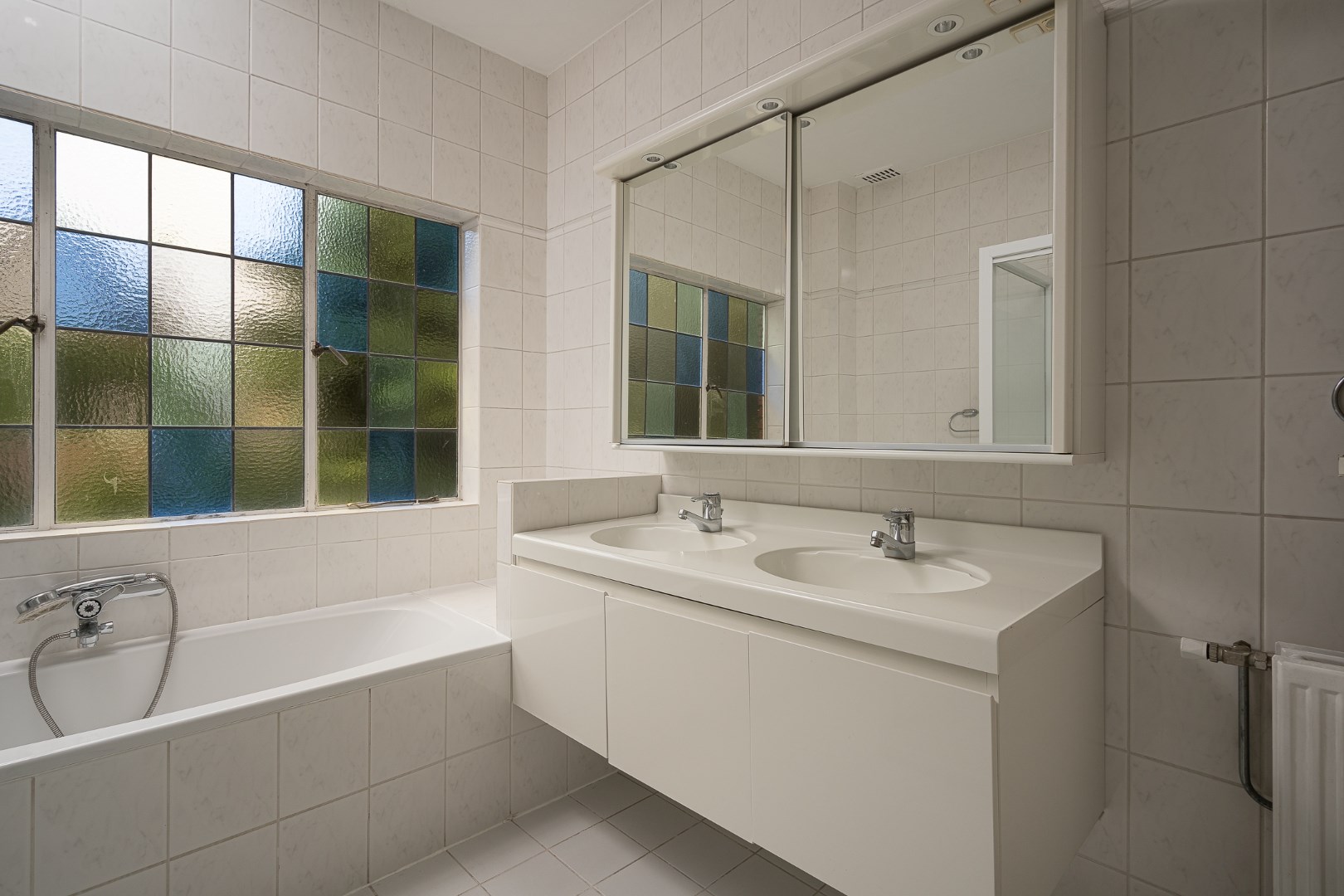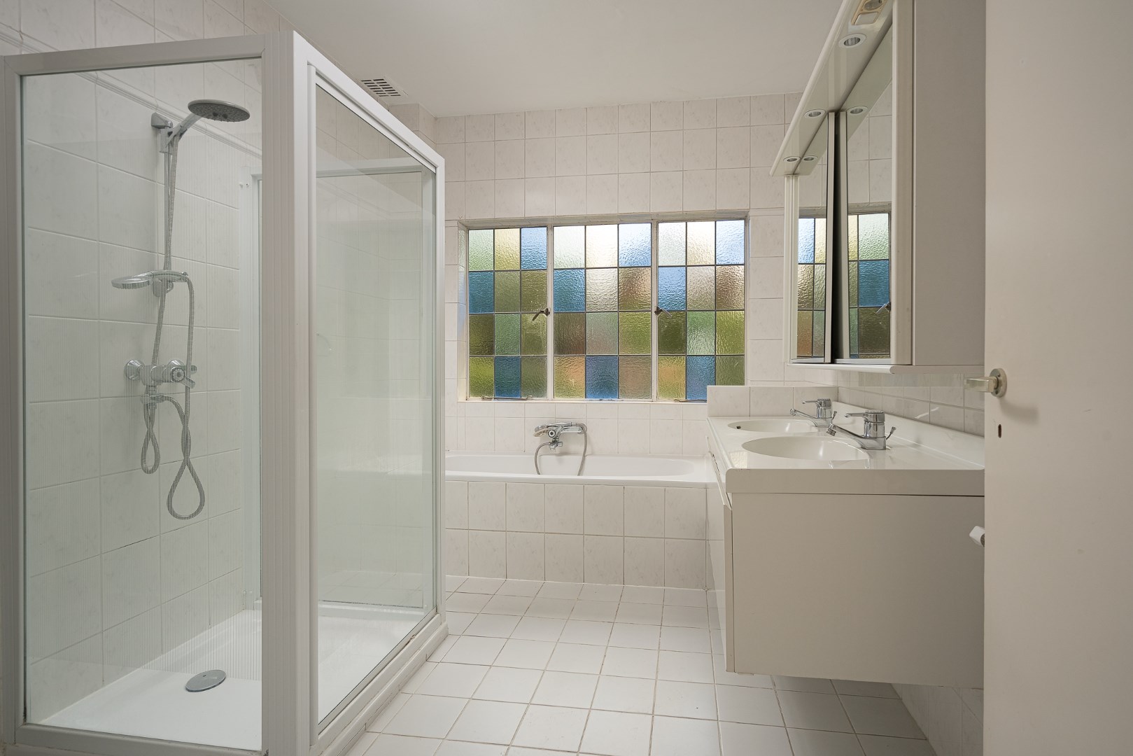 Ruime overloop, twee slaapkamers van goed formaat, badkamer met douche, wastafel en toilet, wasruimte met wasmachine en droger, berging.