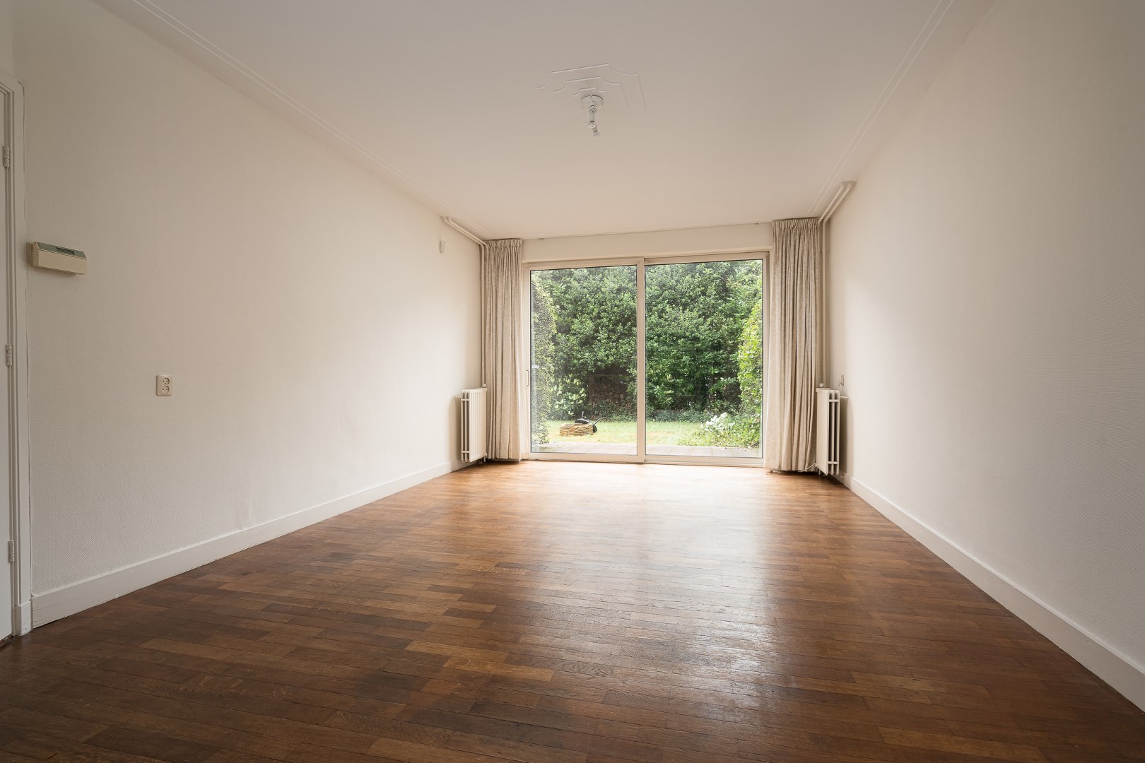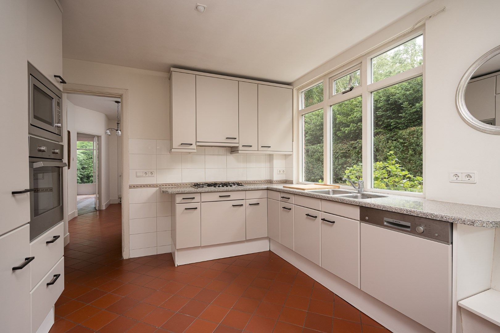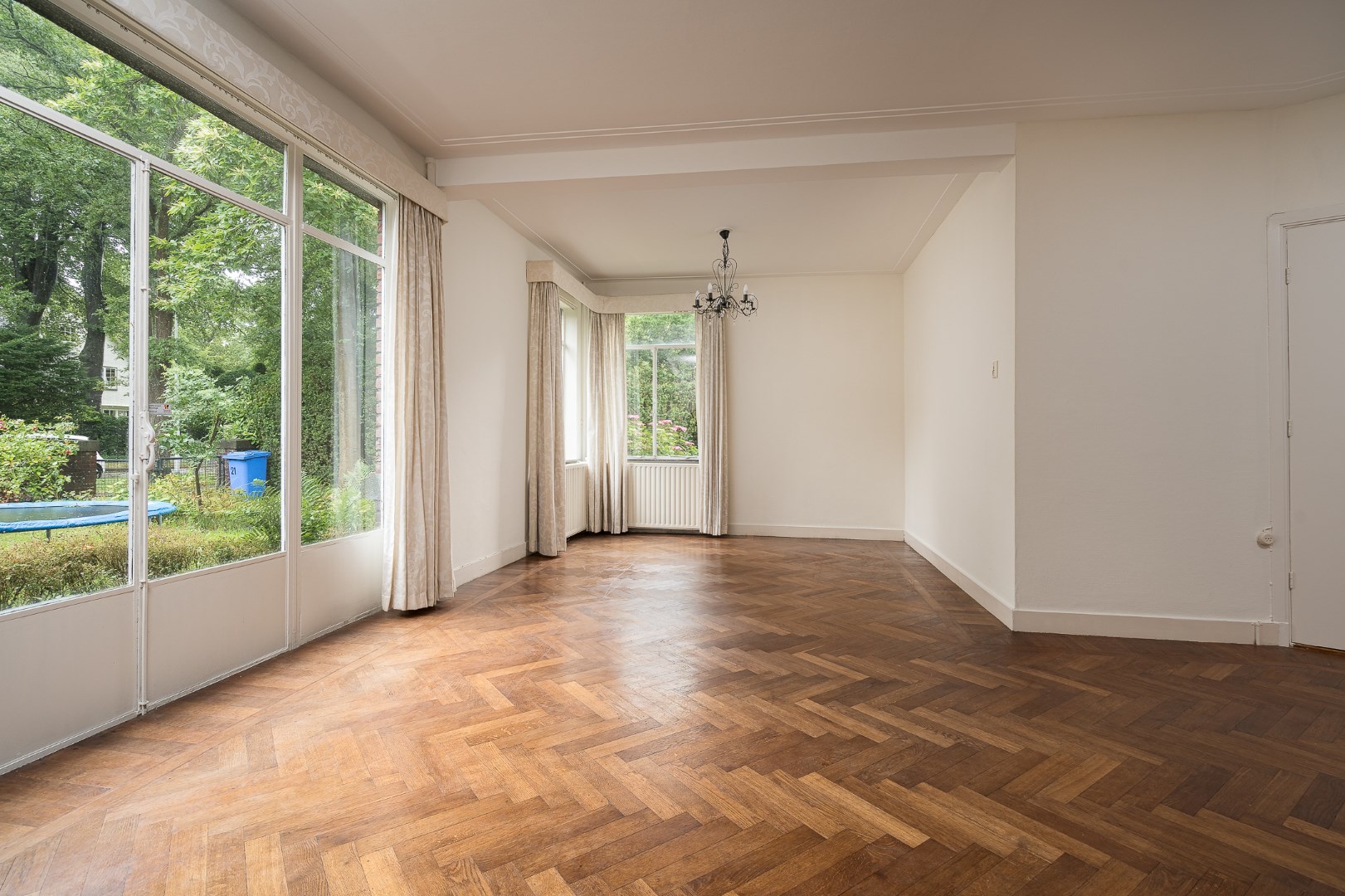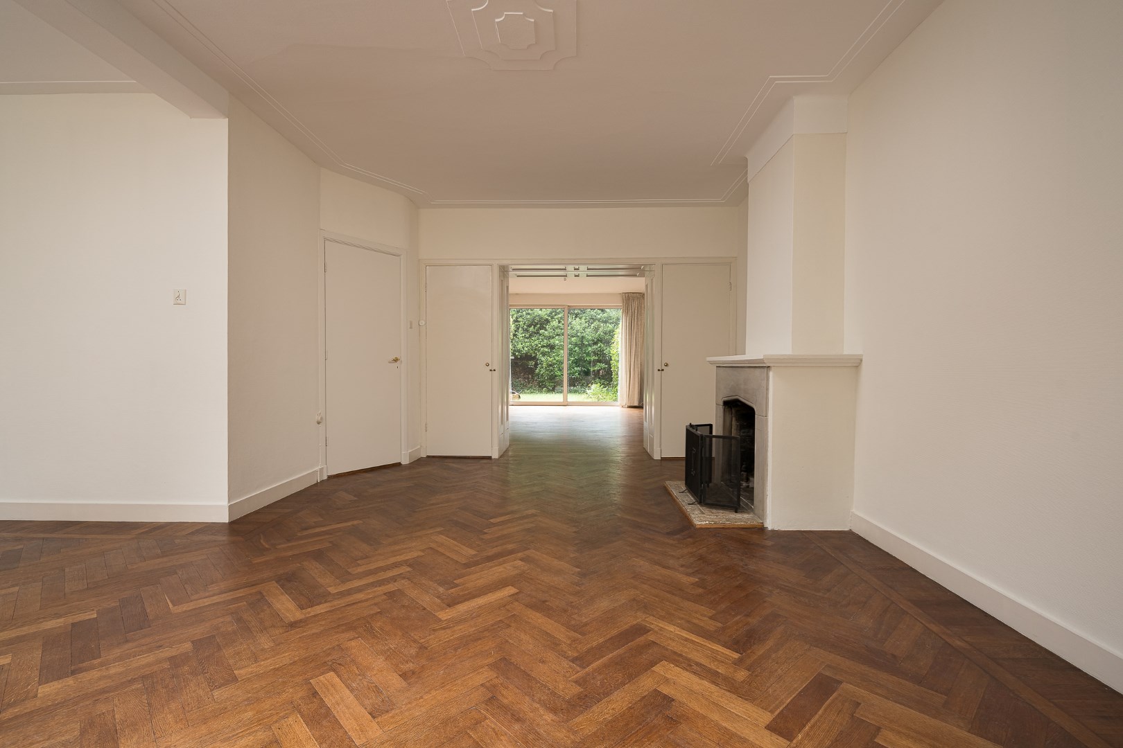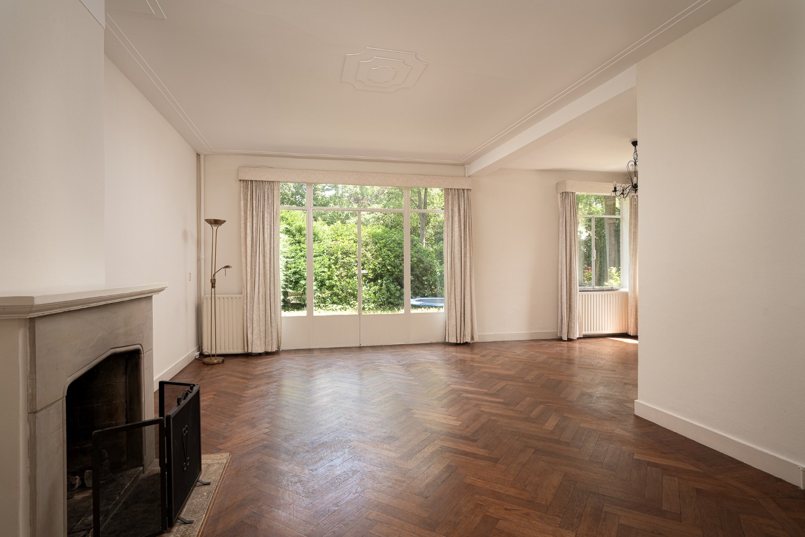 Entrance, hall with cloakroom and access to the large cellar, hall, toilet with fountain, at the front of the house is an L-shaped living room with herringbone parquet floor and fireplace, the dining room is located at the back of the house and through a sliding door you reach the backyard. Spacious kitchen with various built-in appliances and sitting area. You can also enter the backyard through the kitchen.
