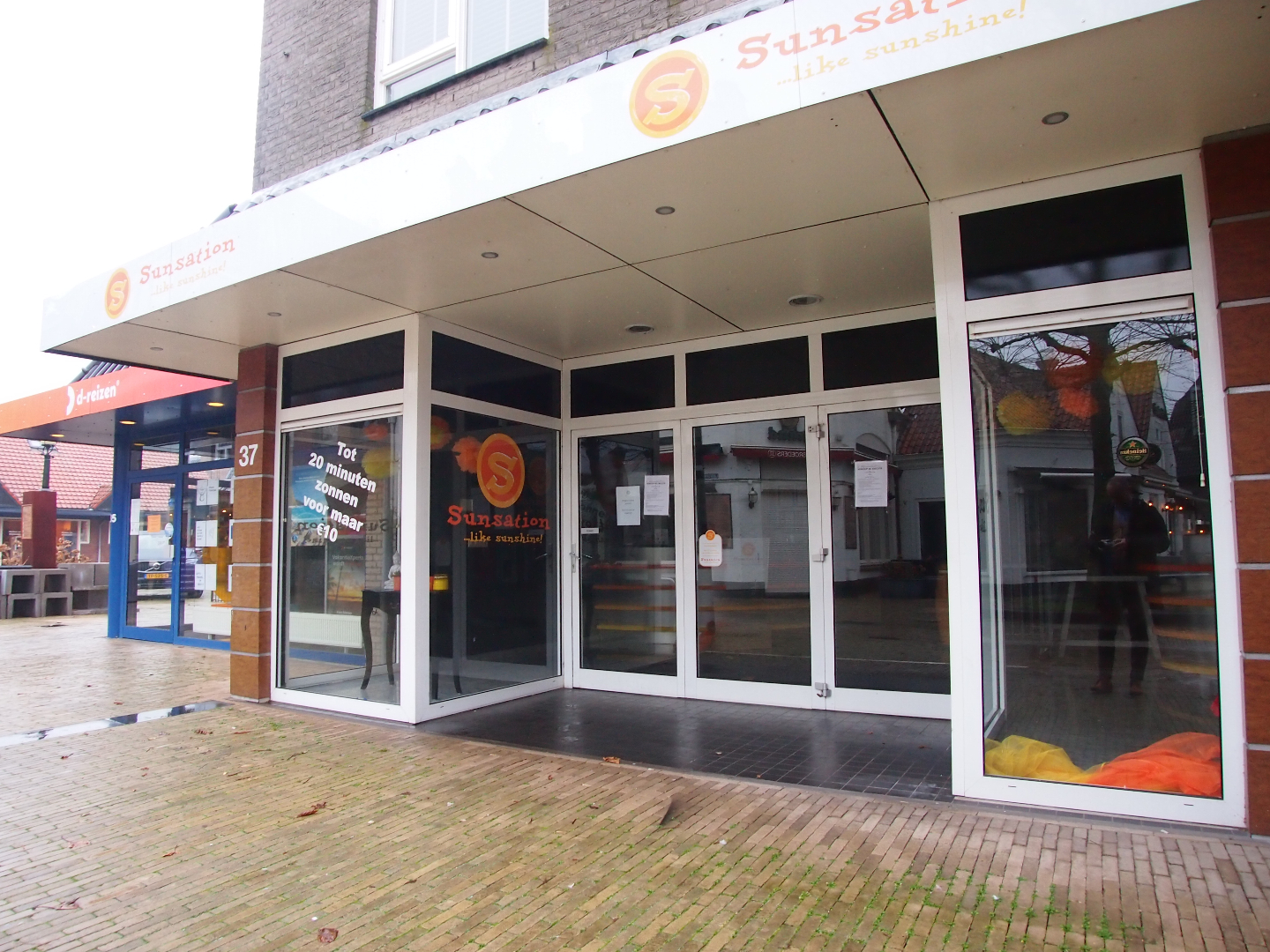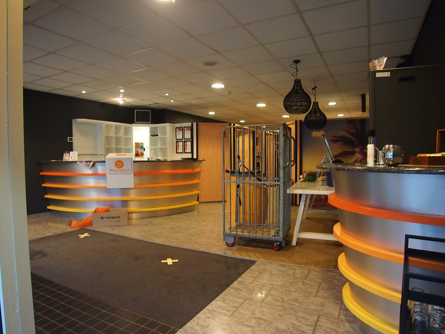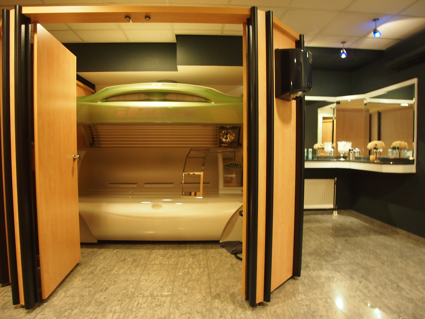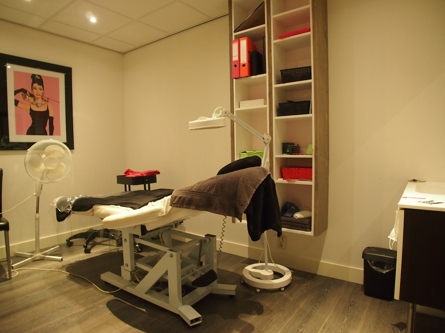 Momenteel is de voorzijde van ca. 120 m² ingericht als zonnestudio. Aan de achterzijde bevinden zich 2 behandelkamers, een wachtruimte, pantry en diverse opslagruimtes.