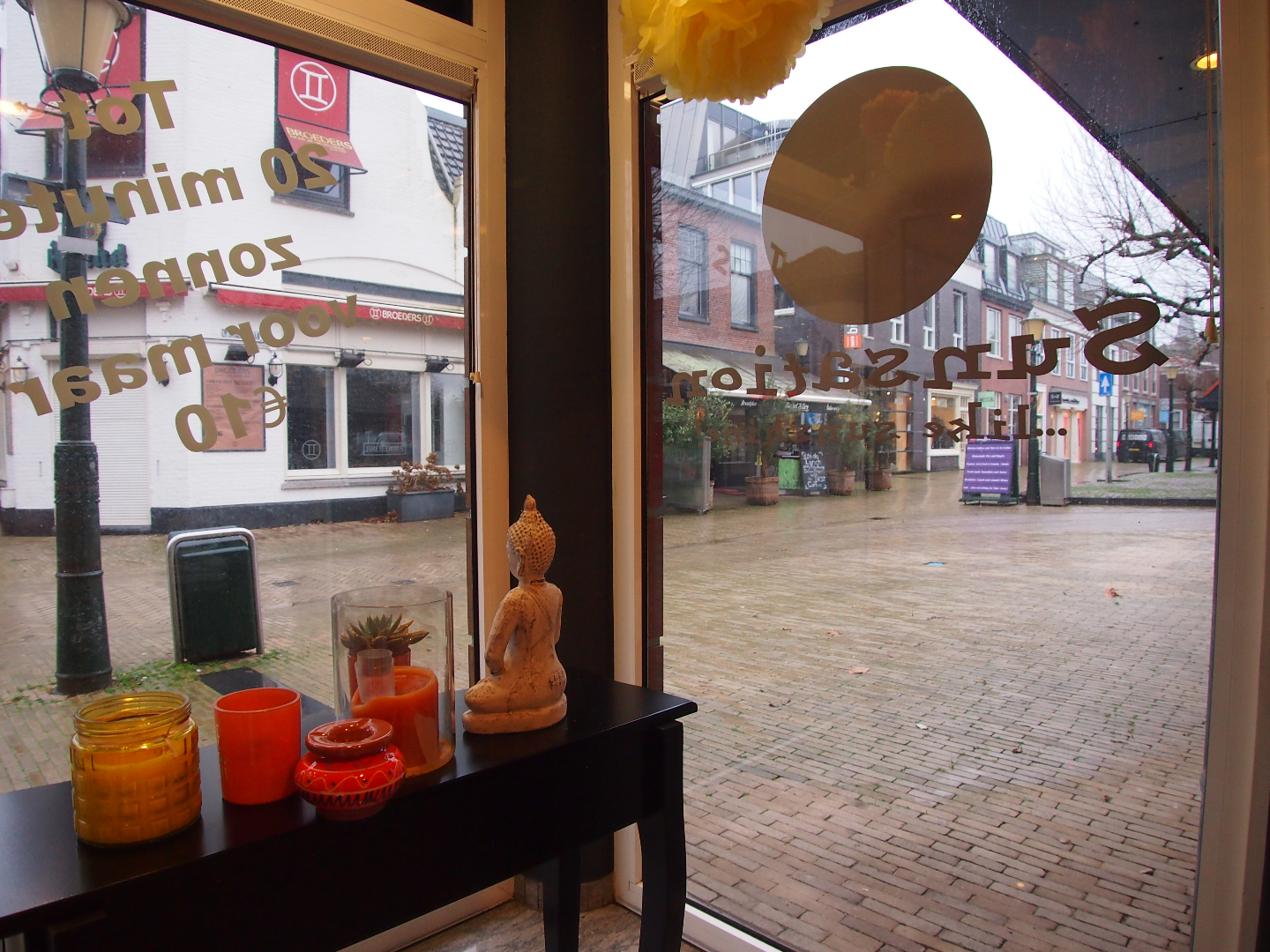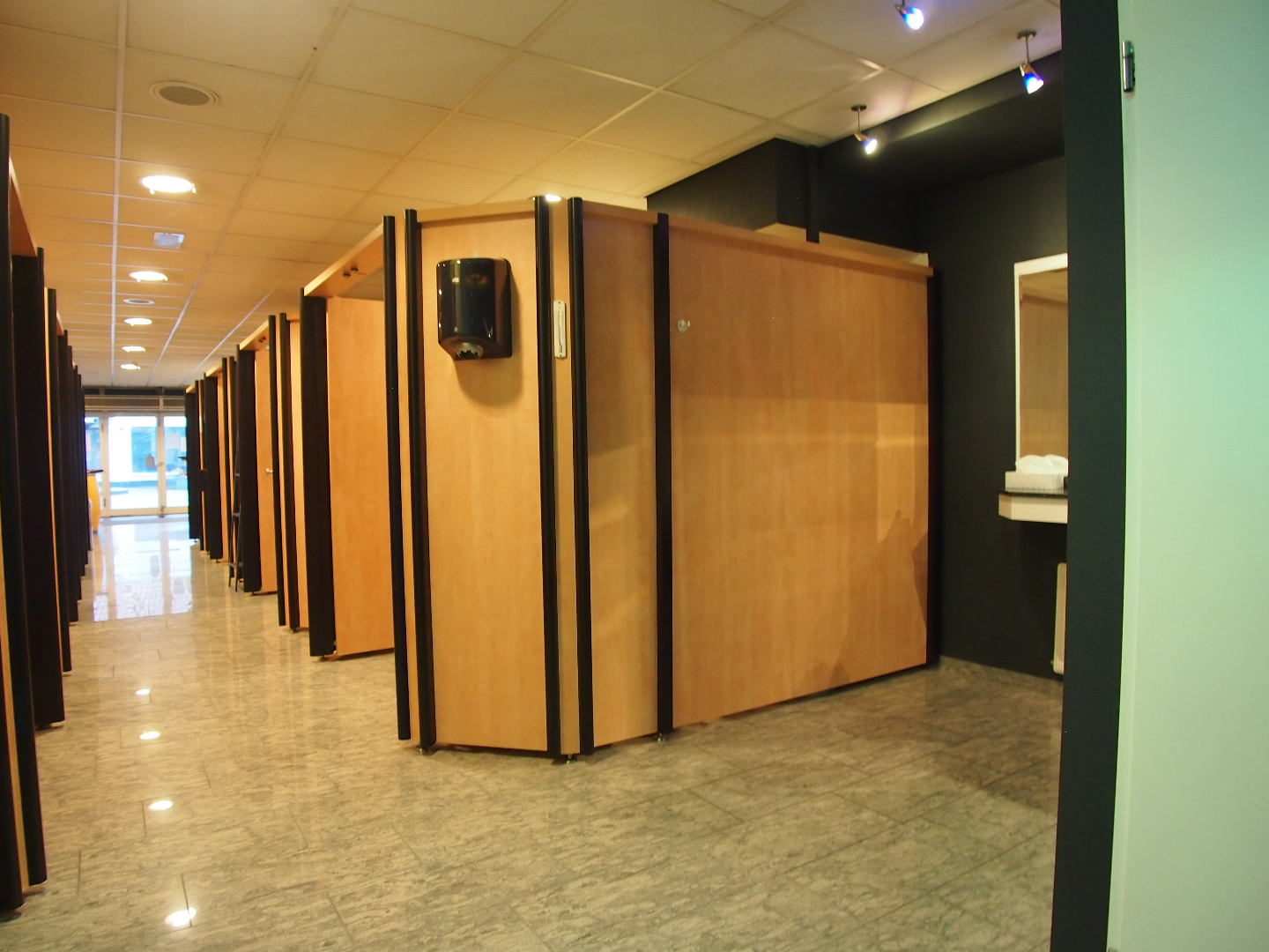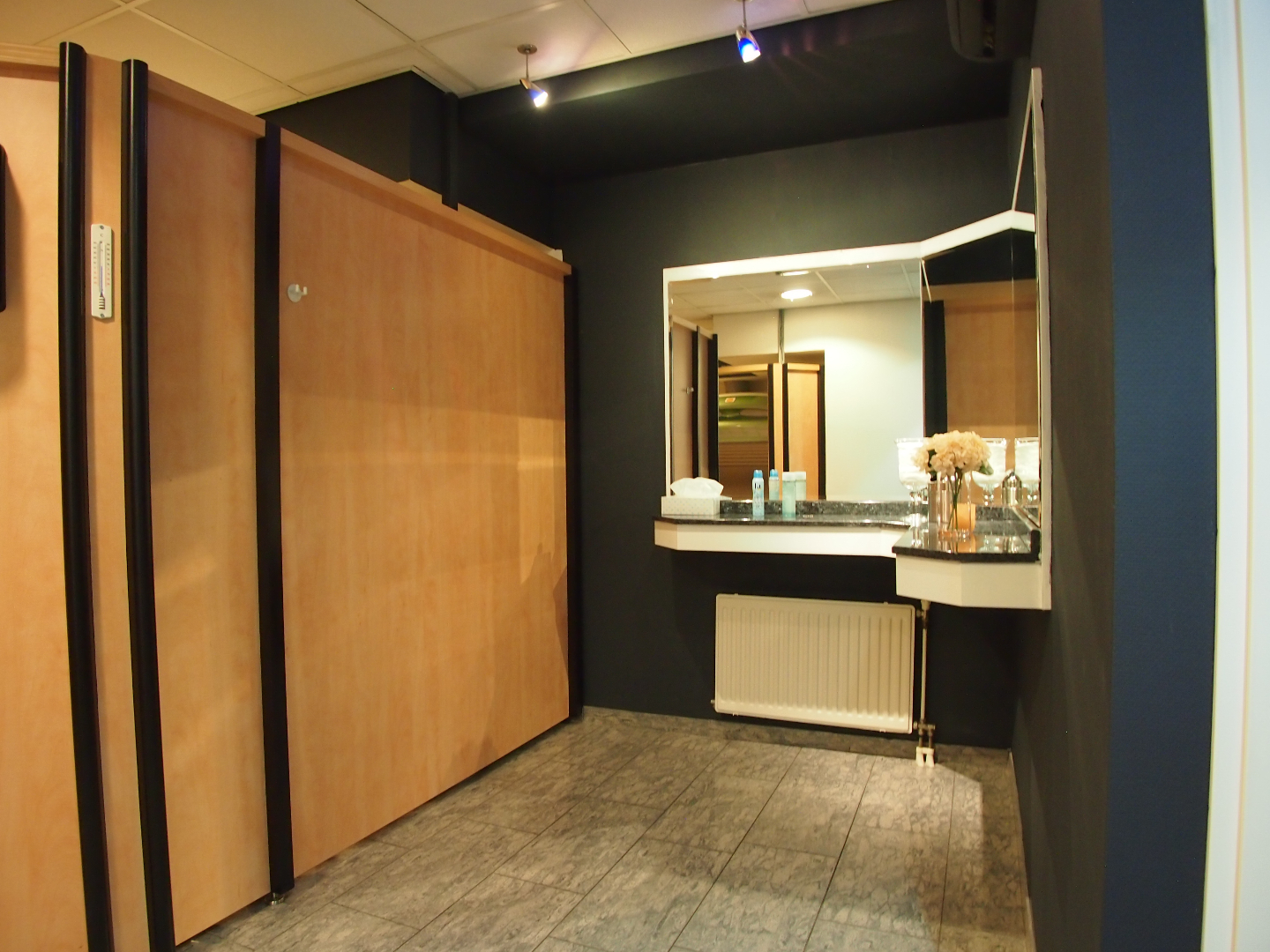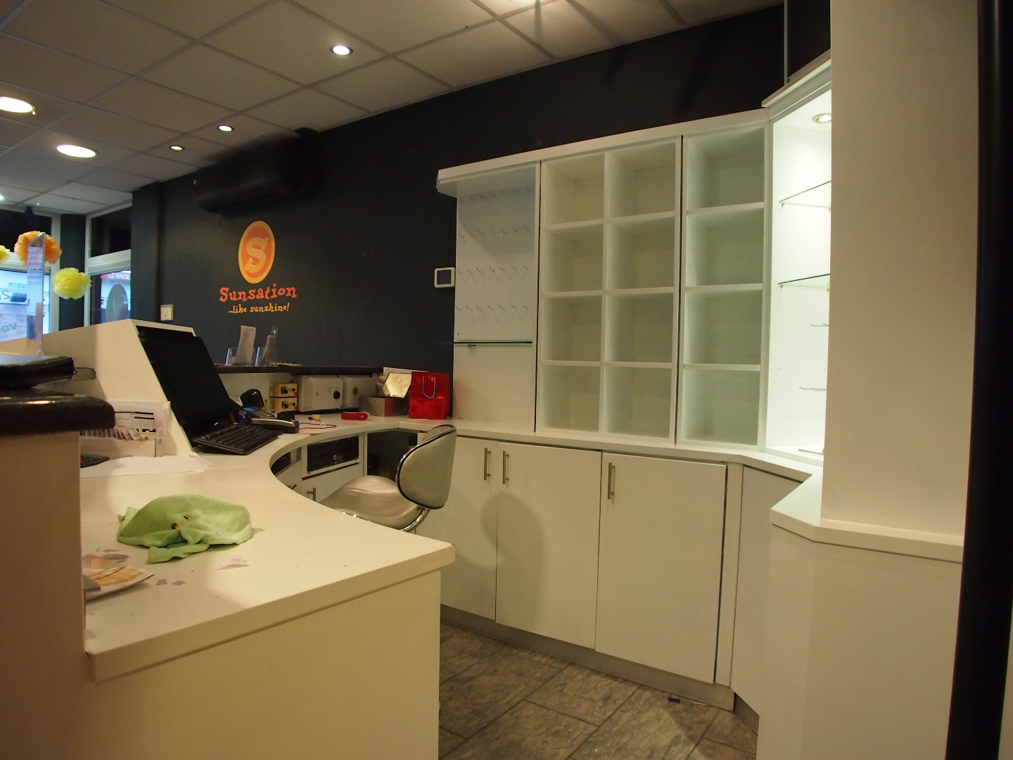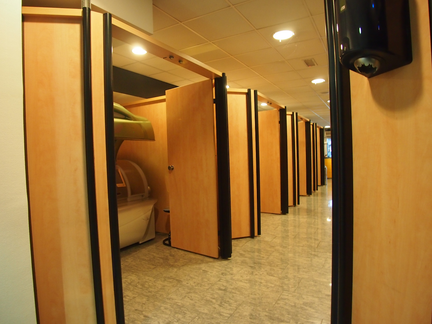 Momenteel is de voorzijde van ca. 120 m² ingericht als zonnestudio. Aan de achterzijde bevinden zich 2 behandelkamers, een wachtruimte, pantry en diverse opslagruimtes.