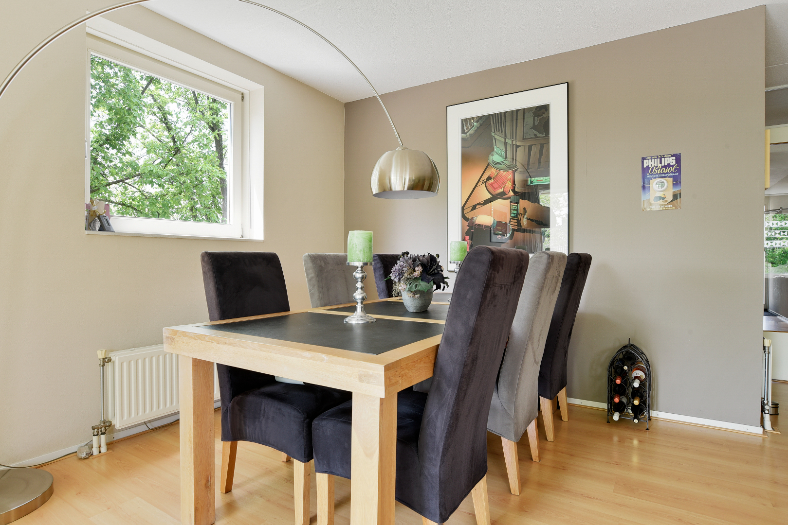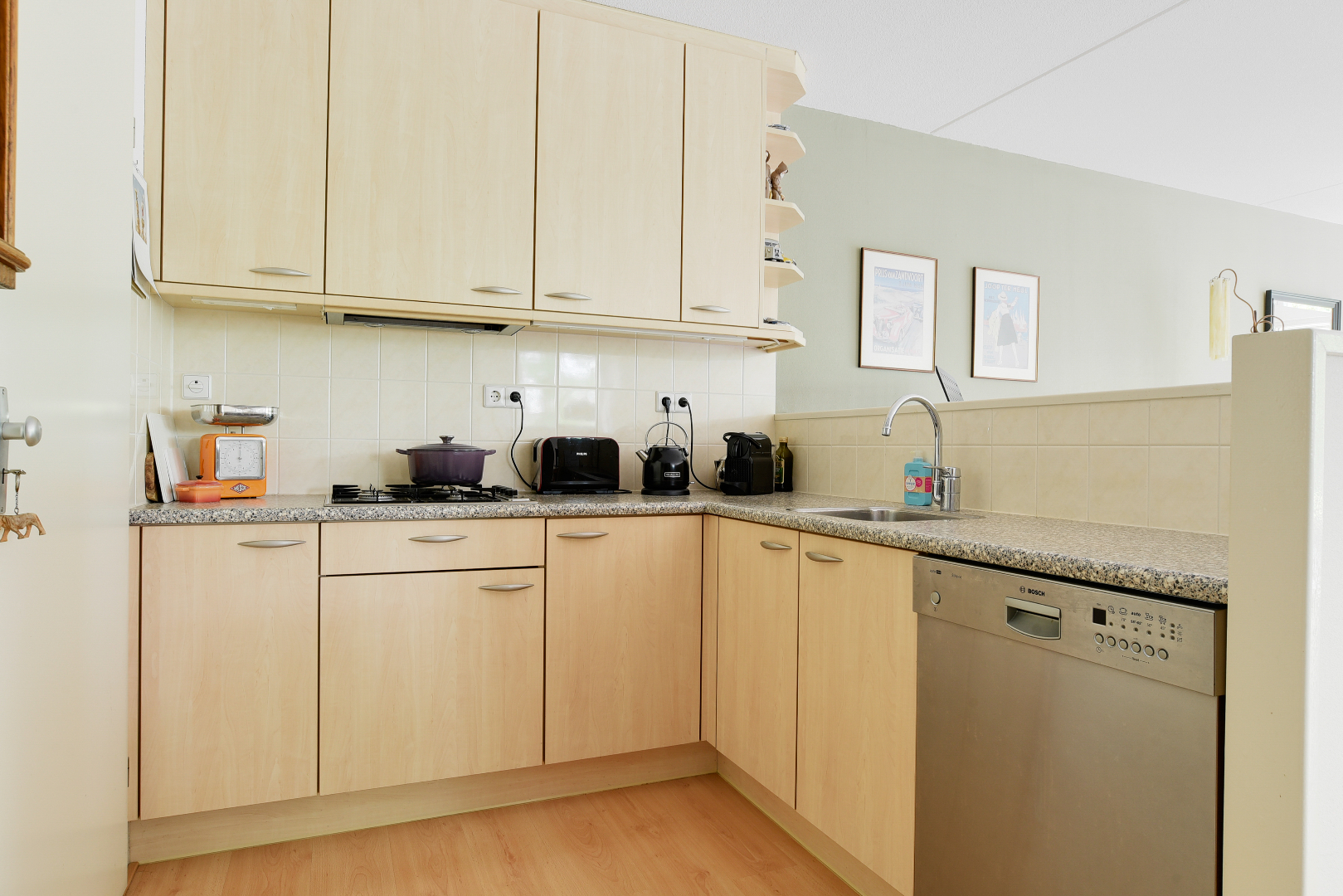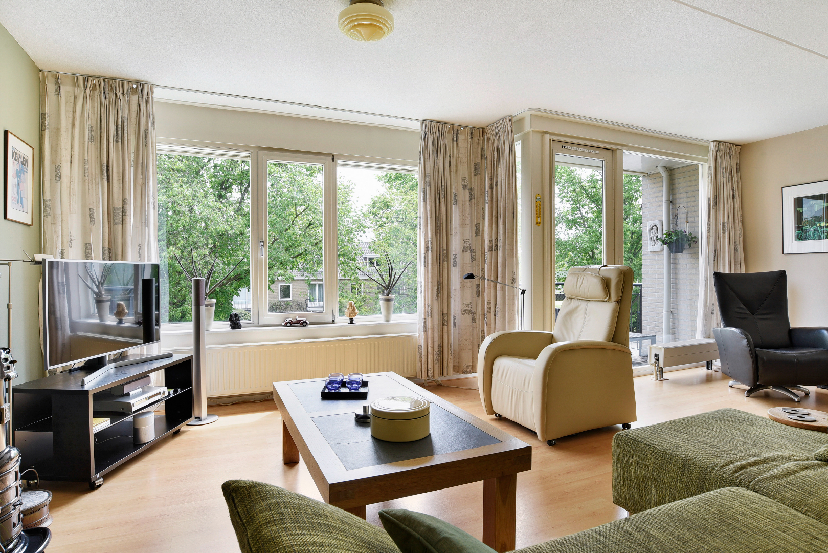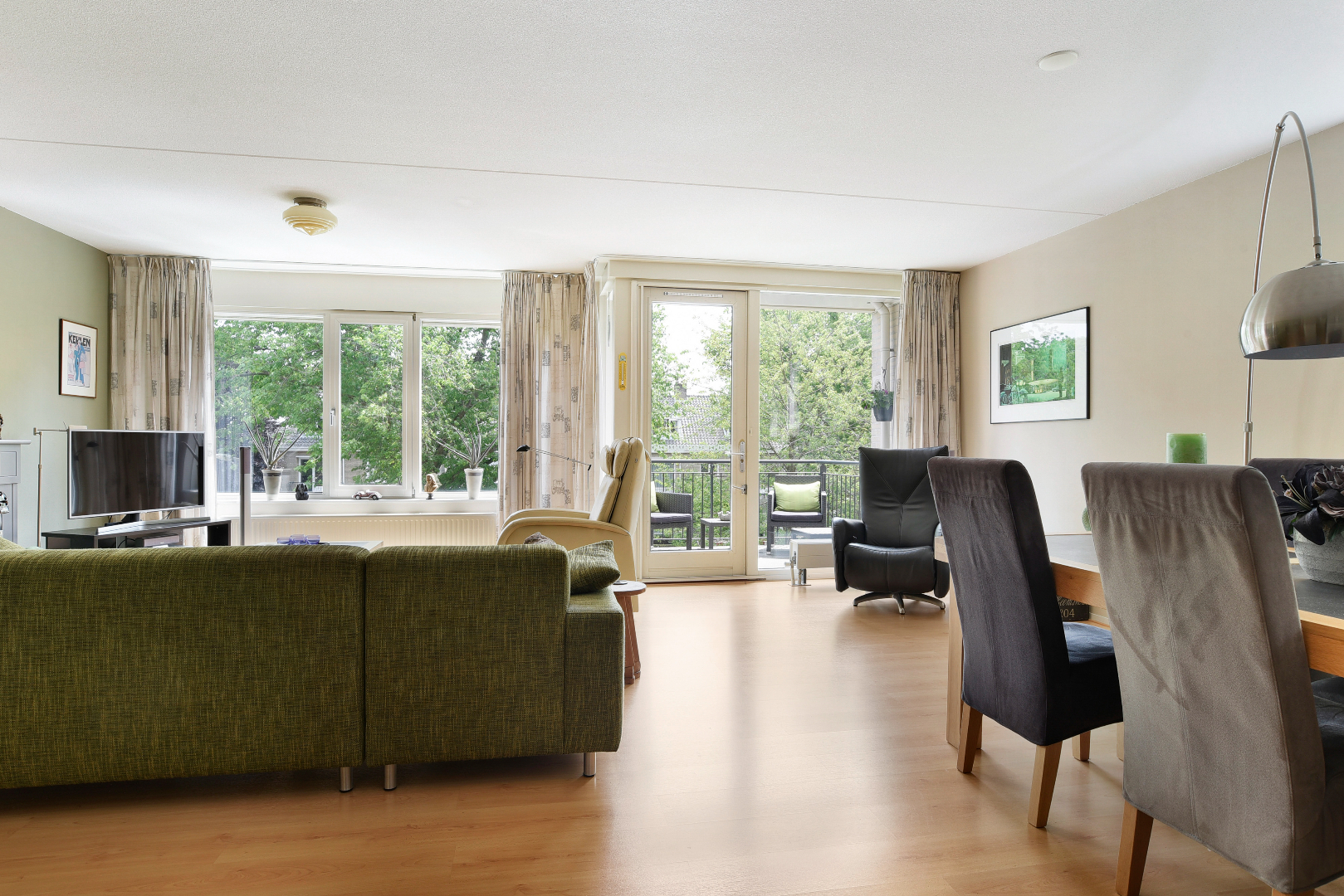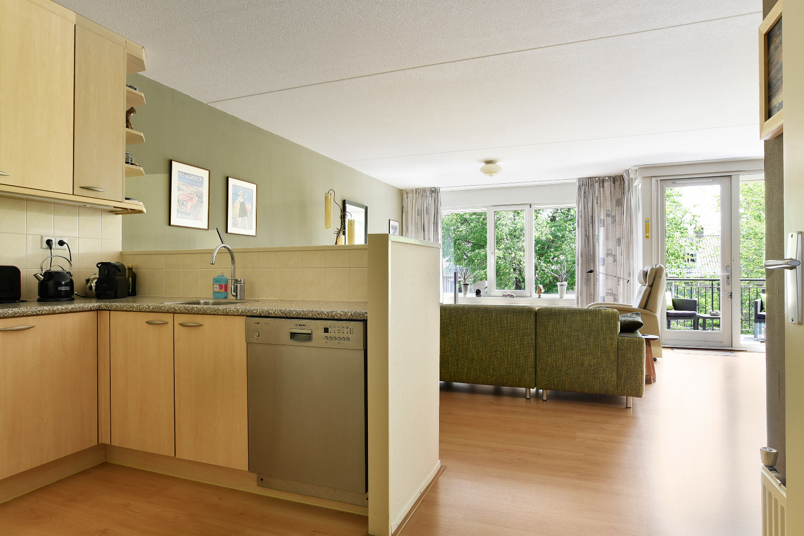 Bij binnenkomst in de woonkamer valt direct de enorme lichtinval op. De woon-eetkamer is voorzien van open keuken met van gasfornuis, wasemkap en vaatwasser. In de achtergelegen bijkeuken is voldoende ruimte voor de koel/vriescombinatie, wasmachine, en droger. Tevens bevindt zich hier de Cv-installatie met warmte terugwininstallatie. De woonkamer is voorzien van meerdere raampartijen en een ruim balkon op het zuidwesten.