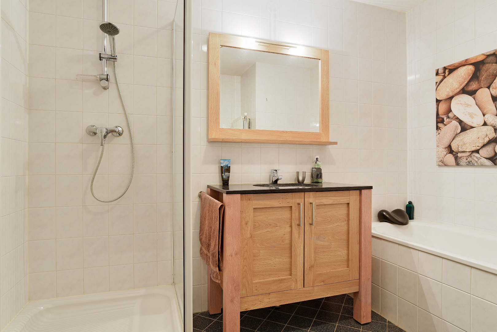 Ruime badkamer voorzien van ligbad, douche, toilet en wastafelmeubel met spiegel, en in de gang bevind zich een separaat gastentoilet.