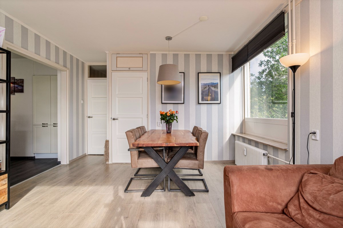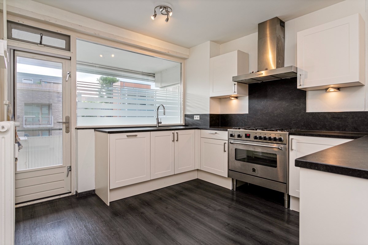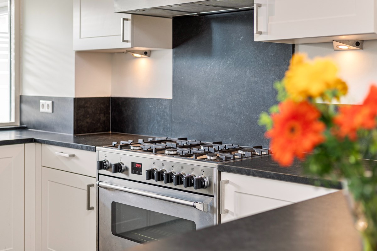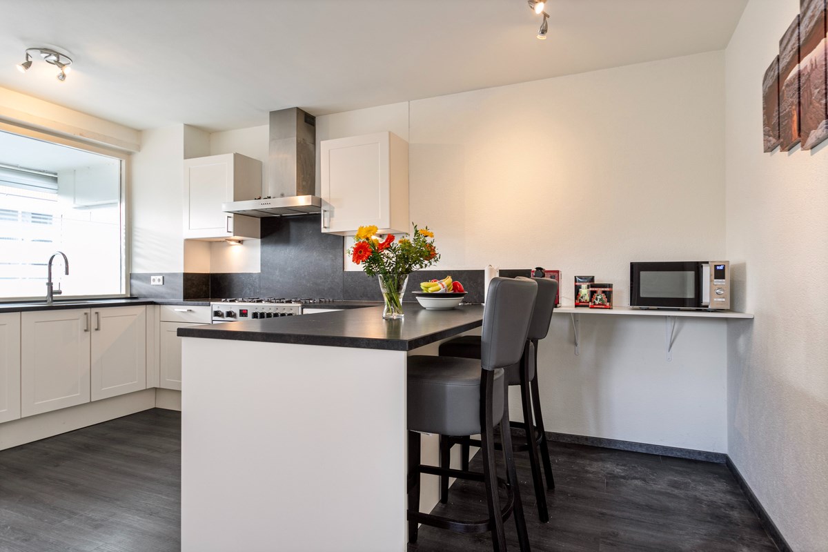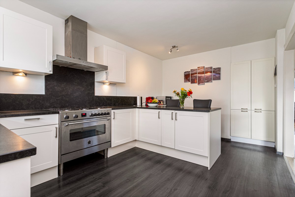 Ruime woon-/eetkamer met nette laminaatvloer, inbouwkast en veel lichtinval door een extra raam in de zijgevel, halfopen moderne keuken welke is voorzien van alle gemakken zoals een groot 6-pits gasfornuis met oven, vaatwasser, Quooker, bar en veel kastruimte.