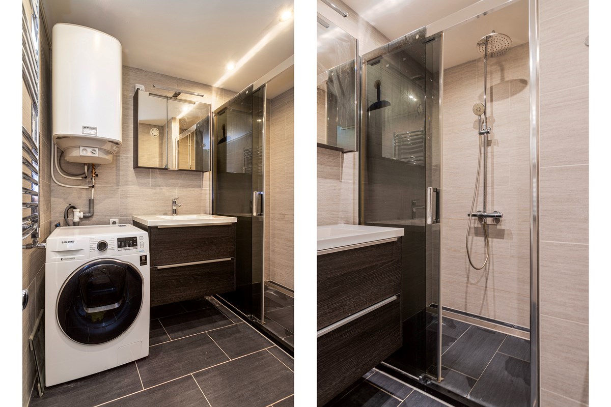 De badkamer is uitgerust met een grote inloopdouche, wastafelmeubel en opstelplaats voor de wasmachine. Grenzend aan de badkamer een separaat toilet met fonteintje.