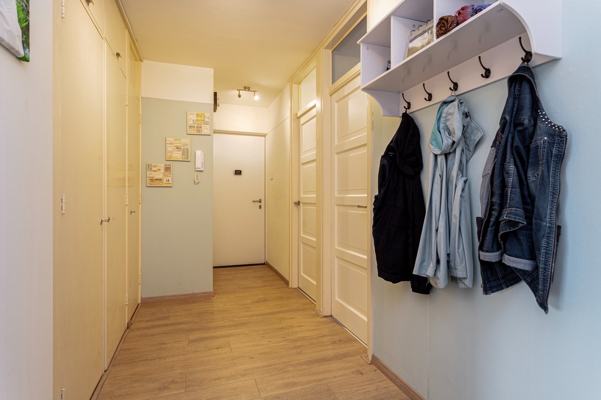 Entree appartement op de eerste verdieping, gang met meterkast, meerdere inbouwkasten en toegang tot alle vertrekken.