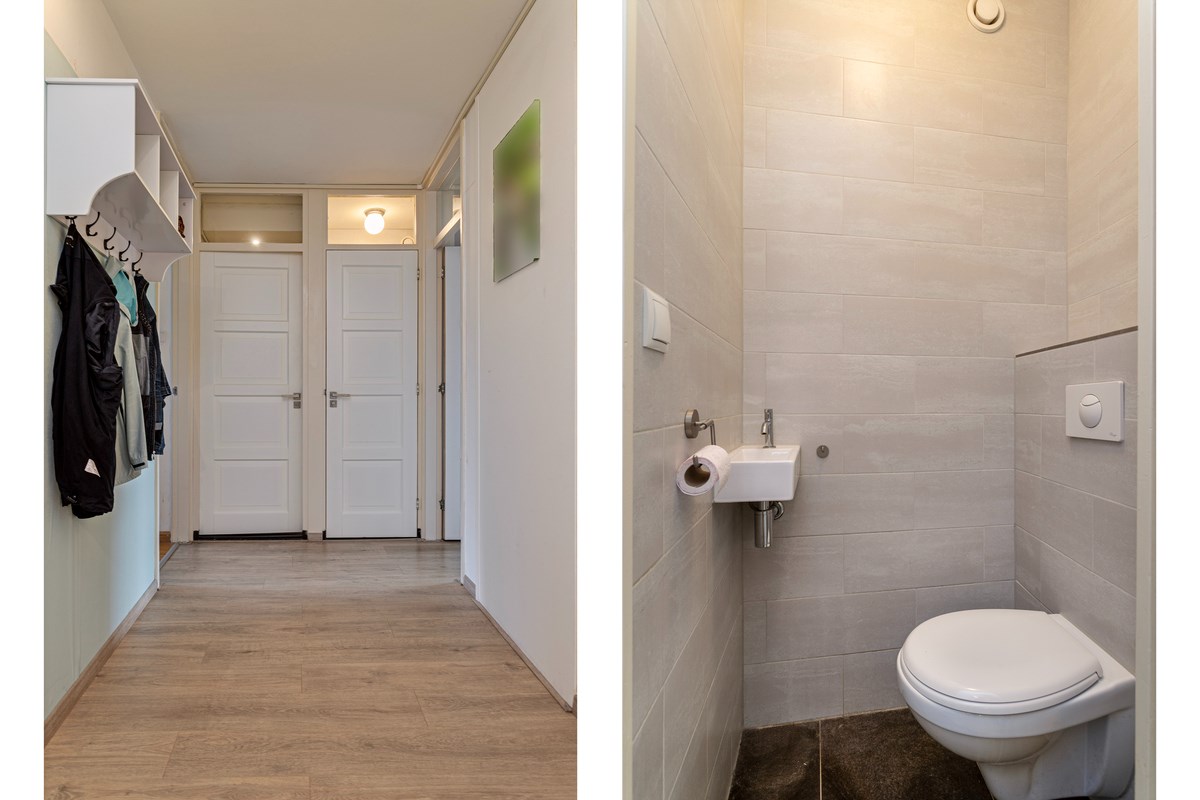 Portiek met brievenbussen en bellentableau. Afgesloten trappenhuis met lift en toegang tot de bergingen op de begane grond.