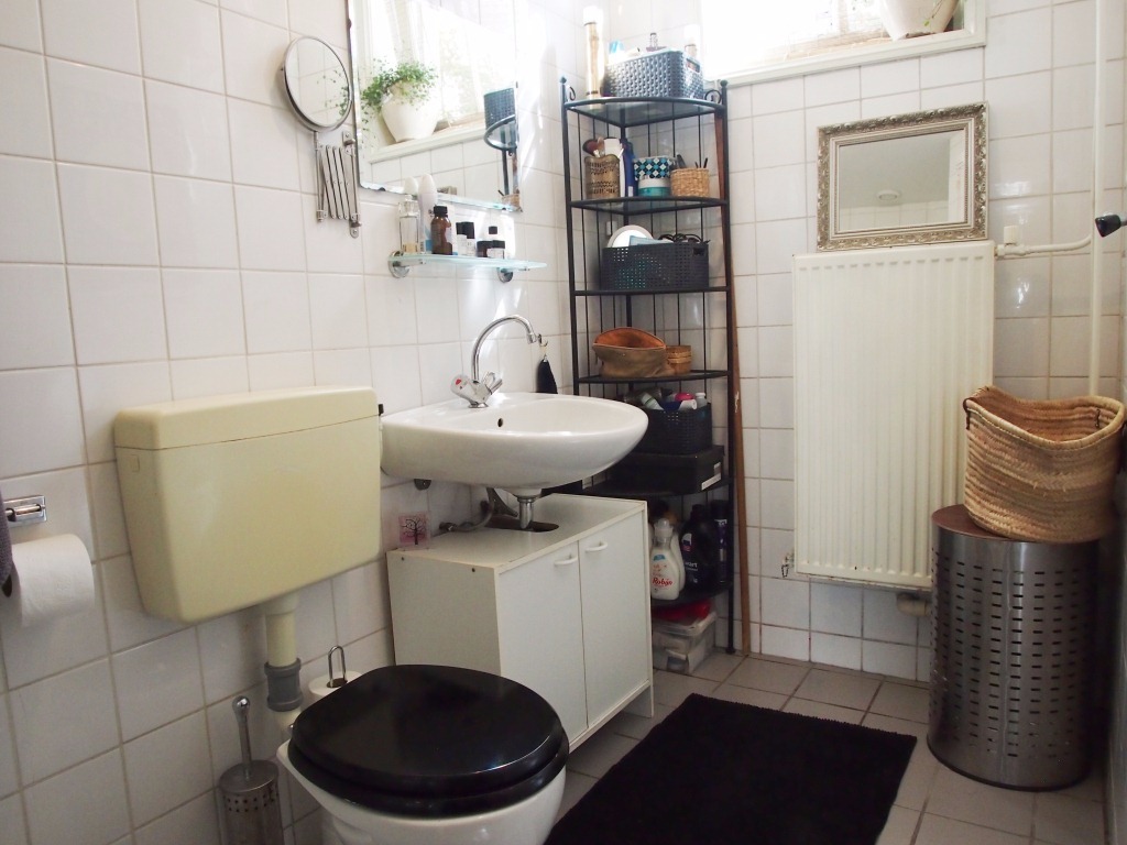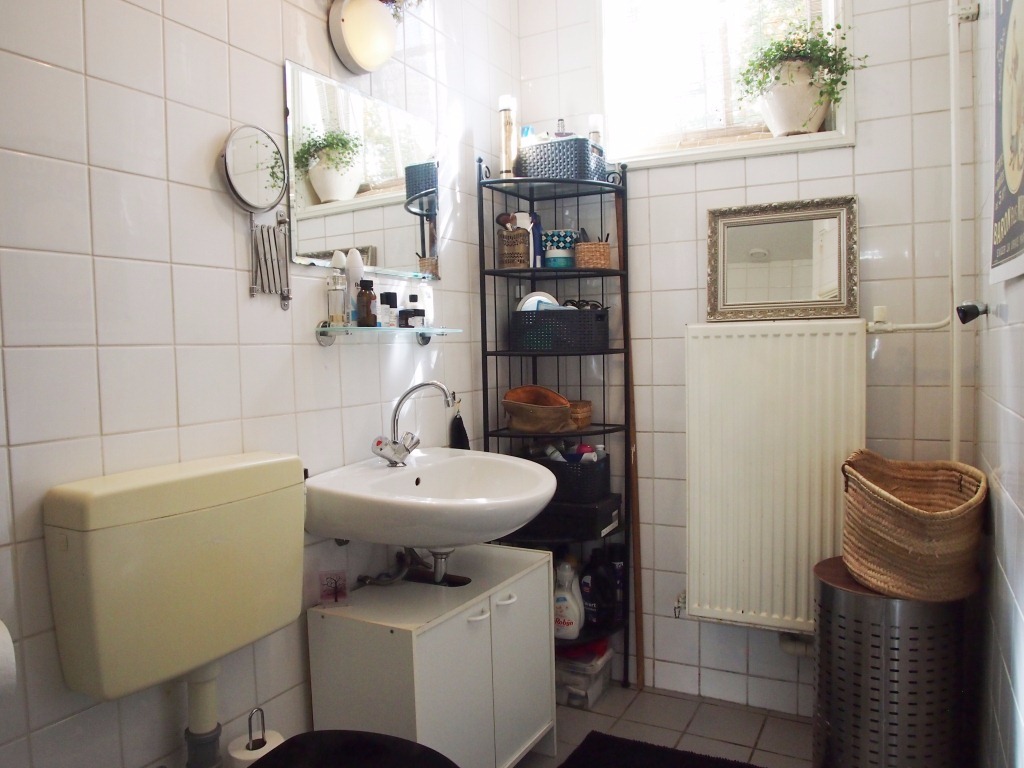 Entree, lange gemeenschappelijke hal met meterkasten en bergkast. Vanuit deze hal heeft u toegang tot het appartement (begane grond). Woon/eetkamer (ca. 18 m2) voorzien van laminaatvloer, klassieke schuiframen (enkel glas) en open keuken. Naast de keuken bevindt zich een tussenhal met ruime bergkast en toegang tot de slaapkamer (ca. 8 m2) gelegen aan de achterzijde en voorzien van laminaatvloer, opstalplaats cv-installatie en kastruimte. Badkamer (ca. 3,5 m2 voorzien van douche, toilet, wastafel en opstalplaats wasmachine (en droger).