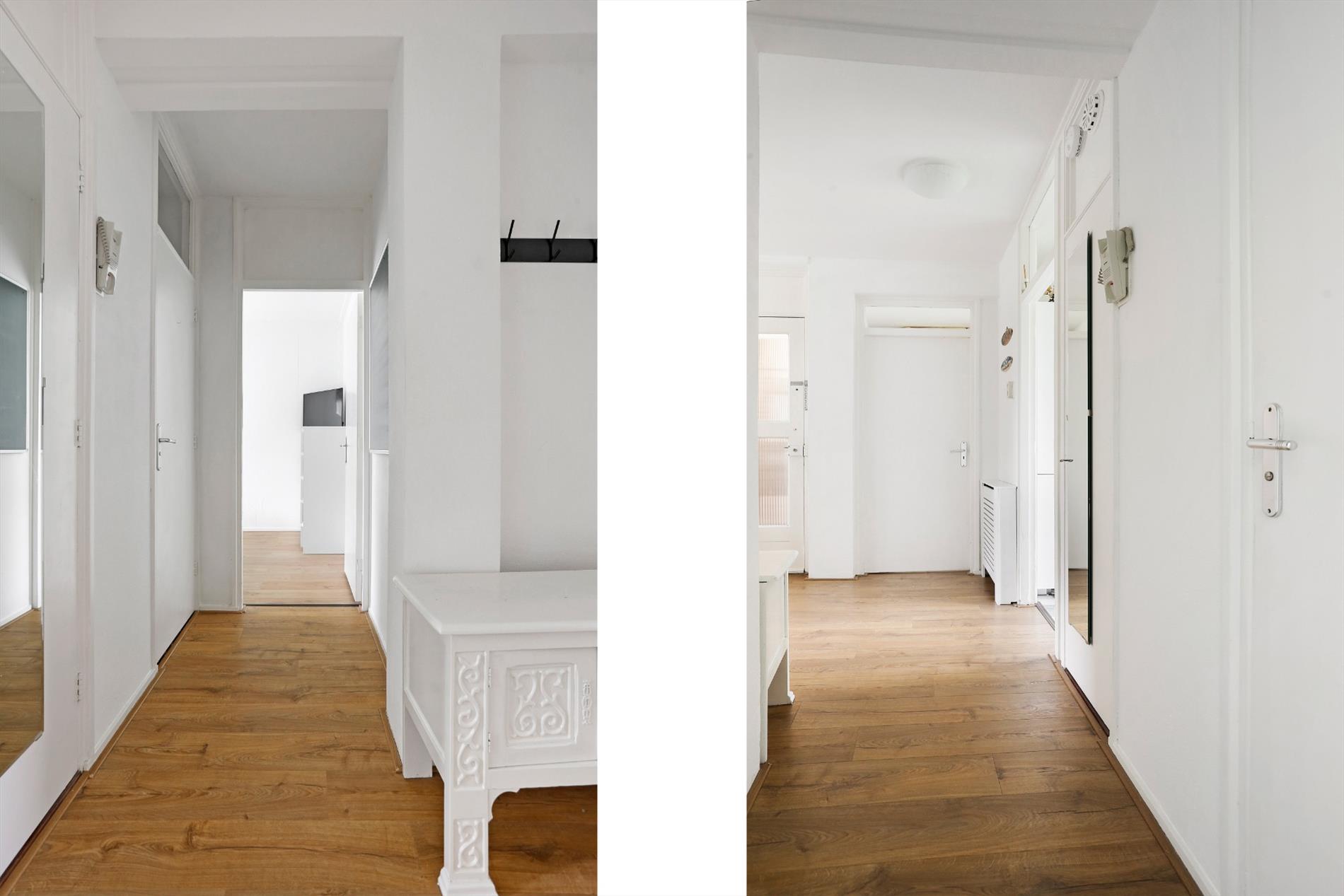 Entree appartement op de eerste woonlaag, hal met garderobe, meterkast, toilet en toegang tot alle overige vertrekken. Lichte doorgebroken woon- eetkamer met grote raampartijen en toegang tot het balkon op de ochtendzon. Moderne wit met antracietgrijze keuken voorzien van diverse inbouwapparatuur, vanuit de keuken heeft u toegang tot het balkon aan de achterzijde met trapje naar de gemeenschappelijke tuin. Vanuit de keuken heeft u tevens toegang tot de nette badkamer met douche en wastafelmeubel. De twee slaapkamers hebben een goede afmeting en liggen beide aan de achterzijde van het appartement.