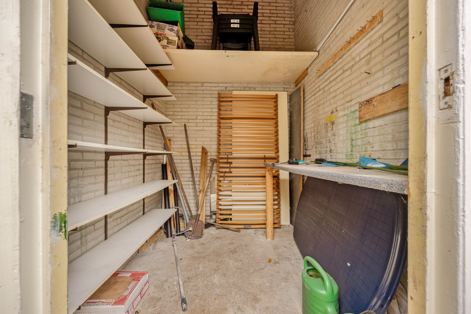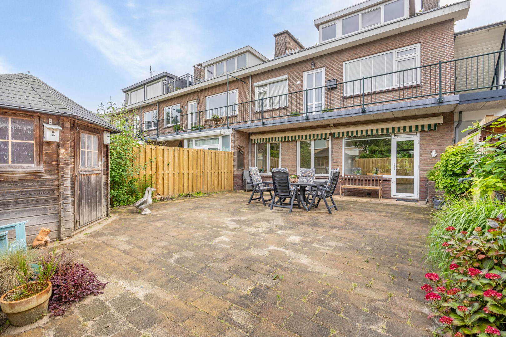 - Houten berging in de achtertuin (met elektra-aansluiting) en stenen berging achter