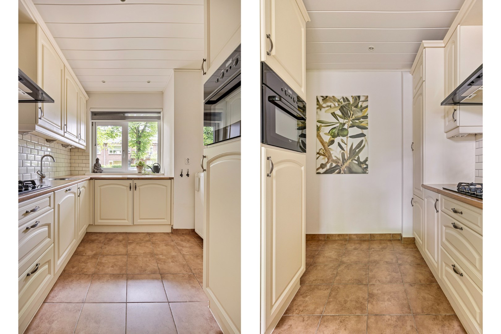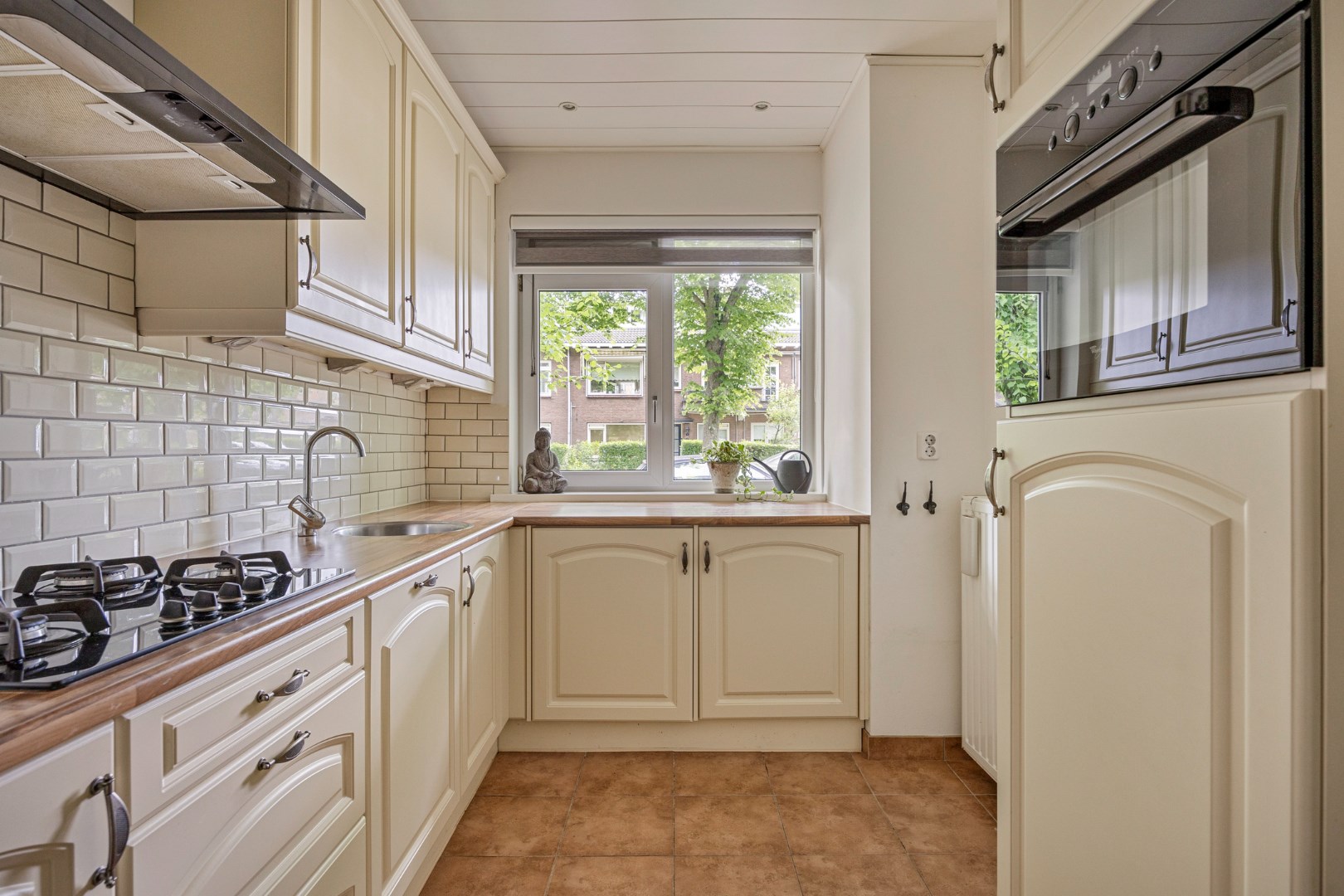 De keuken bevindt zich aan de voorzijde en is voorzien van gasfornuis met afzuigkap, koelkast met vriesvak en opstelplaats voor vaatwasser, wasmachine en droger.