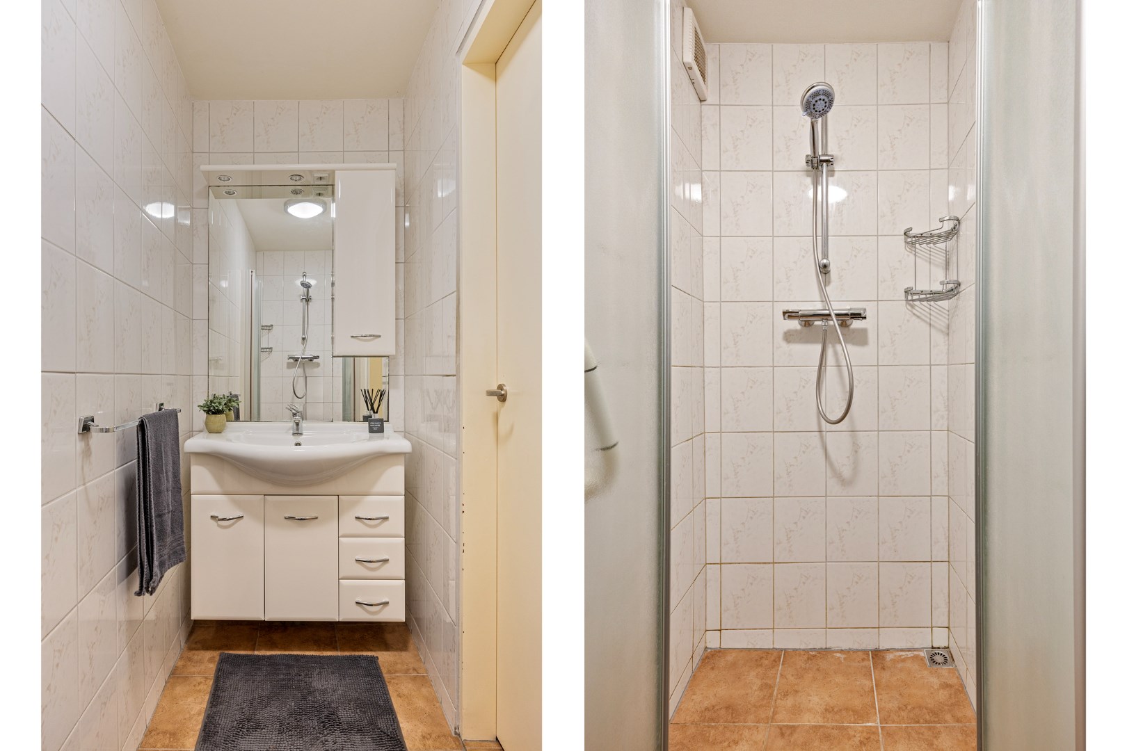 Badkamer heeft een douche en wastafel met meubel en bovenkast met spiegel. Er is een separaat (zwevend) toilet.