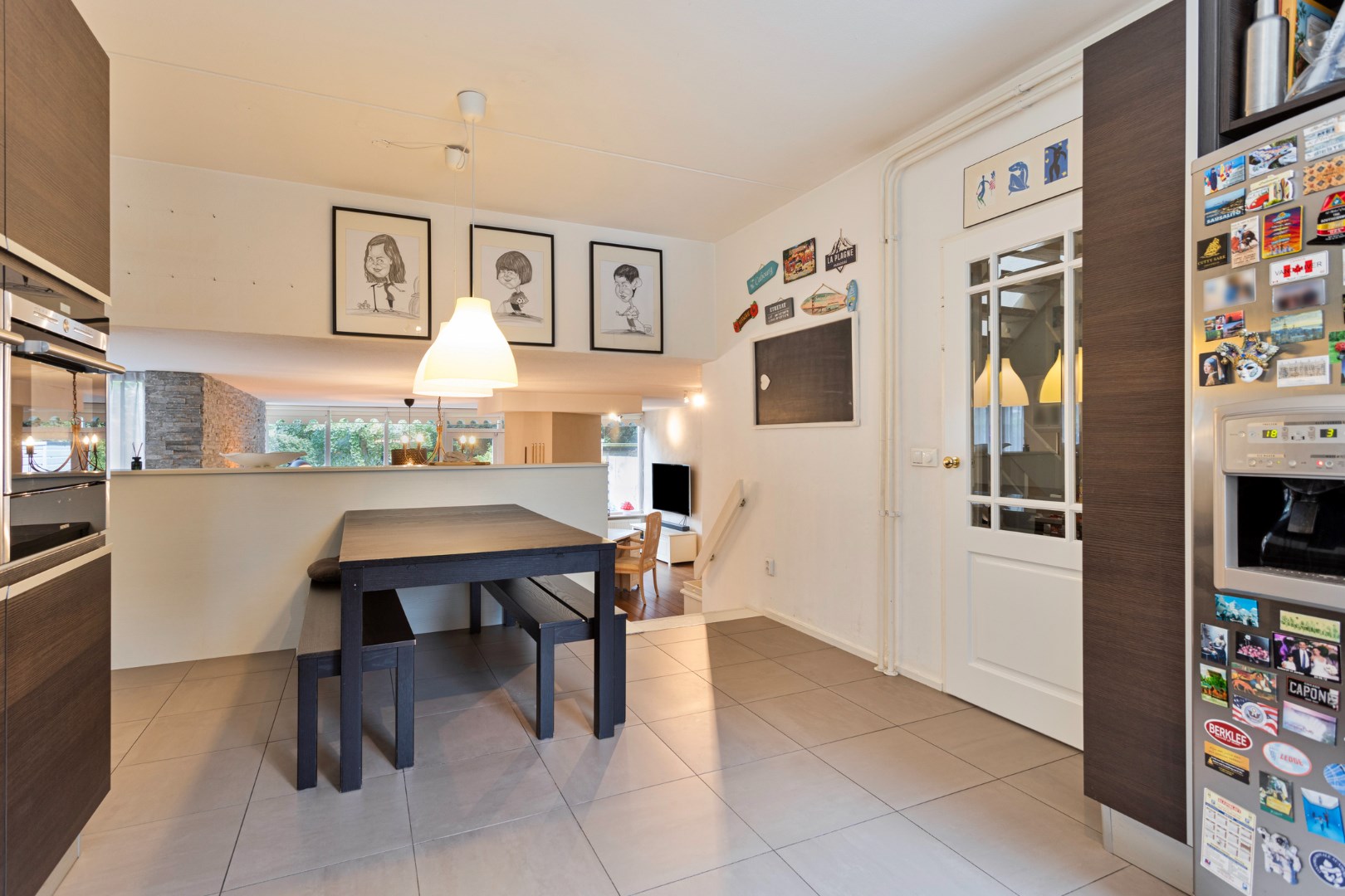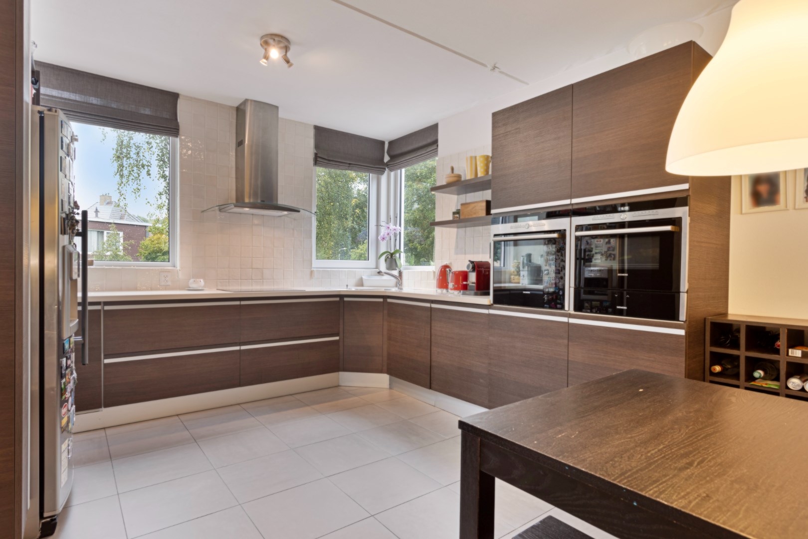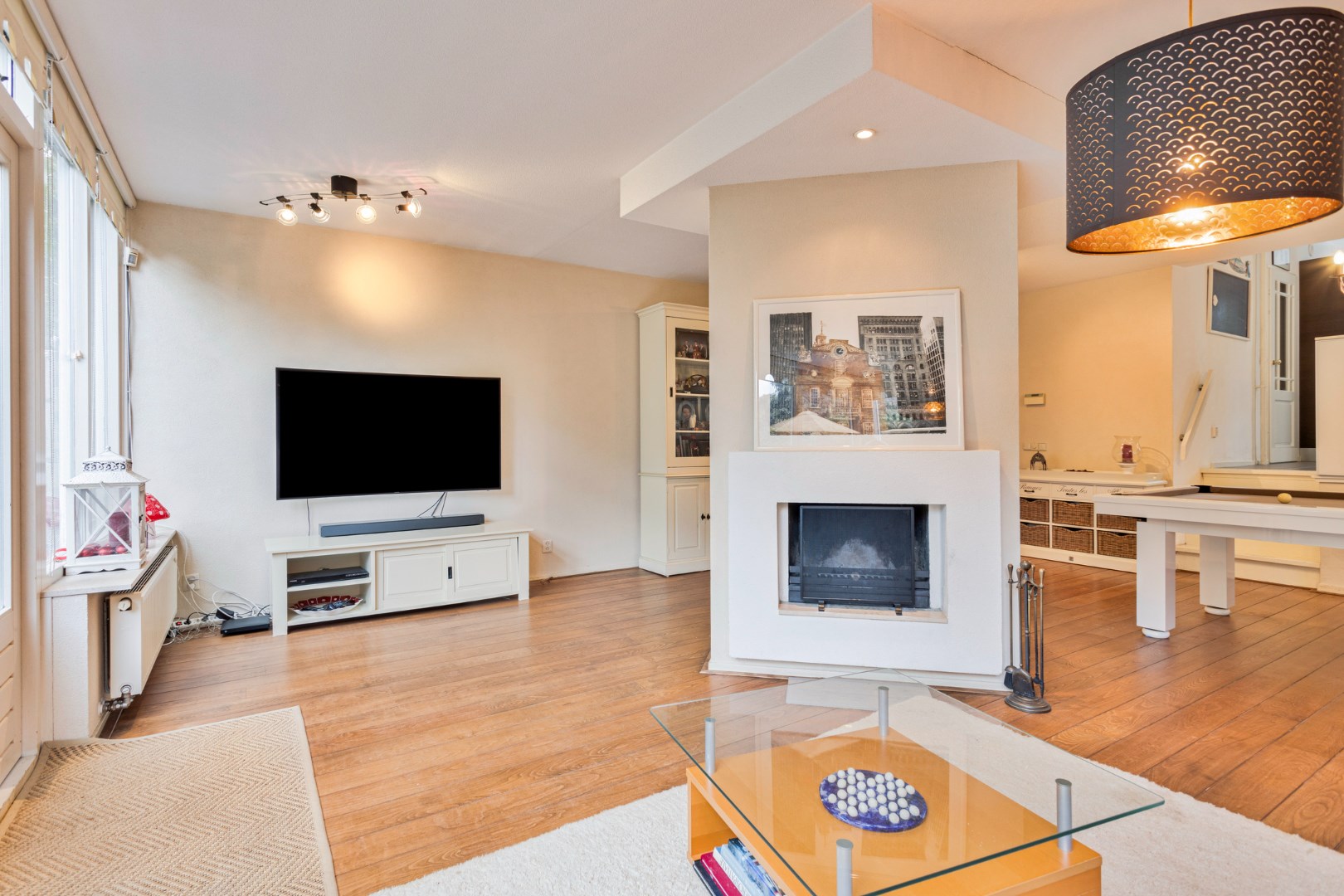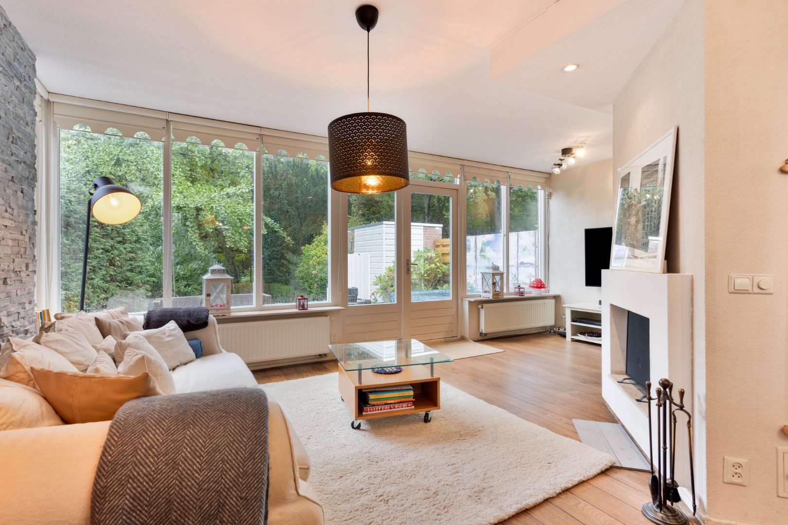 The cozy living room with fireplace has a large window that overlooks the garden at the back of the house. The adjacent and higher situated spacious kitchen is equipped with various built-in appliances and underfloor heating, and offers enough space for a large dining table. Through the patio doors in the living room, you can access the terrace, and the deep backyard offers the possibility to create a nice play area for children, for example.