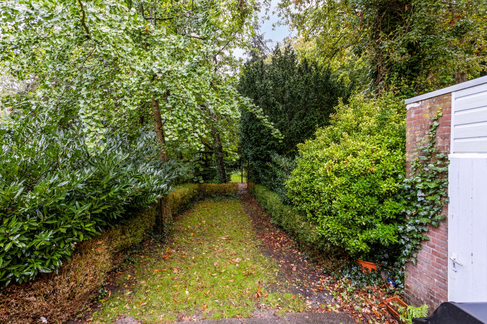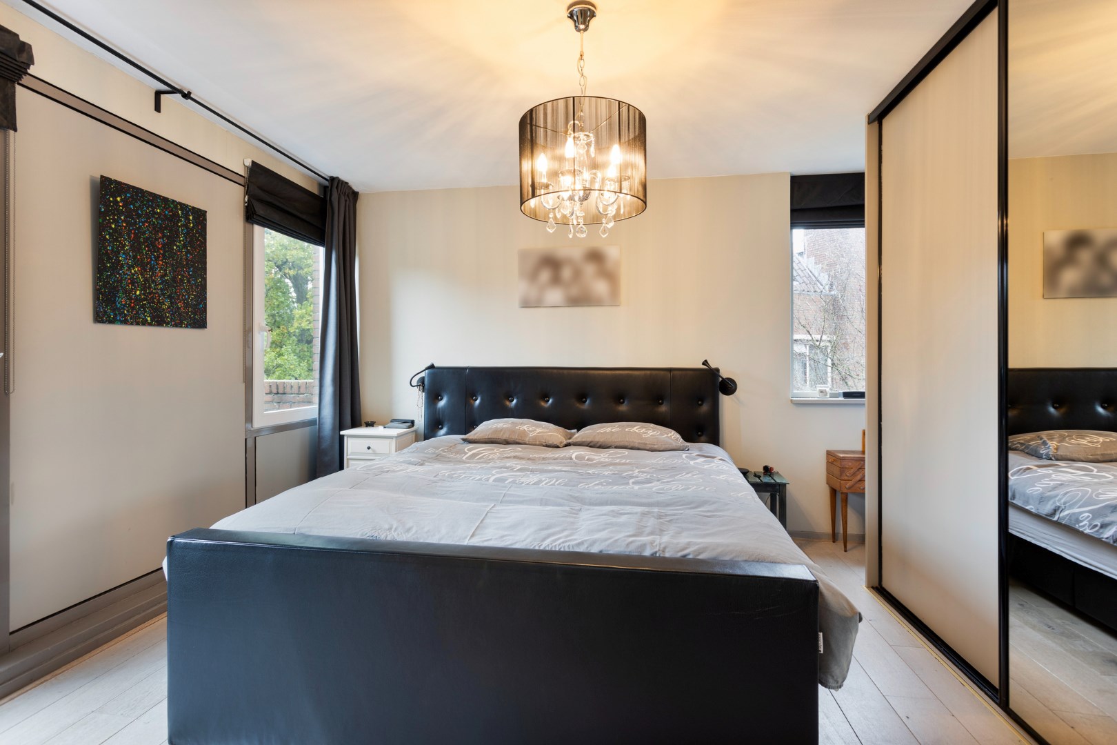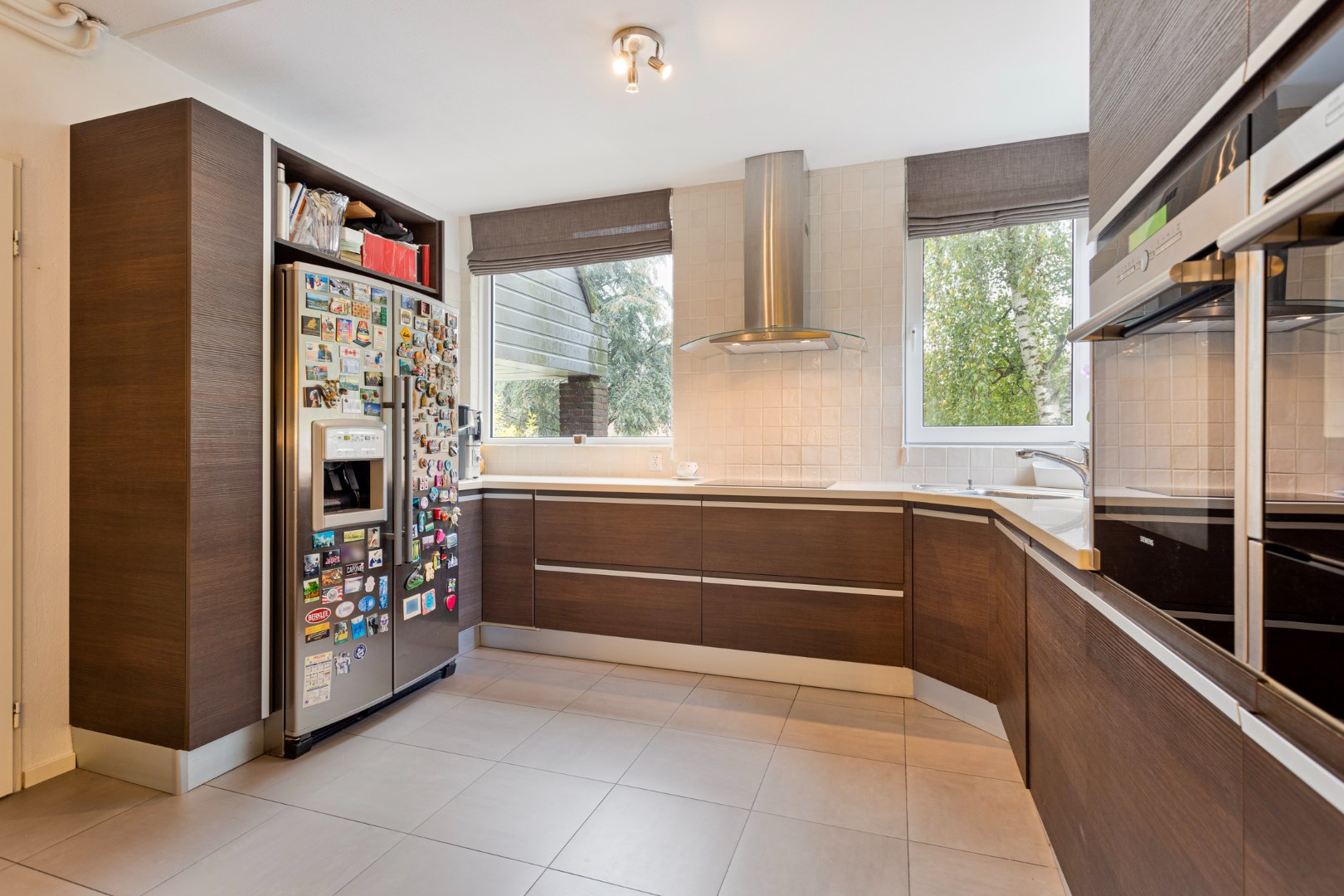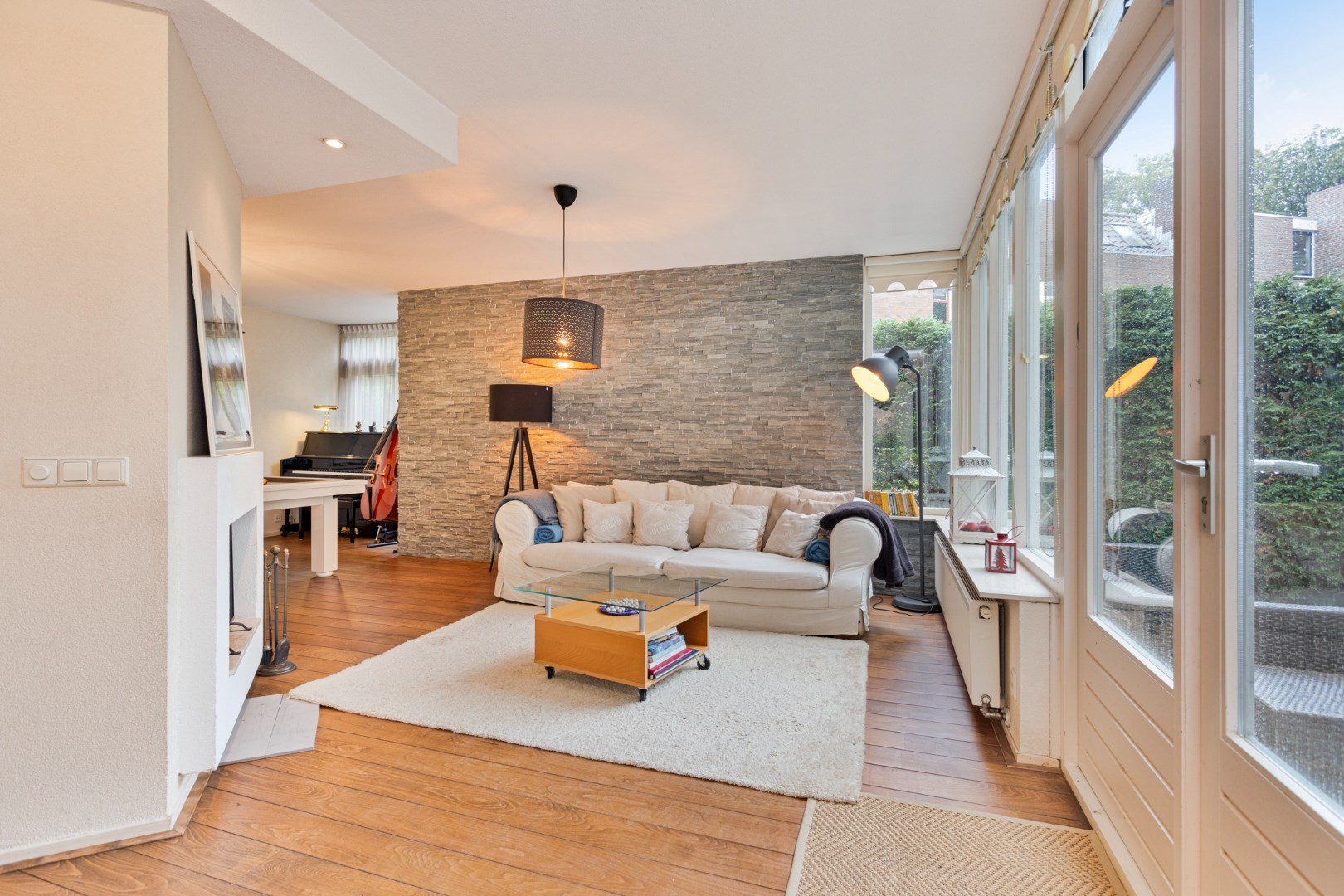 The cozy living room with fireplace has a large window that overlooks the garden at the back of the house. The adjacent and higher situated spacious kitchen is equipped with various built-in appliances and underfloor heating, and offers enough space for a large dining table. Through the patio doors in the living room, you can access the terrace, and the deep backyard offers the possibility to create a nice play area for children, for example.
