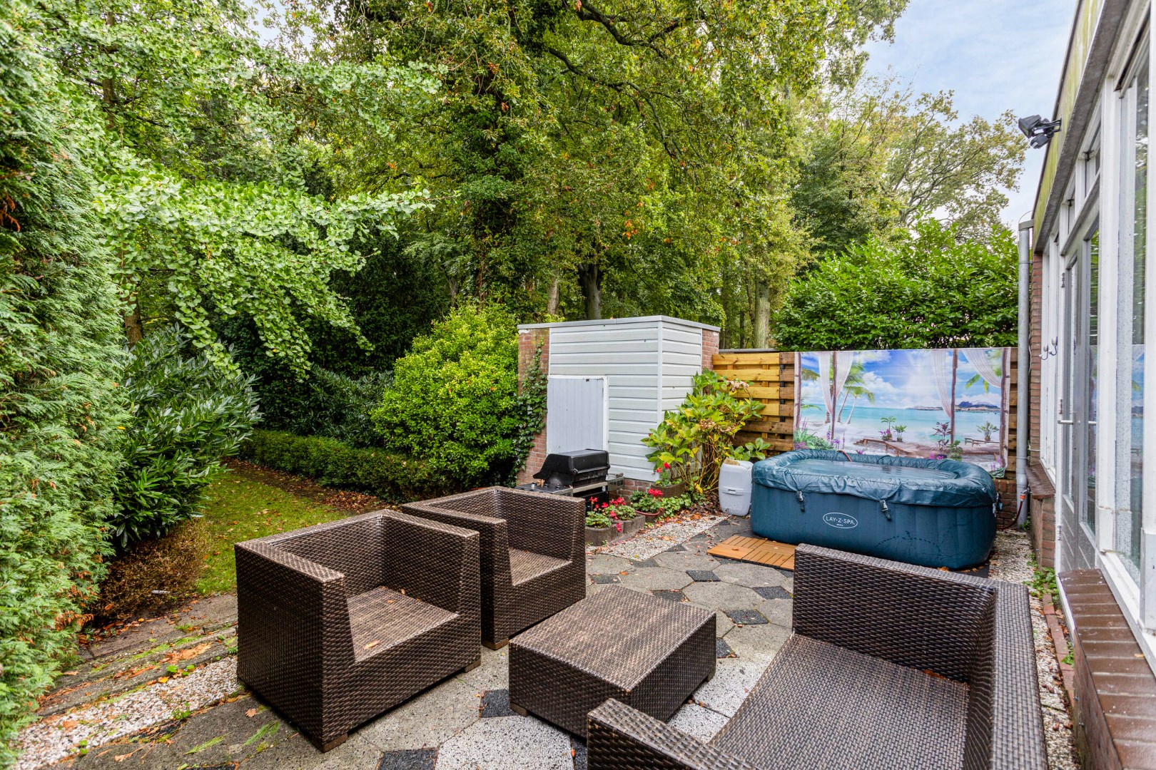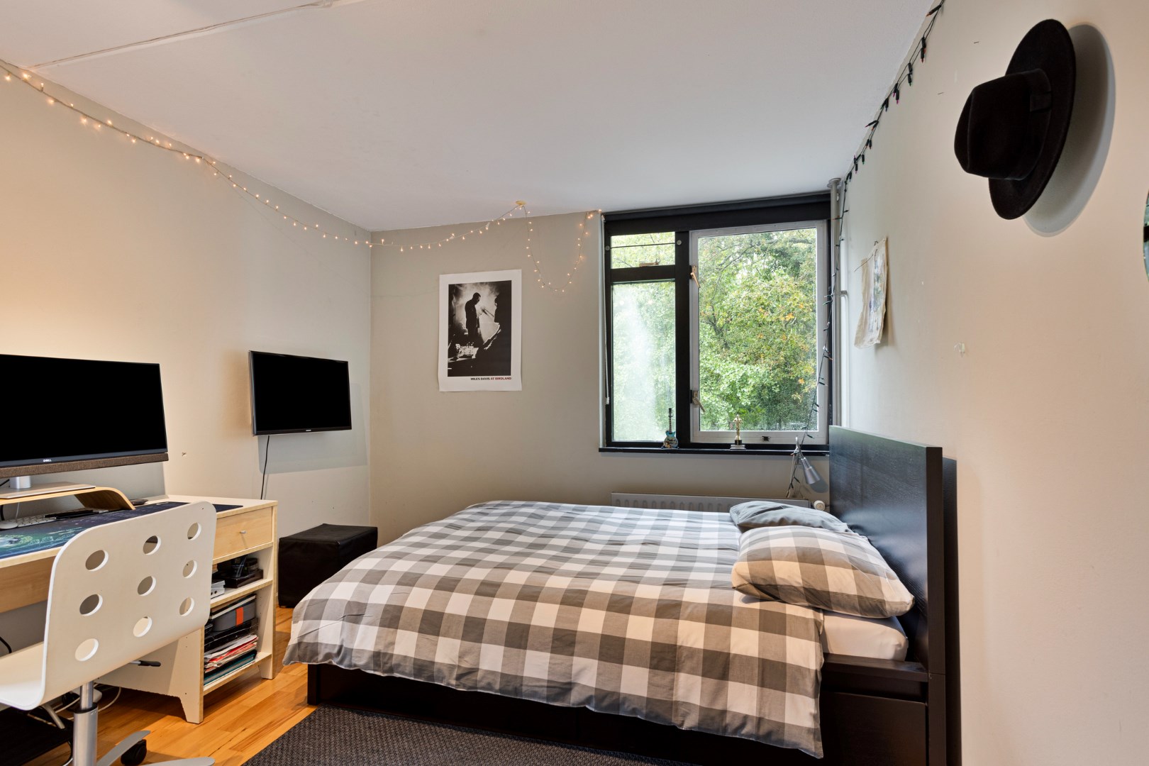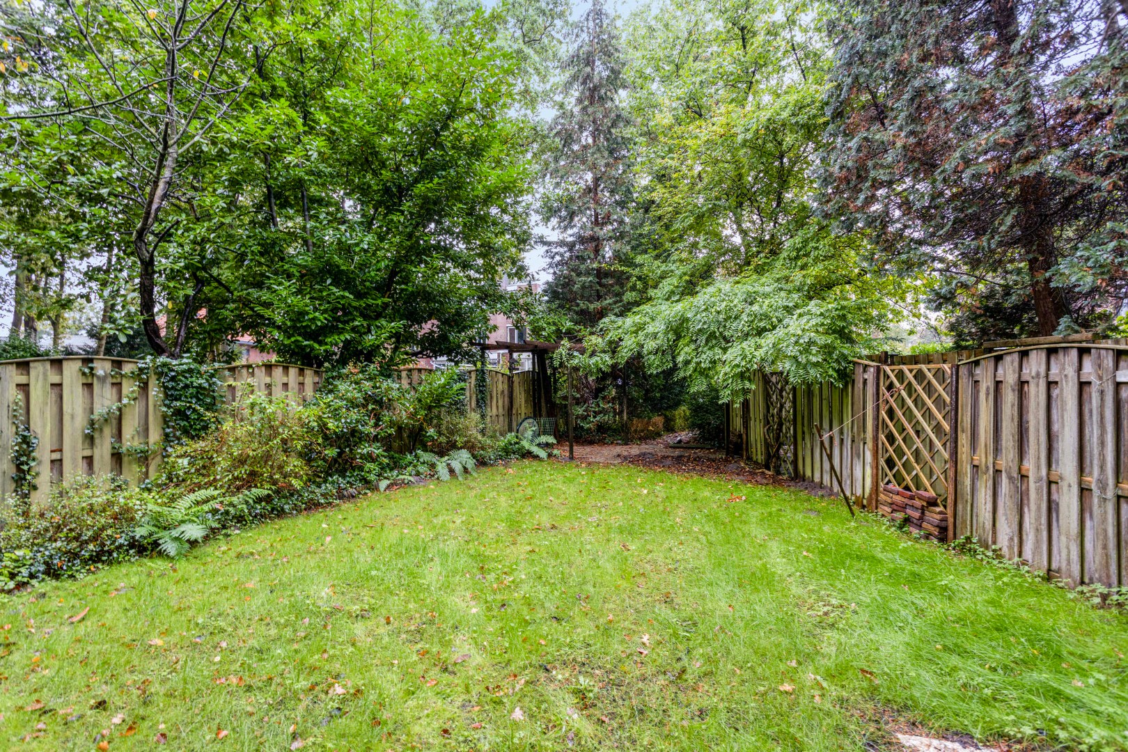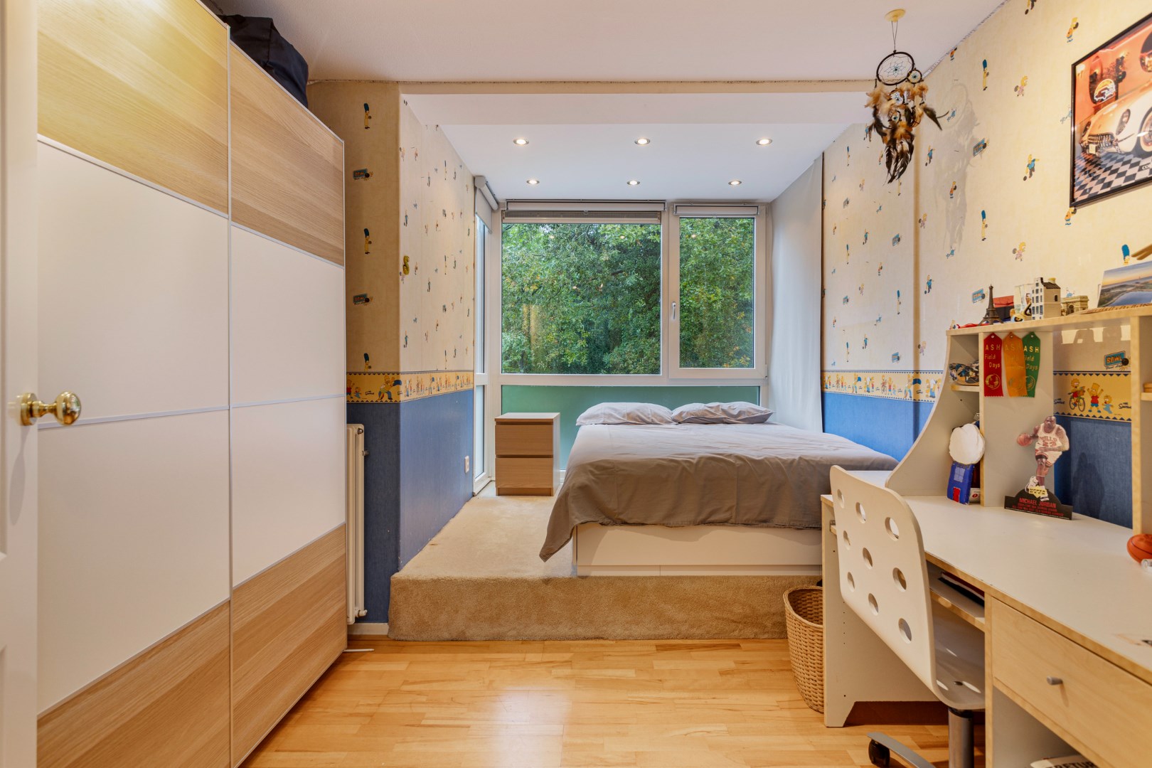 The cozy living room with fireplace has a large window that overlooks the garden at the back of the house. The adjacent and higher situated spacious kitchen is equipped with various built-in appliances and underfloor heating, and offers enough space for a large dining table. Through the patio doors in the living room, you can access the terrace, and the deep backyard offers the possibility to create a nice play area for children, for example.