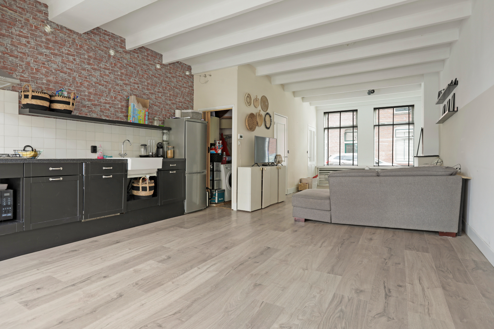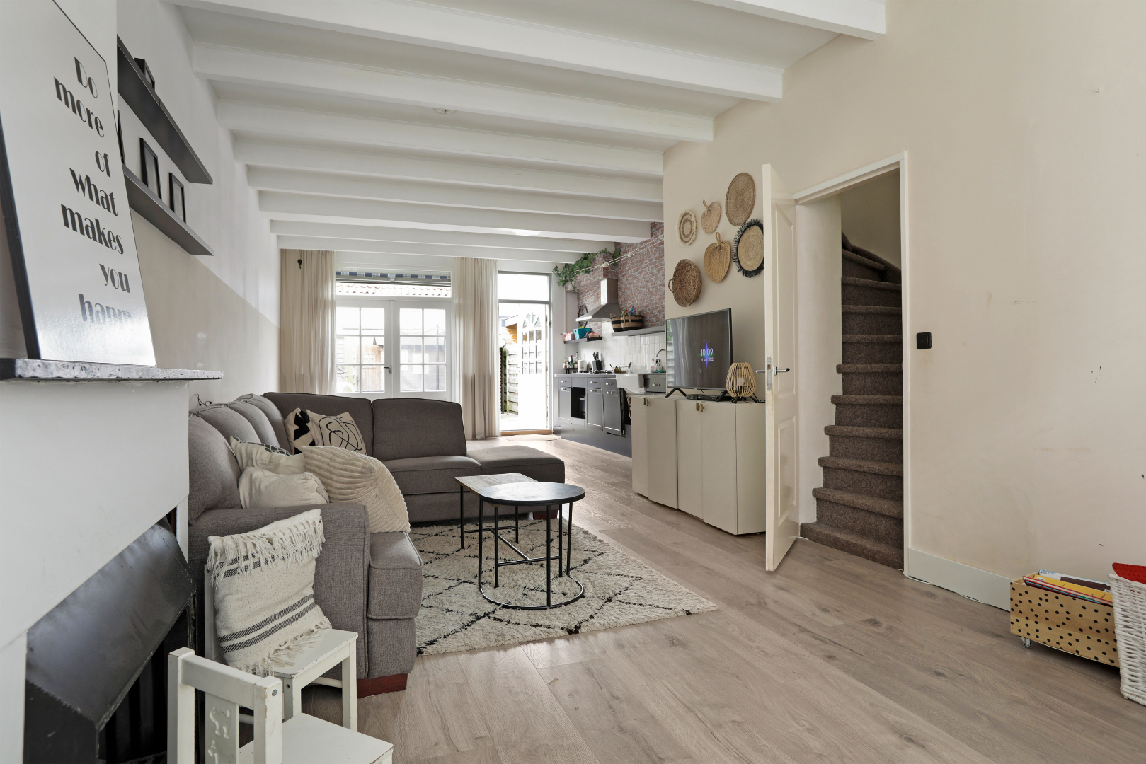 Entree, hal met toilet voorzien van fonteintje, ruime uitgebouwde woon/kamer met openhaard, open keuken en kast onder de trap met wasmachine en droger opstelling. De gehele ruimte is voorzien van een nette laminaatvloer en de balken in het plafond geven een sfeervolle uitstraling. Via de openslaande deuren aan de achterzijde of de enkele loopdeur heeft u toegang tot de zonnige achtertuin (zuidwest) met houtenschuur en achterom.