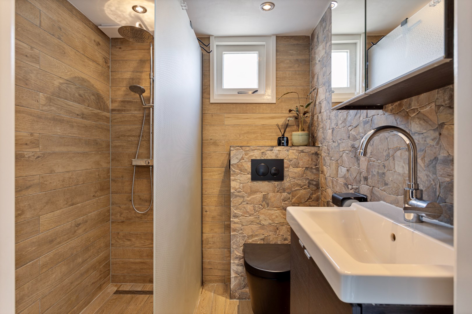 De badkamer is in 2019 gerenoveerd en is voorzien van een inloopdouche, wastafel, toilet en elektrische vloerverwarming.
