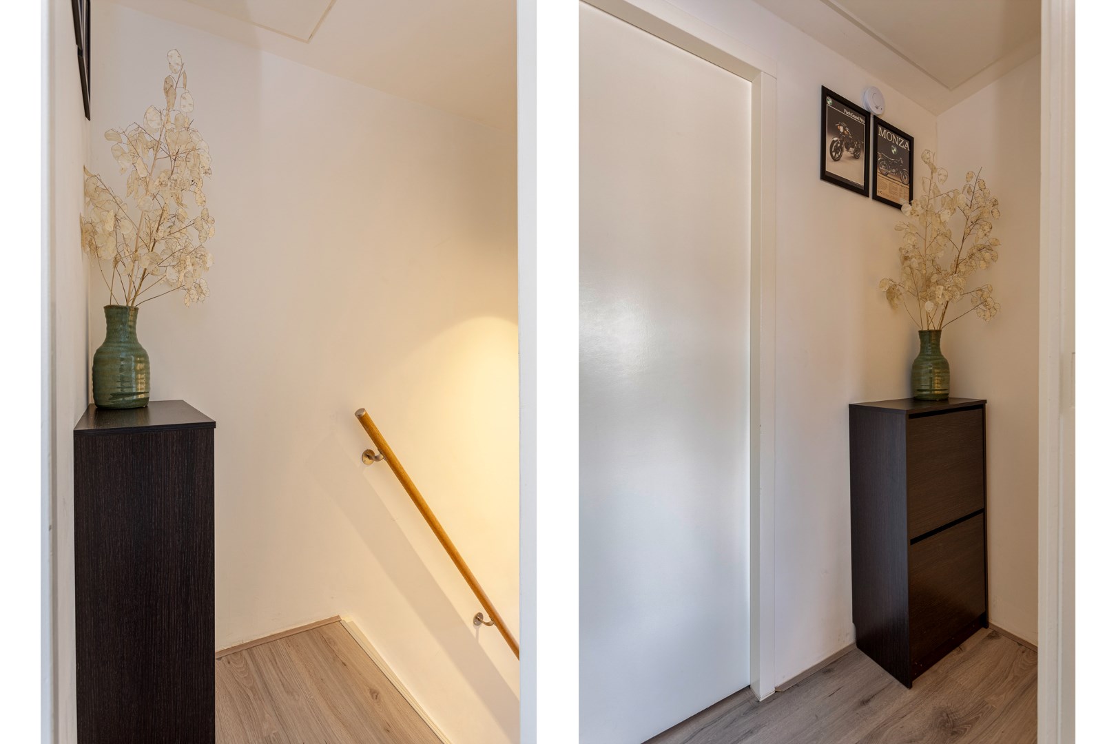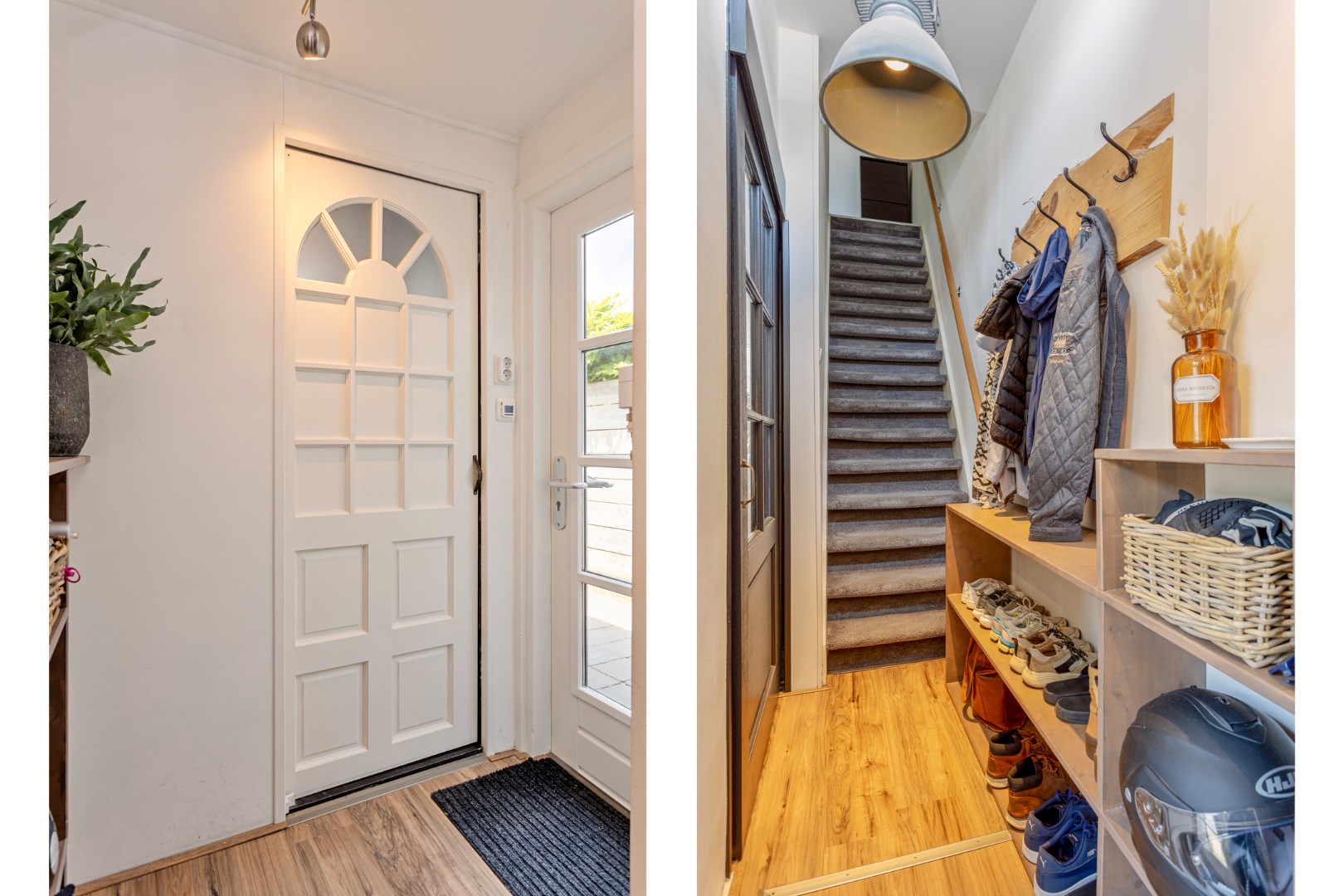 Entree aan de achterzijde van de woning, hal met garderobe en toegang tot het woongedeelte, de badkamer en de trap naar de 1e verdieping.