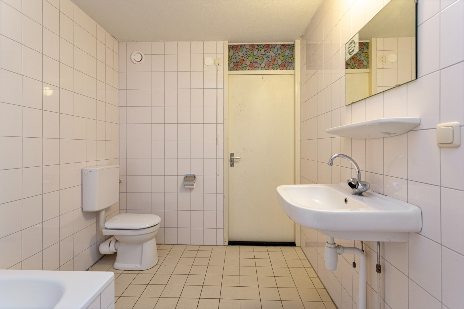 De ruime badkamer is voorzien van een toilet, wastafel, bad en opstelplaats voor wasmachine en droger.