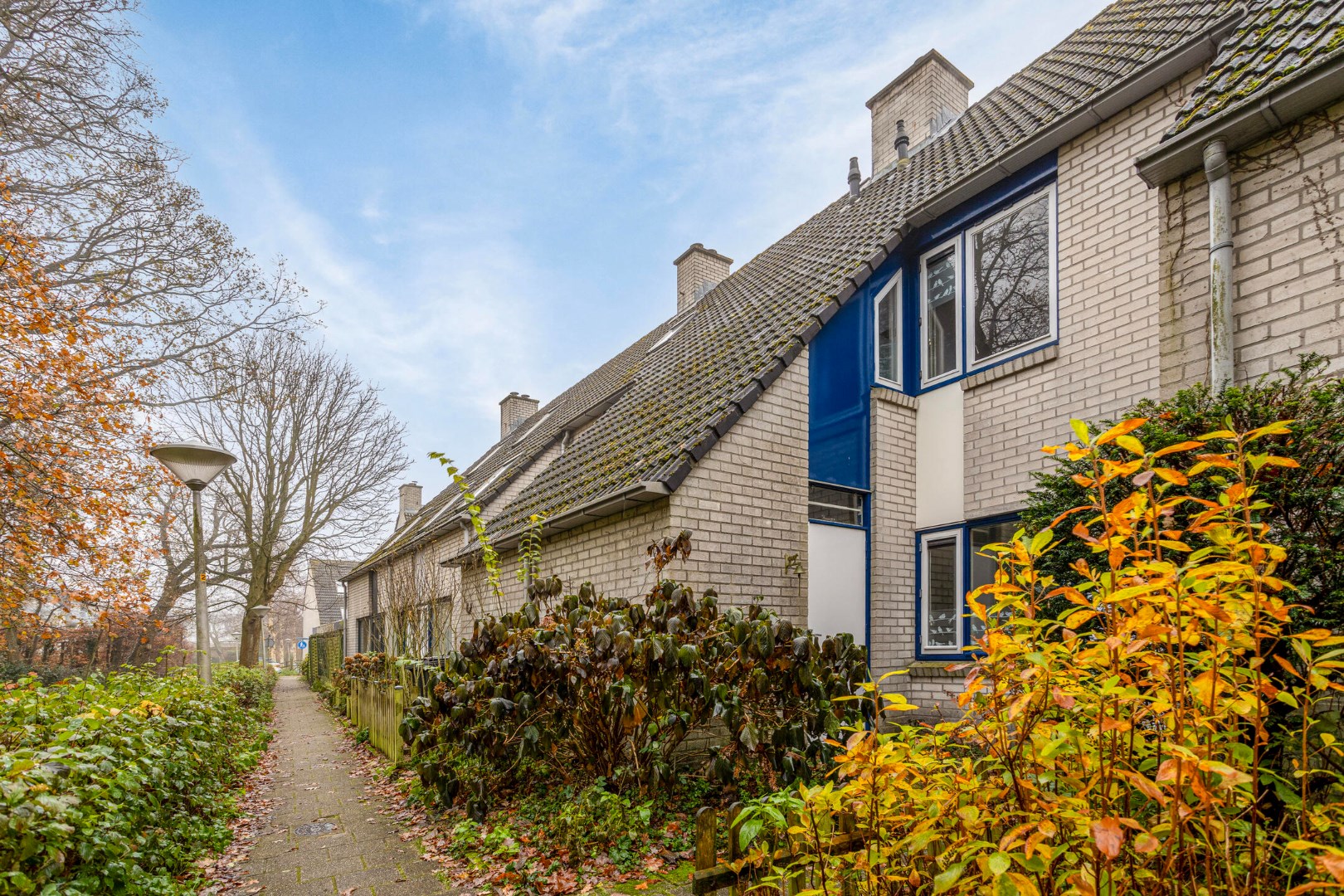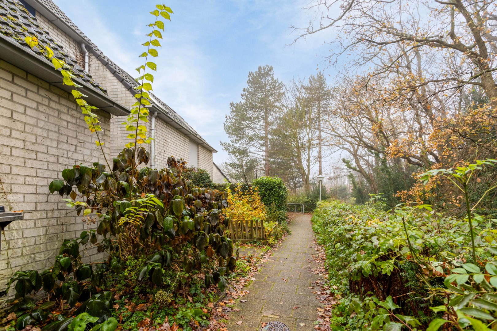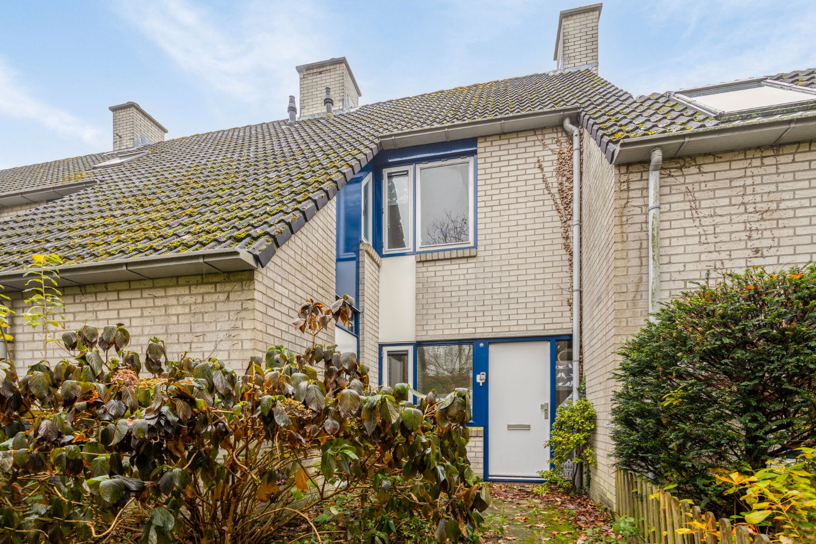 Voortuin met aan de woning aangebouwde stenen berging.