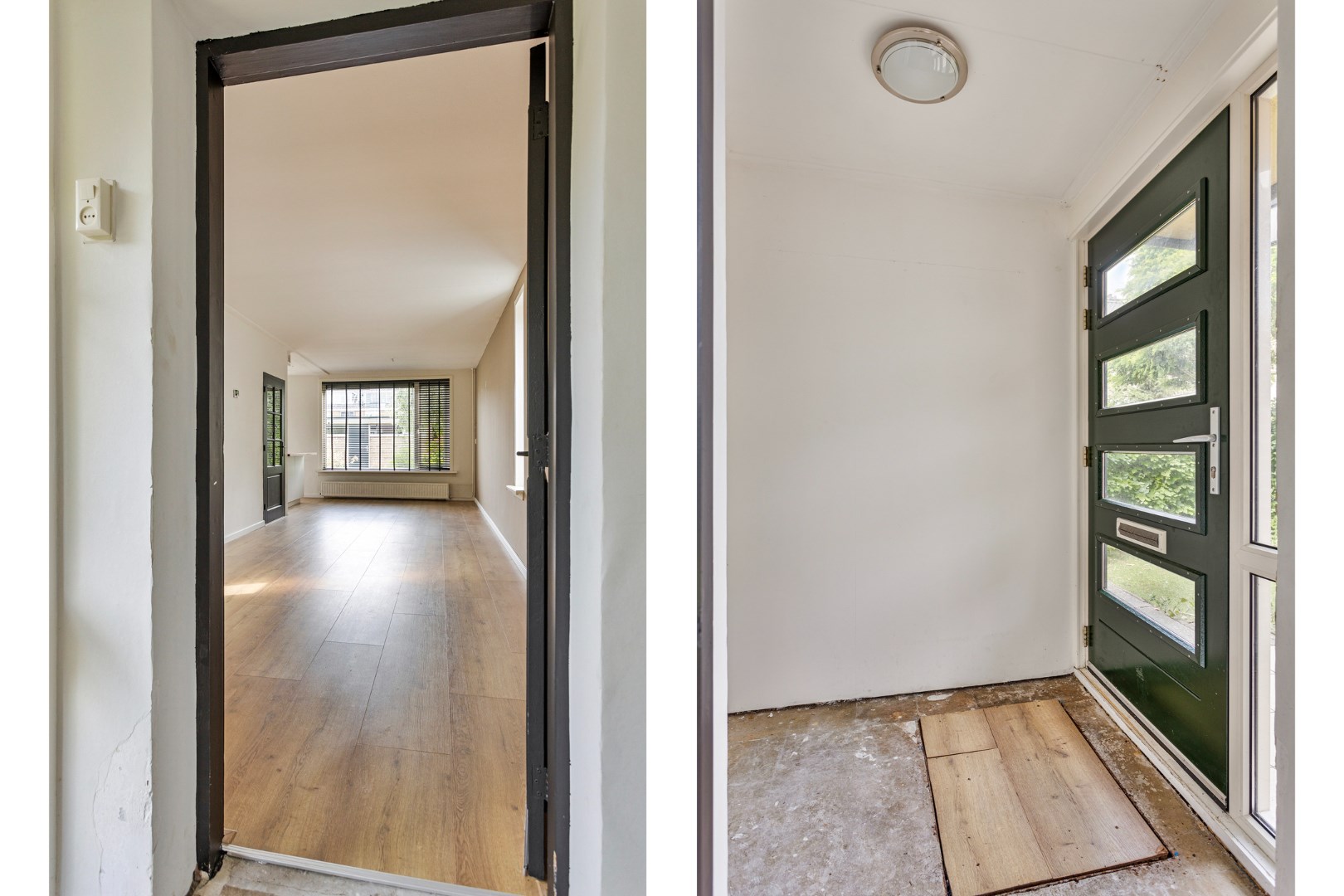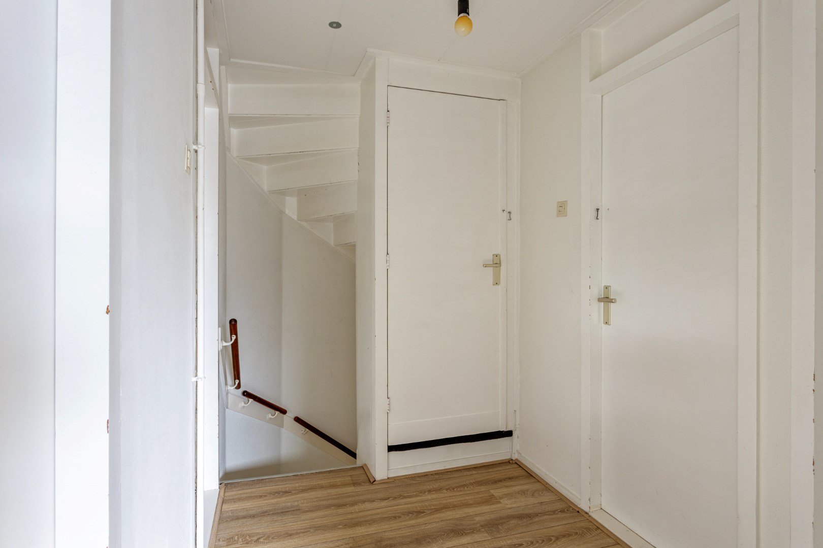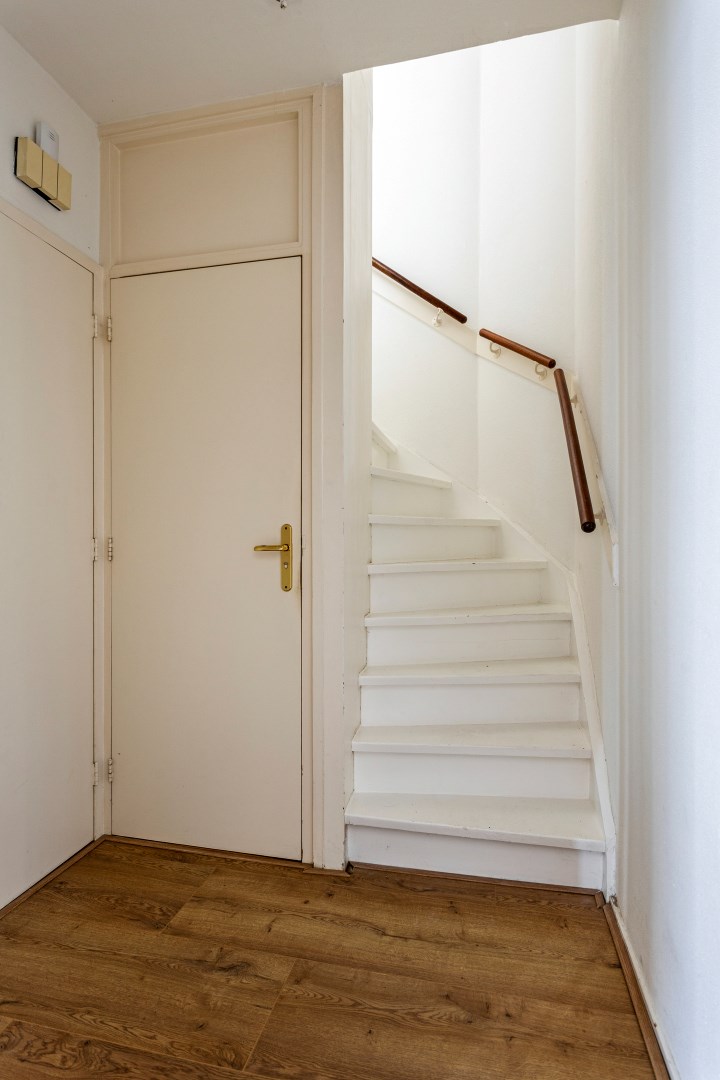 Halverwege de woonkamer bevindt zich een hal met toilet, meterkast en trap naar de 1e verdieping.