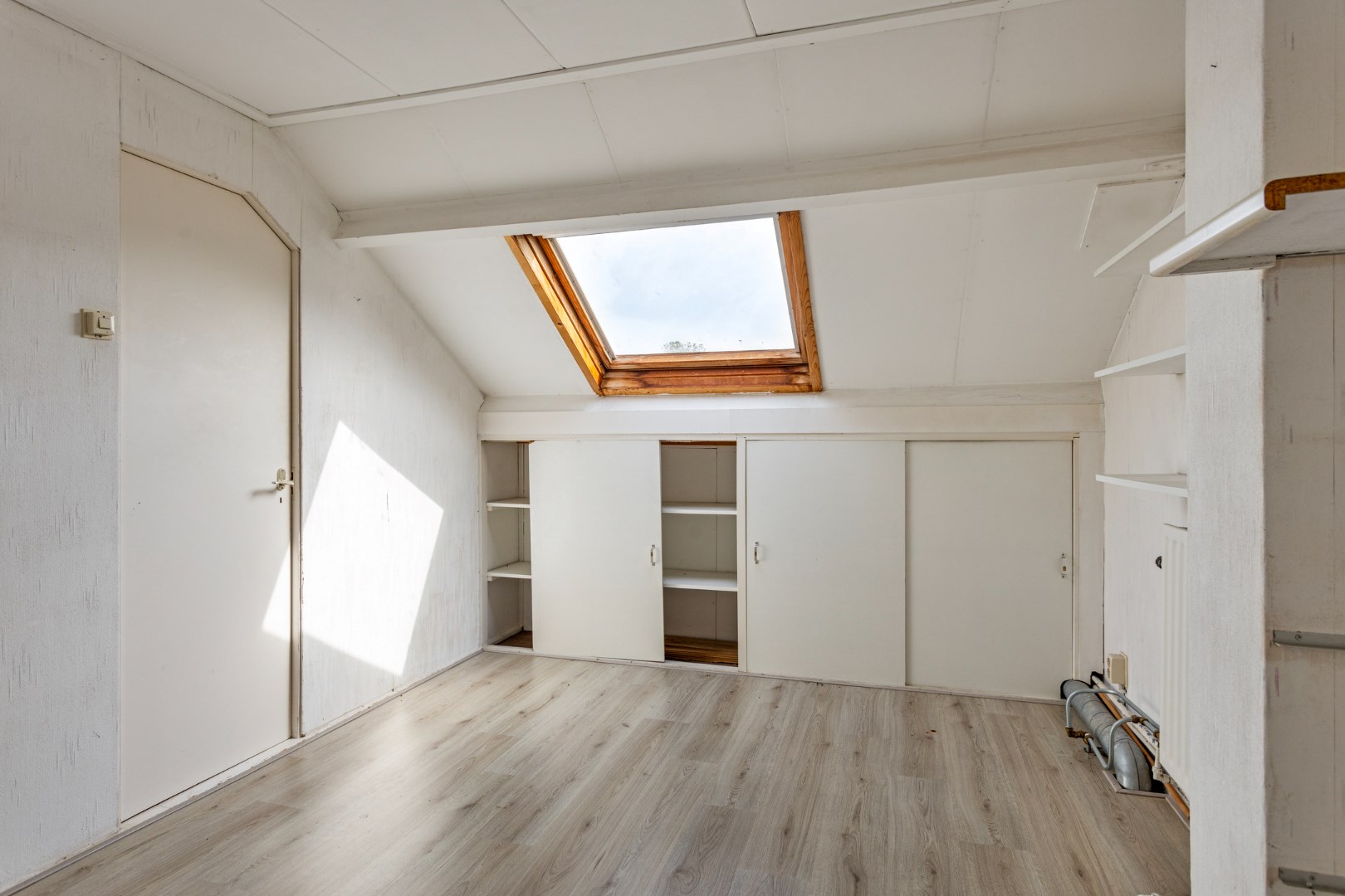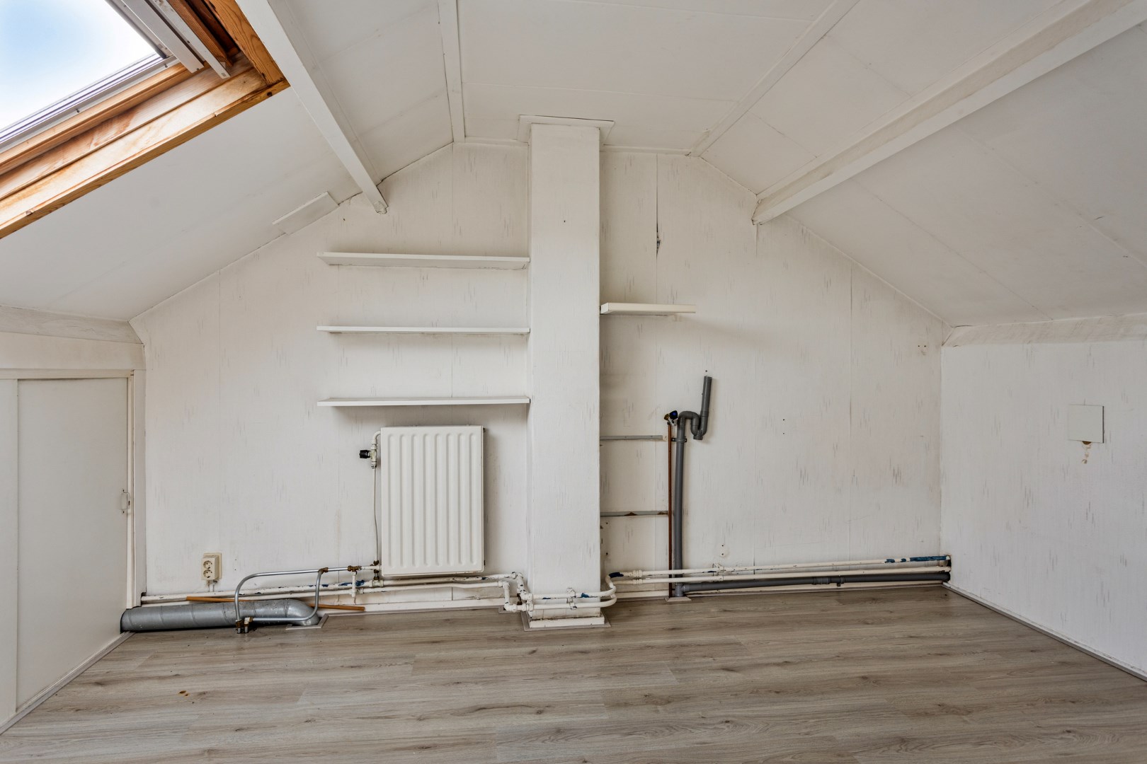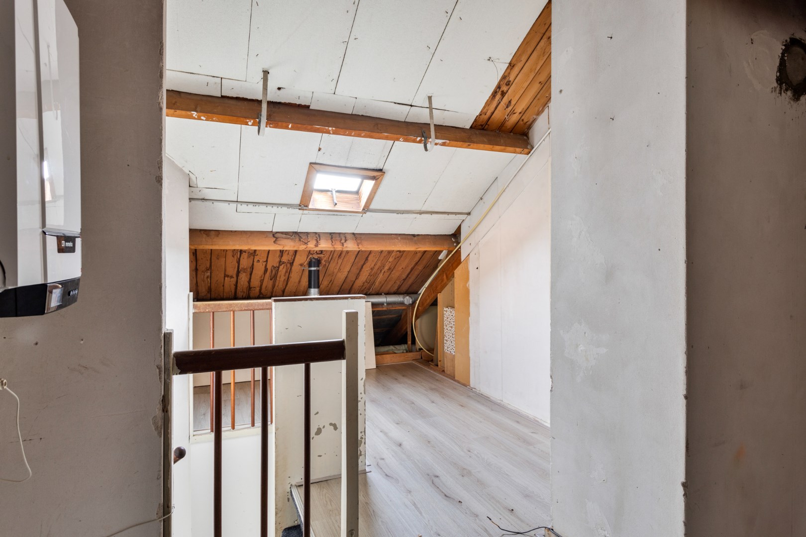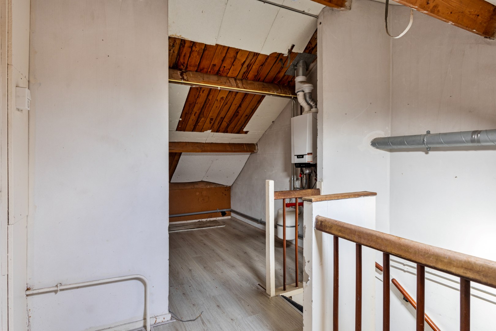 Overloop met opstelplaats voor de Cv-installatie zolderkamer met dakraam aan de achterzijde en opstelplaats voor wasmachine en droger.