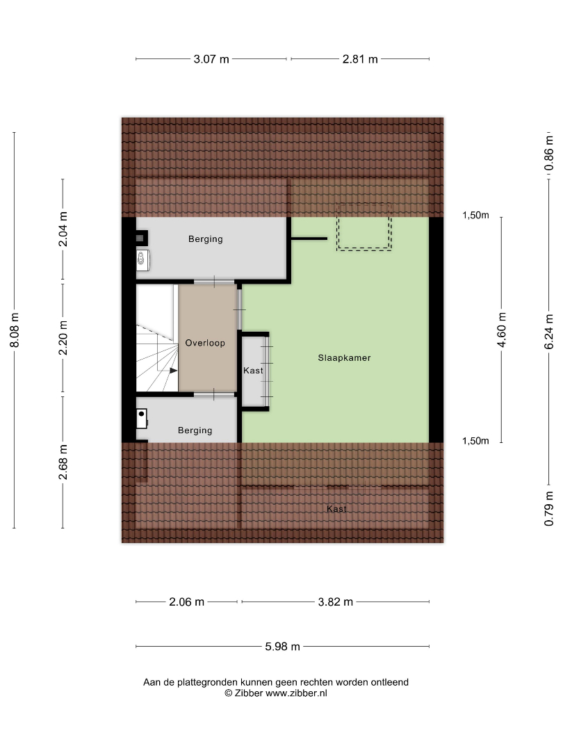Overloop , een berging aan de voor- en achterzijde, in laatstgenoemde bevindt zich de opstelplaats voor de Cv-installatie, grote zolderkamer met Velux dakvenster.