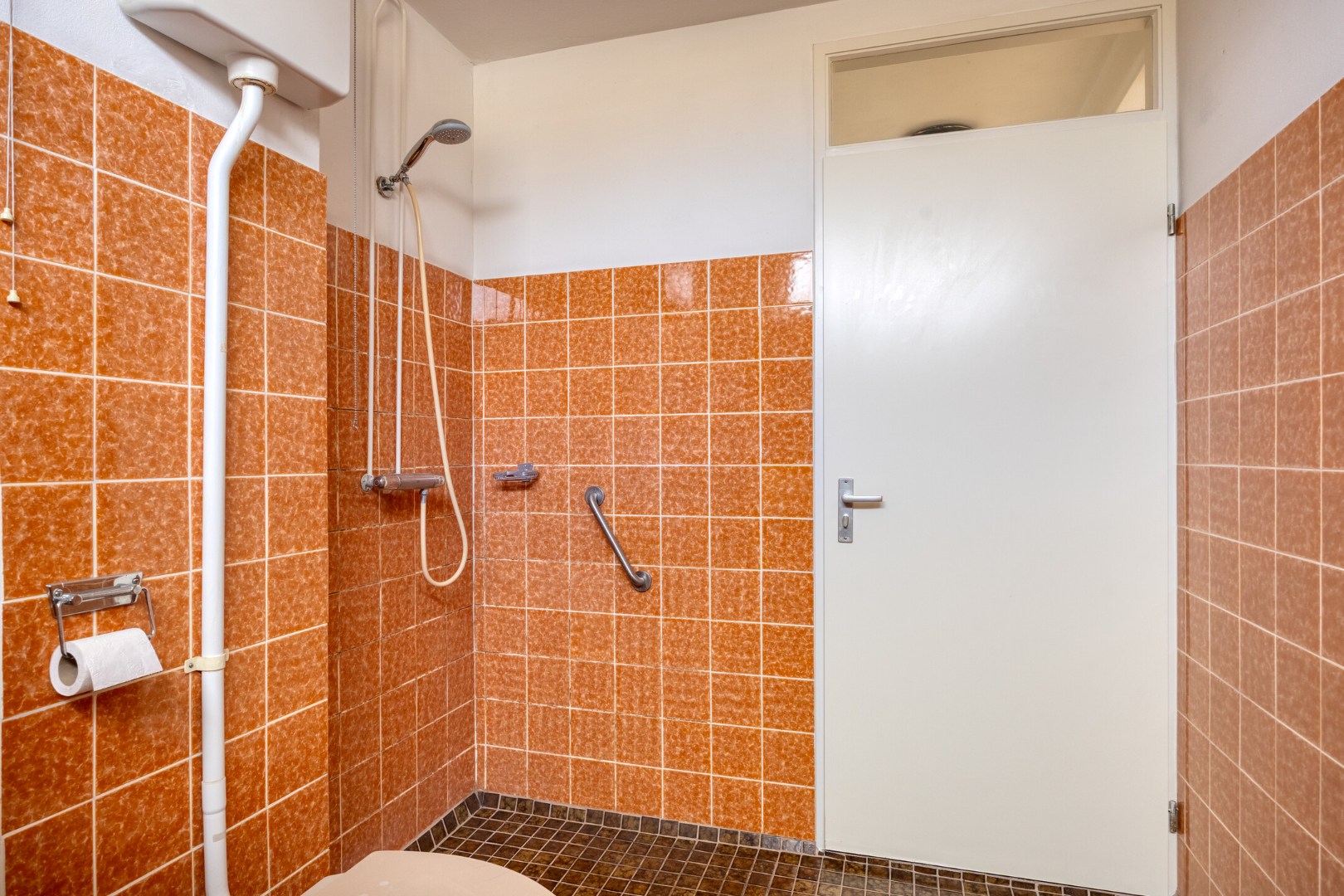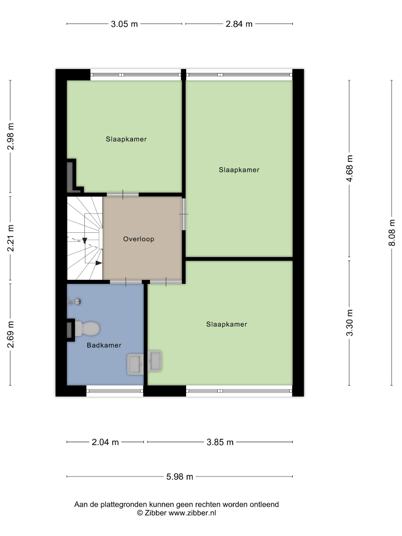 Overloop, 3 slaapkamers waarvan één met wastafel, badkamer met douche, toilet, wastafel en opstelplaats voor wasmachine en droger.