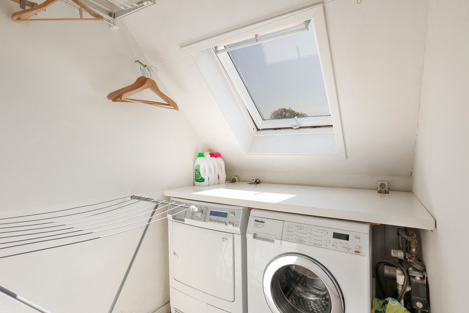 Overloop, 2 slaapkamers, 2e badkamer met bad, toilet en wastafel, wasruimte met opstelplaats voor de wasmachine, droger en de CV-installatie. Grote vliering te bereiken via een vlizotrap.