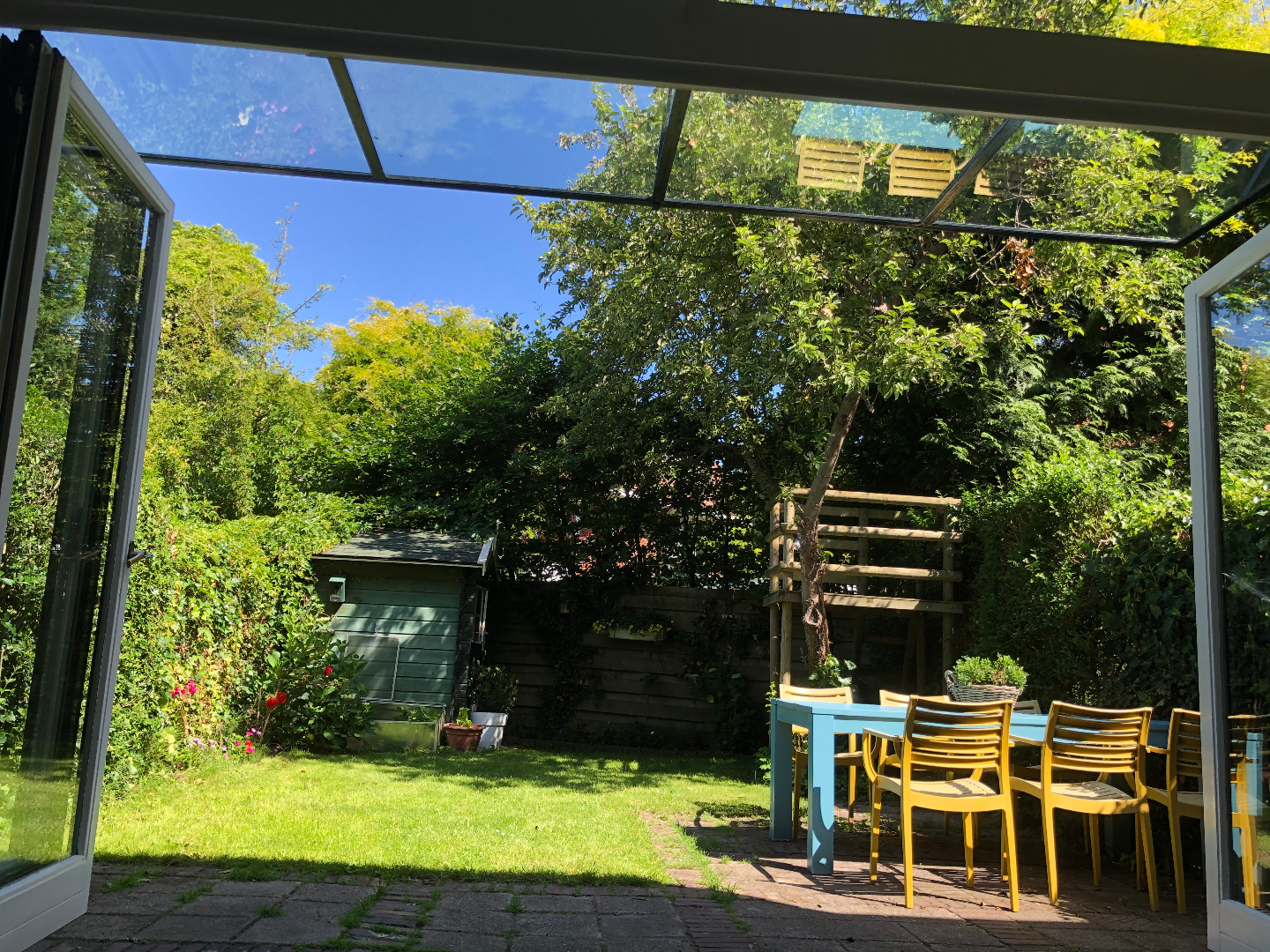 Entree met tochtportaal, hal met trapkast, modern toilet en toegang tot het woongedeelte. Het woongedeelte bestaat uit een ruime living met openhaard en schuifseparatie naar de achtergelegen eetkamer die via de aanbouw weer in verbinding staat met de keuken. De keuken is voorzien van alle inbouwapparatuur die je in een woning als deze mag verwachten. De aanbouw is voorzien van harmonica deuren waardoor de tuin echt een onderdeel van de woning wordt.