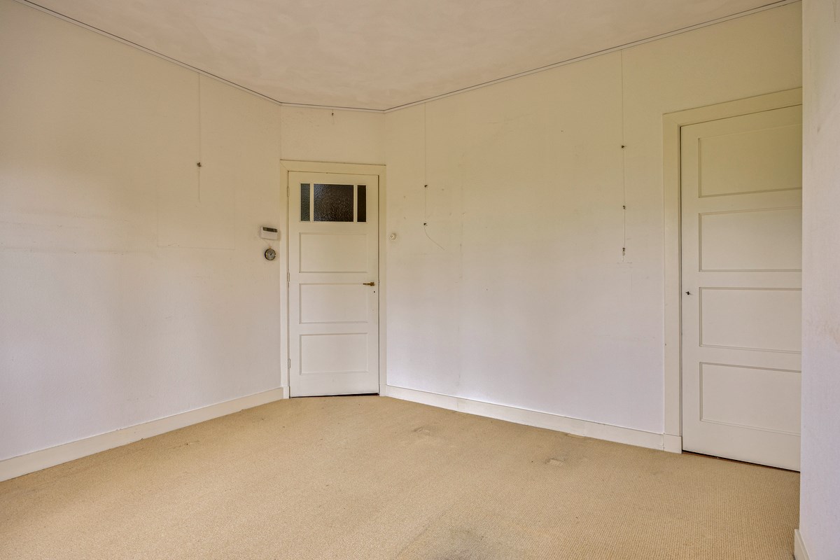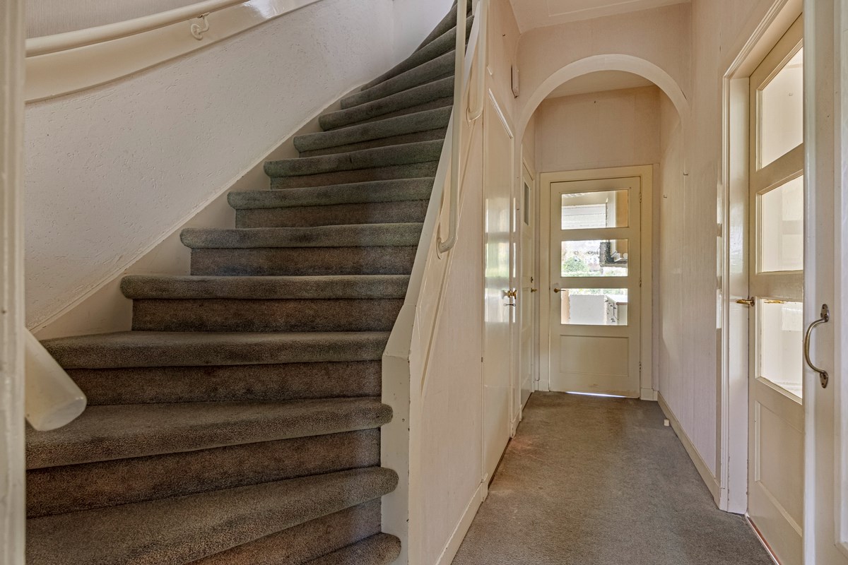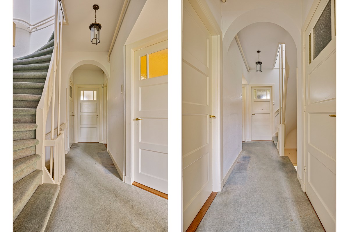 Entree via de voortuin. Via het ruime voorportaal komt u in de gang die geeft toegang tot het toilet, de bergruimte onder de trap en de opgang naar de eerste verdieping.