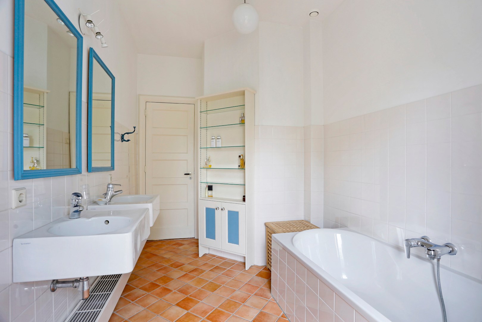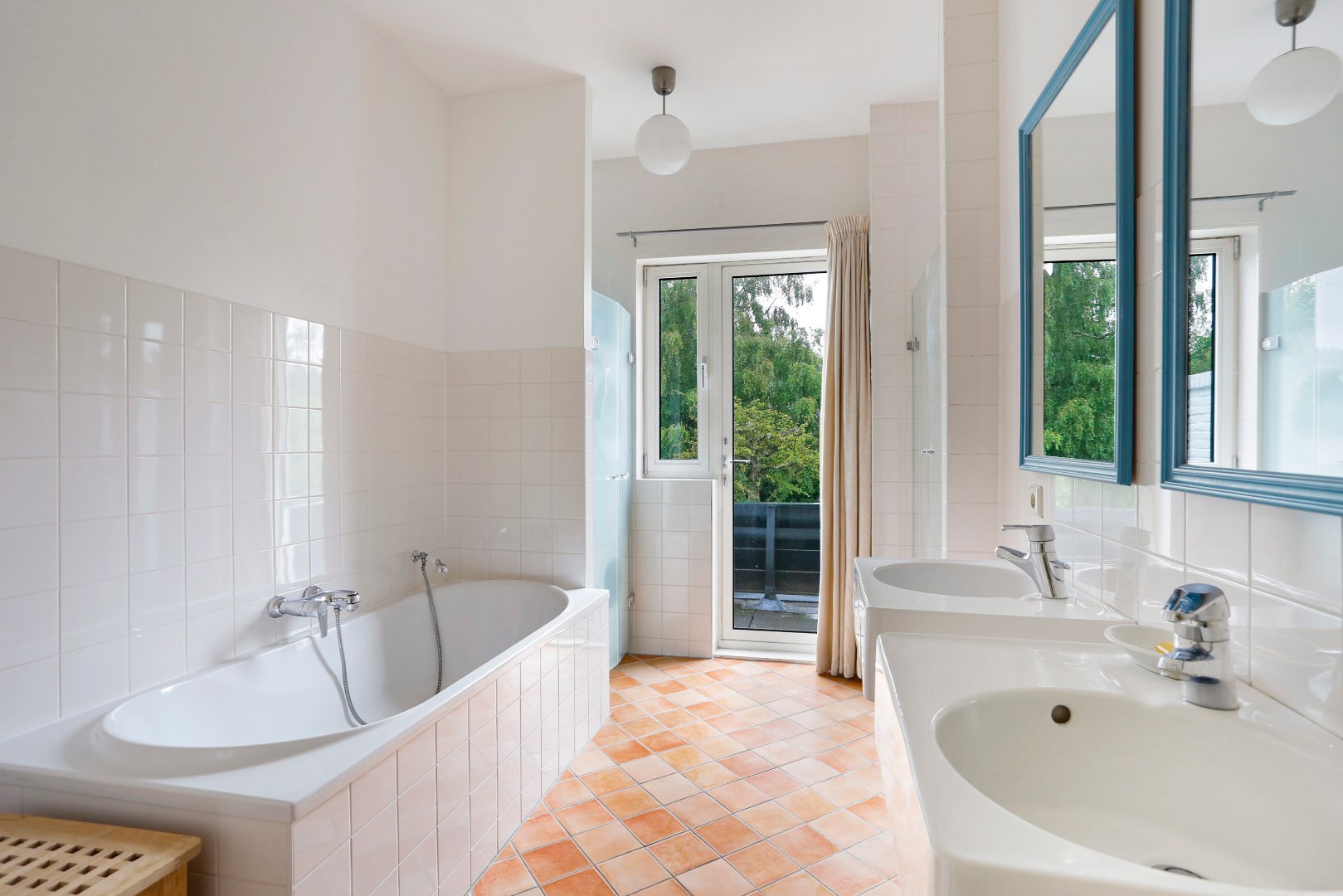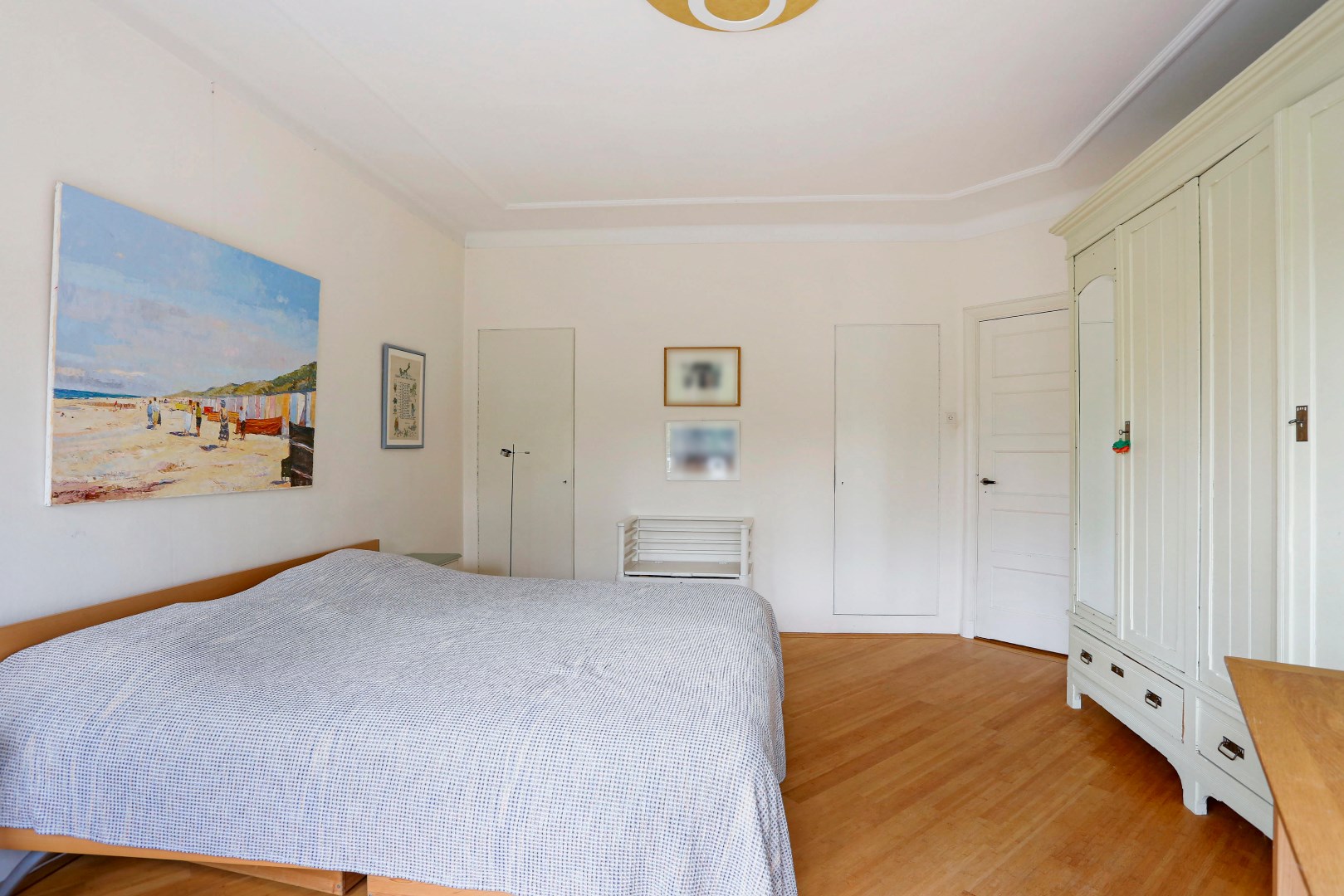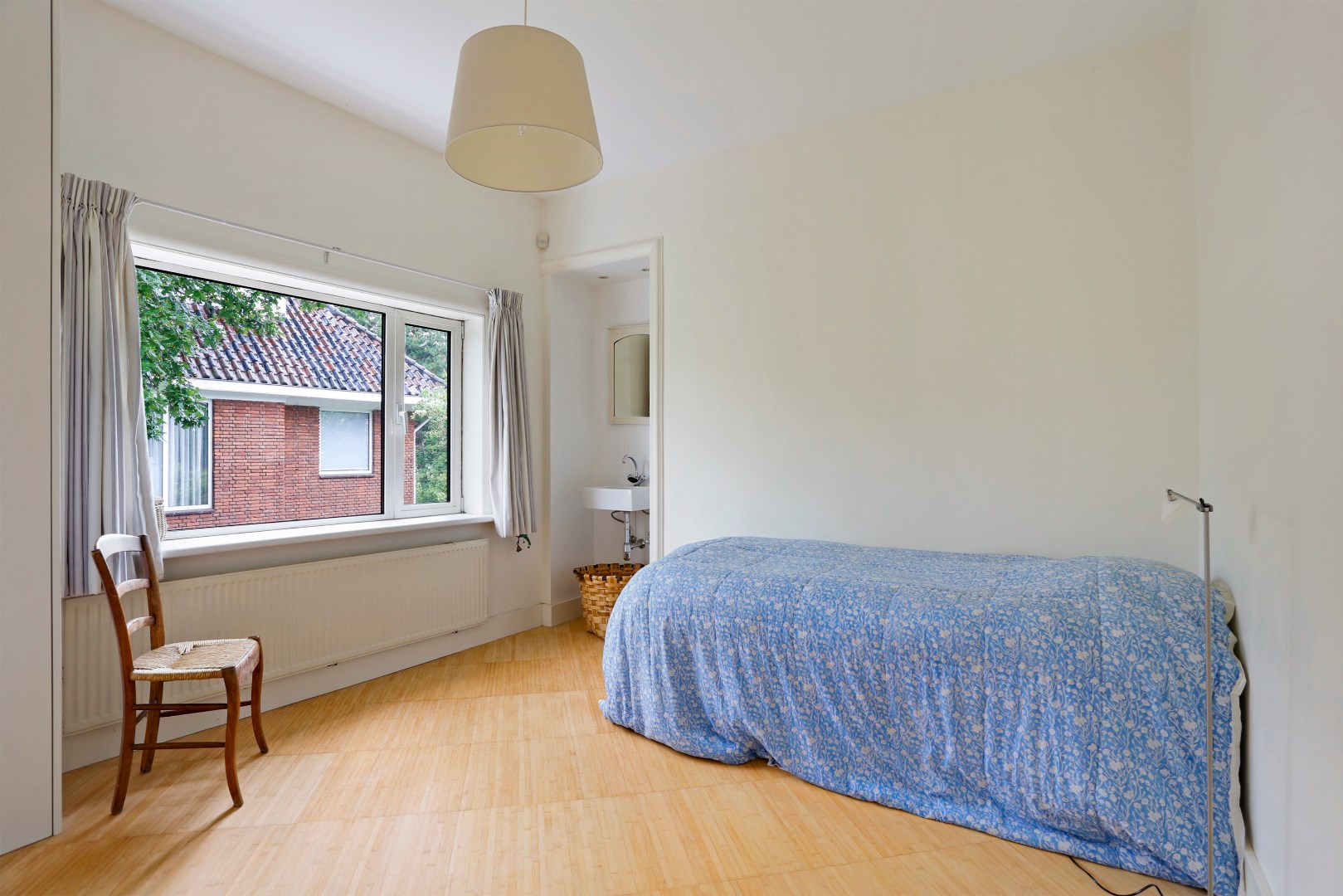 Overloop met toegang tot alle vertrekken, zeer ruime slaap/studeerkamer aan de voorzijde, zij-slaapkamer met wastafel, slaapkamer aan de achterzijde met openslaande deuren naar het balkon, separaat toilet, badkamer met douche, bad, dubbele wastafel en opstelplaats voor wasmachine en droger.