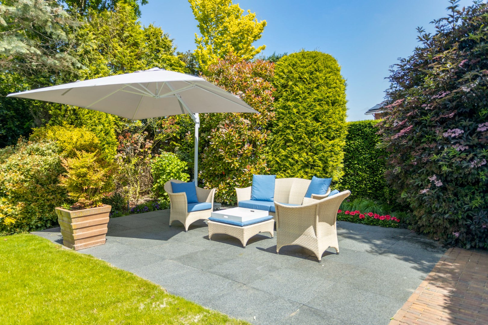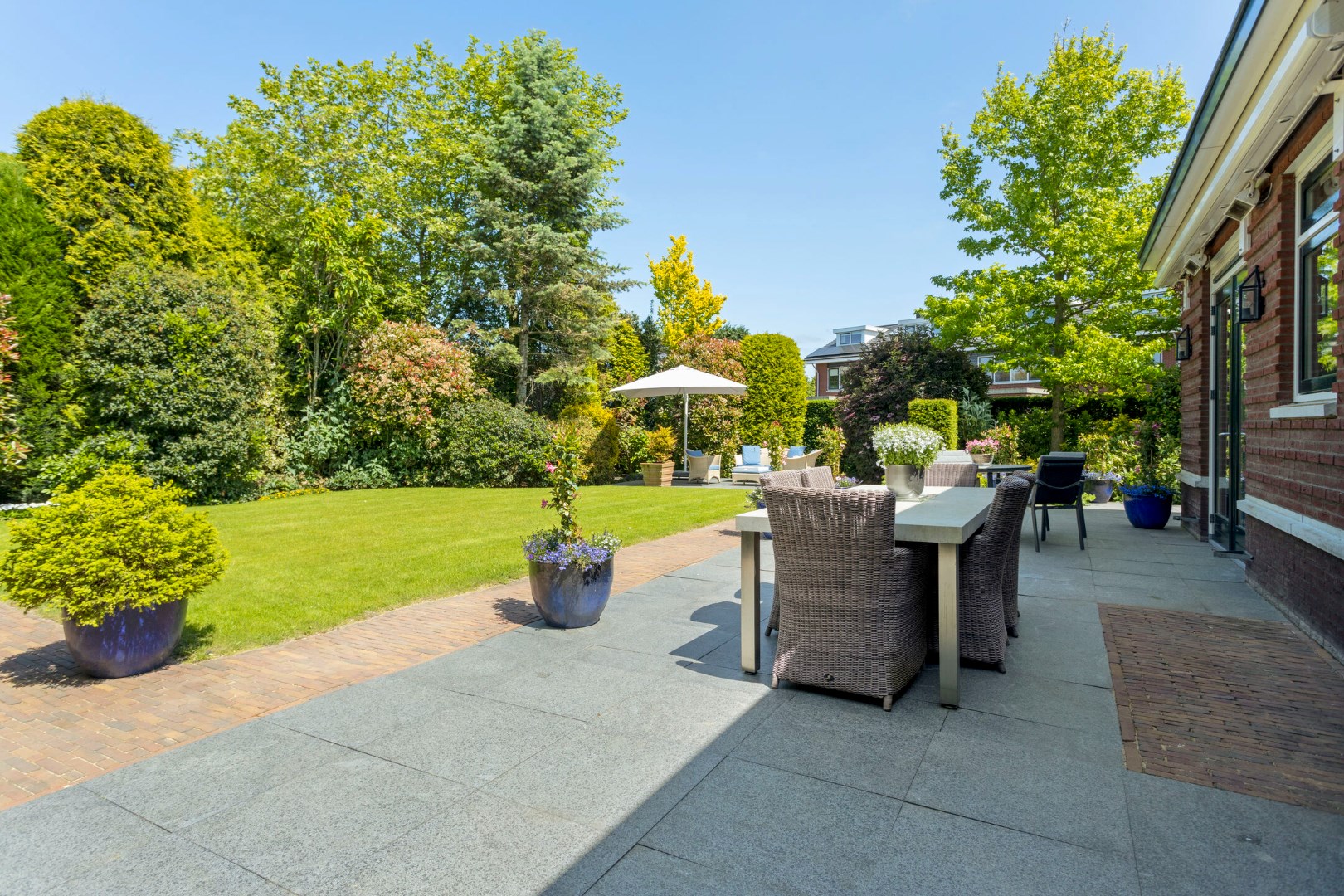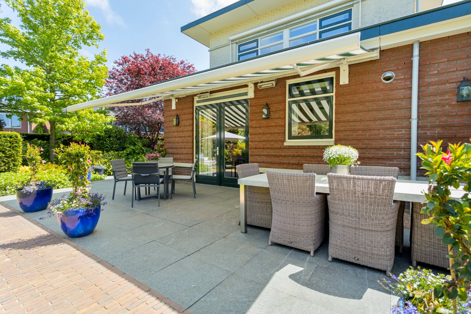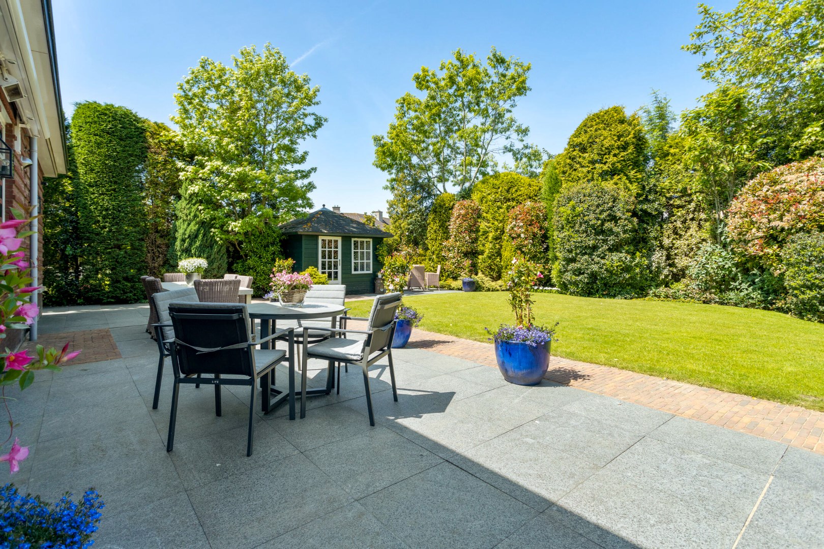 De riante tuin is prachtig aangelegd en geeft veel privacy. Aan de achterzijde heeft deze meerdere terrassen waar u gedurende de hele dag kunt genieten van zon en schaduw. In het tuinhuis is voldoende ruimte voor fietsen, tuingereedschap en overige opslag. De tuin kan ook worden bereikt via de garage en via een poort aan de zijkant van de oprit.