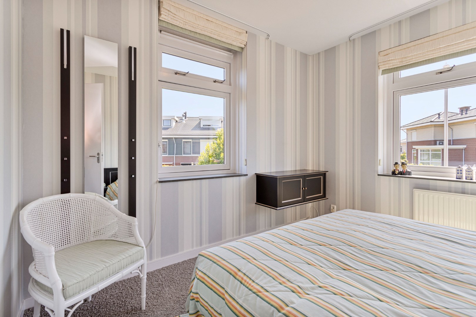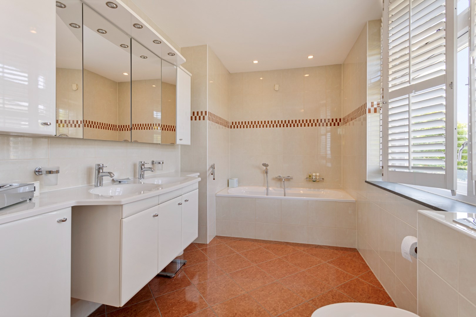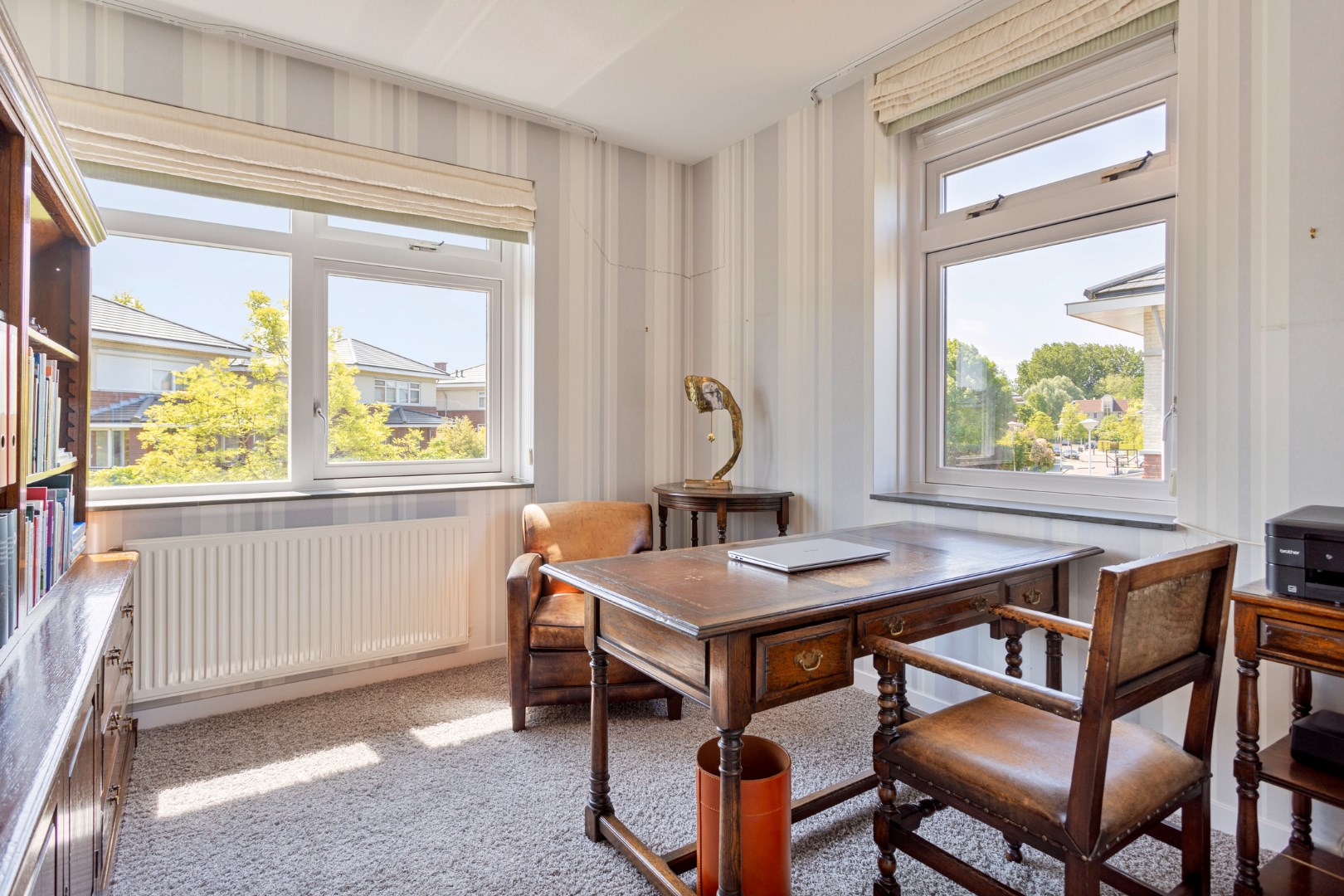 Via the stairs you reach the landing on the first floor which gives access to the 3 bedrooms, two bathrooms and an extra room. The primary bedroom is located at the rear. The spacious ensuite bathroom has a bath, shower, toilet and large bathroom furniture with double sink and plenty of cupboard space. This bedroom also has a walk-in closet which can be enlarged by adding the intermediate room. At the front are two bedrooms, one of which is now used as an office. The second bathroom has a shower, toilet and sink. The intermediate room can be used as a dressing room, for example.
