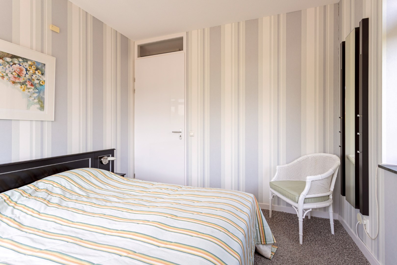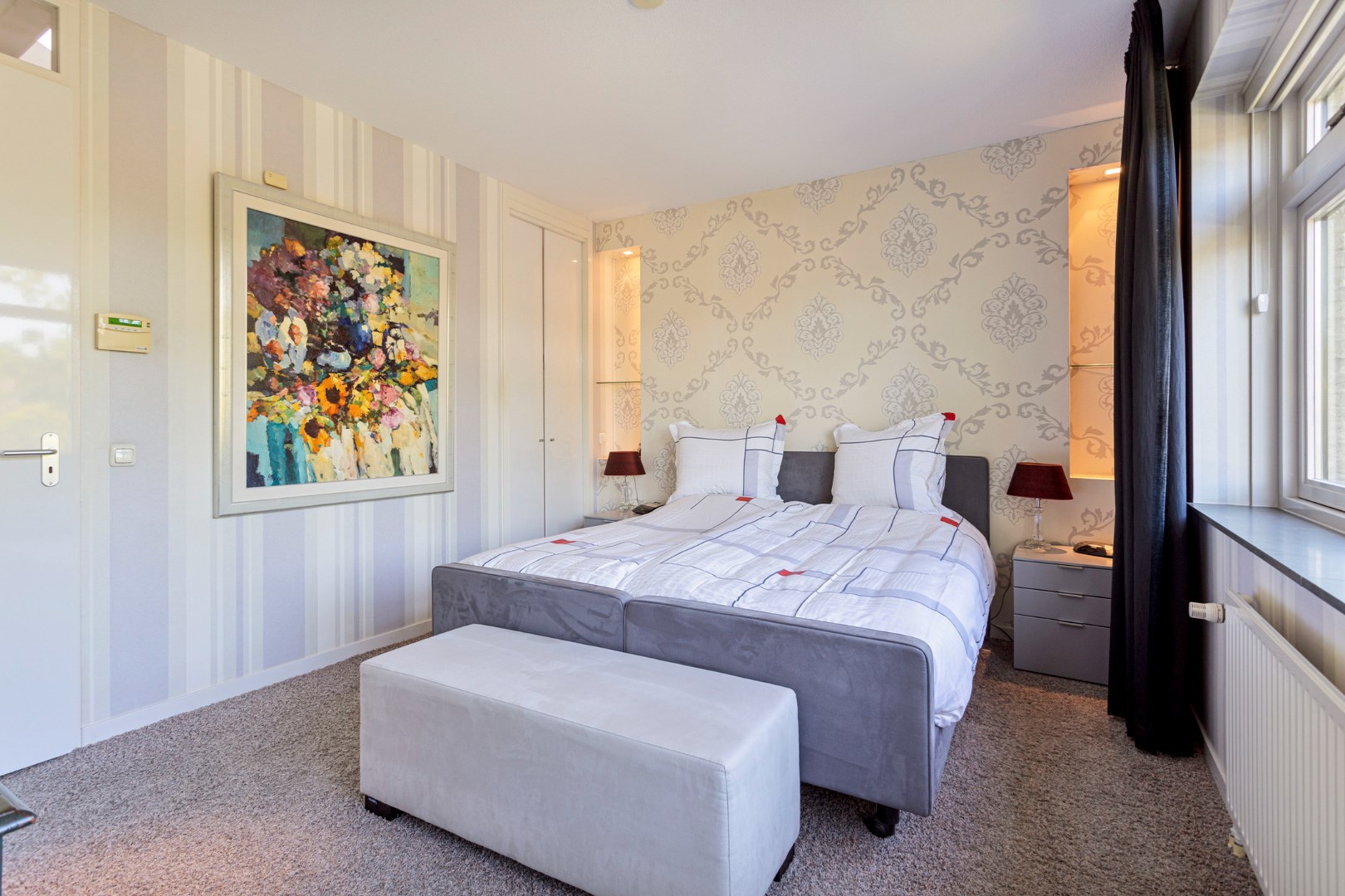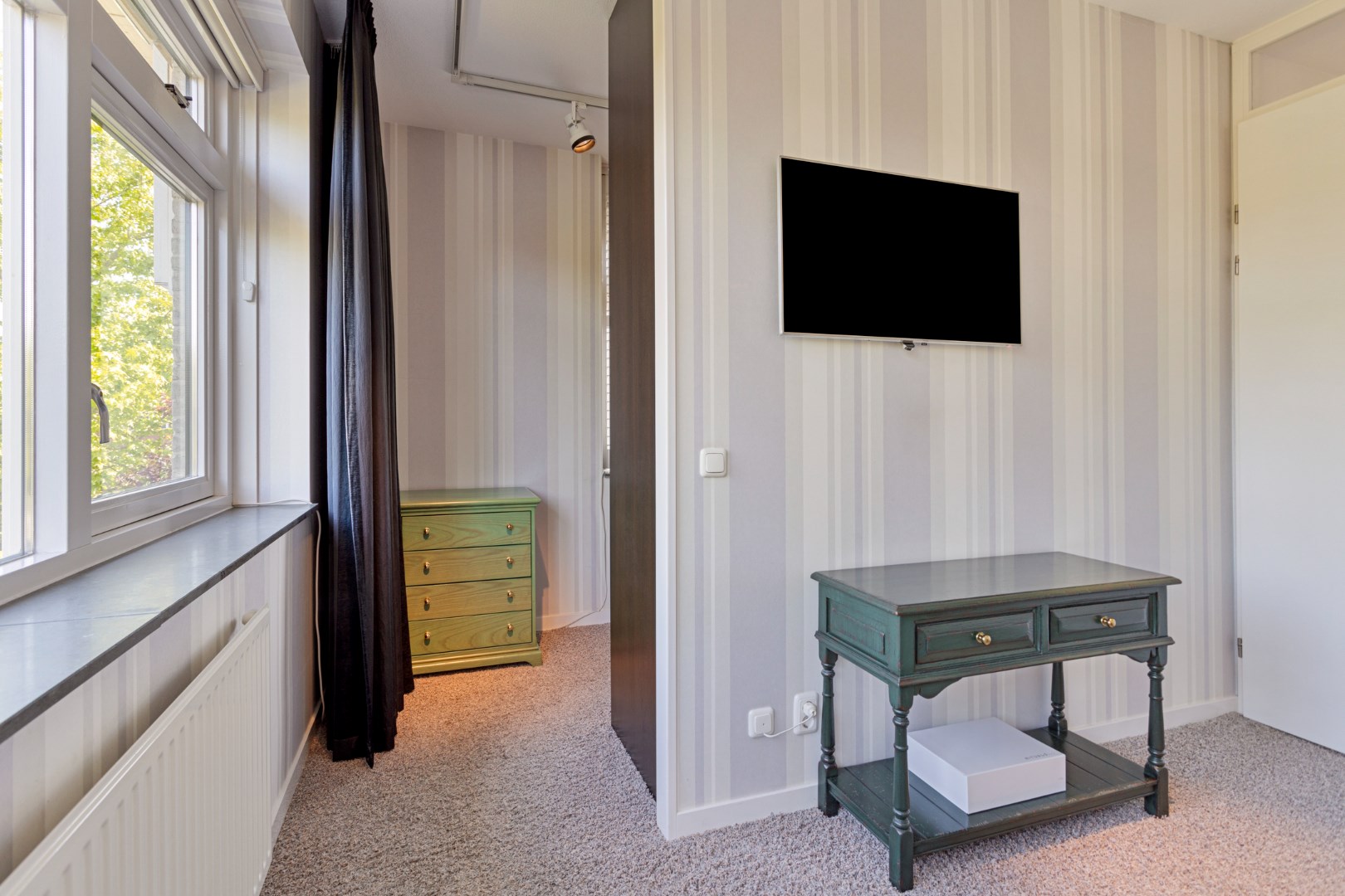 Via the stairs you reach the landing on the first floor which gives access to the 3 bedrooms, two bathrooms and an extra room. The primary bedroom is located at the rear. The spacious ensuite bathroom has a bath, shower, toilet and large bathroom furniture with double sink and plenty of cupboard space. This bedroom also has a walk-in closet which can be enlarged by adding the intermediate room. At the front are two bedrooms, one of which is now used as an office. The second bathroom has a shower, toilet and sink. The intermediate room can be used as a dressing room, for example.