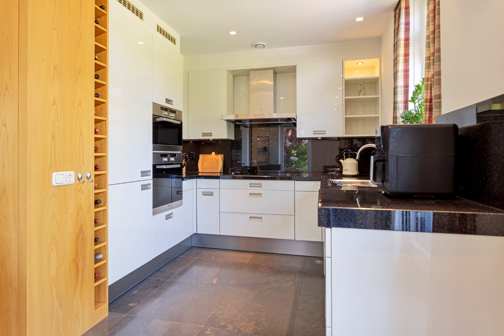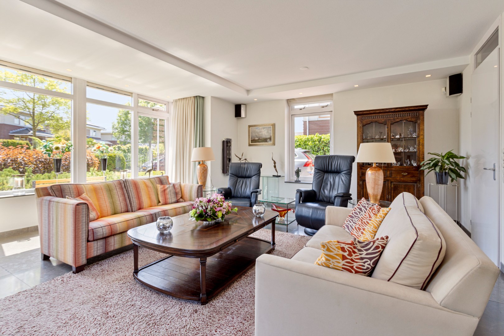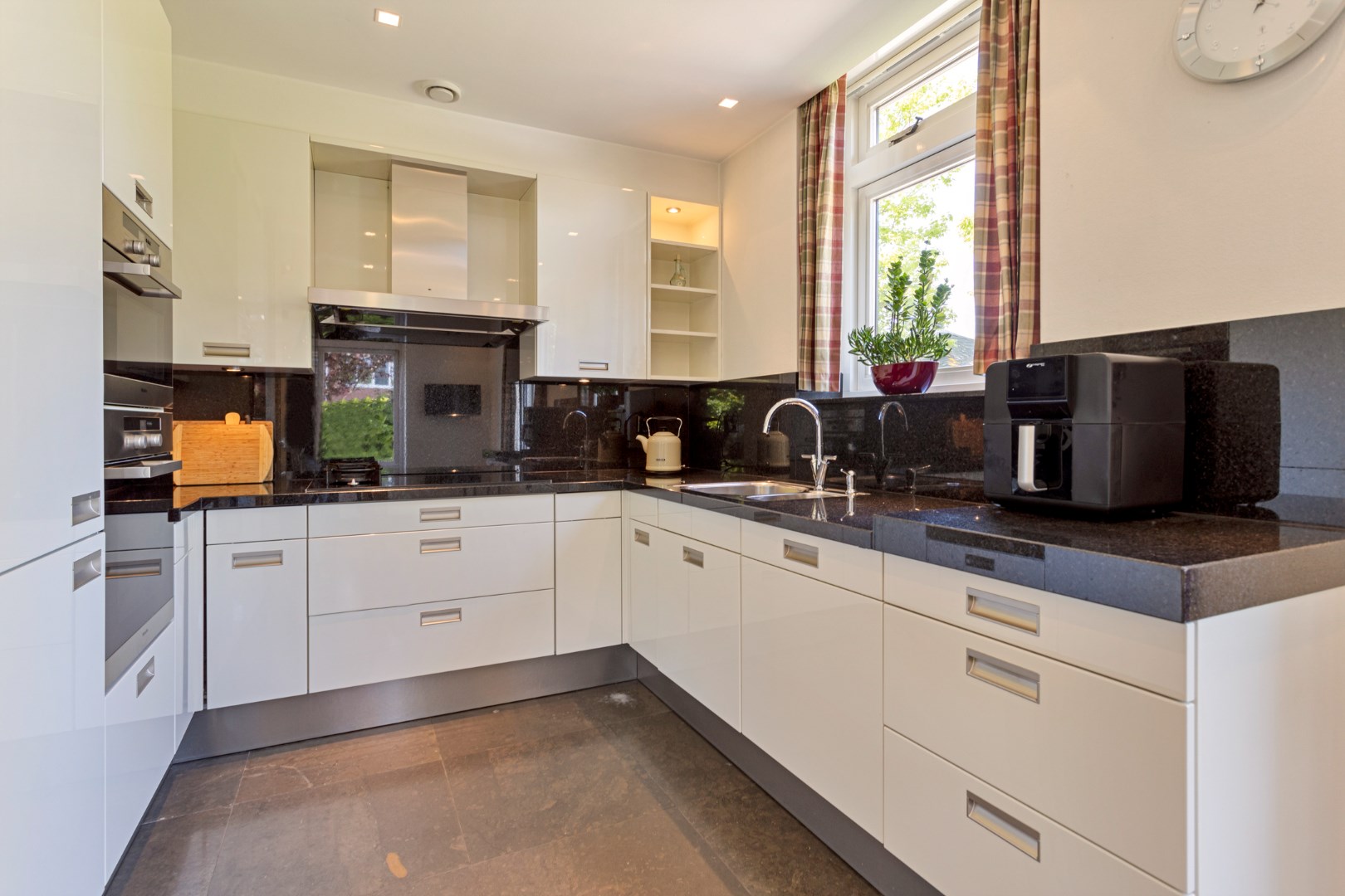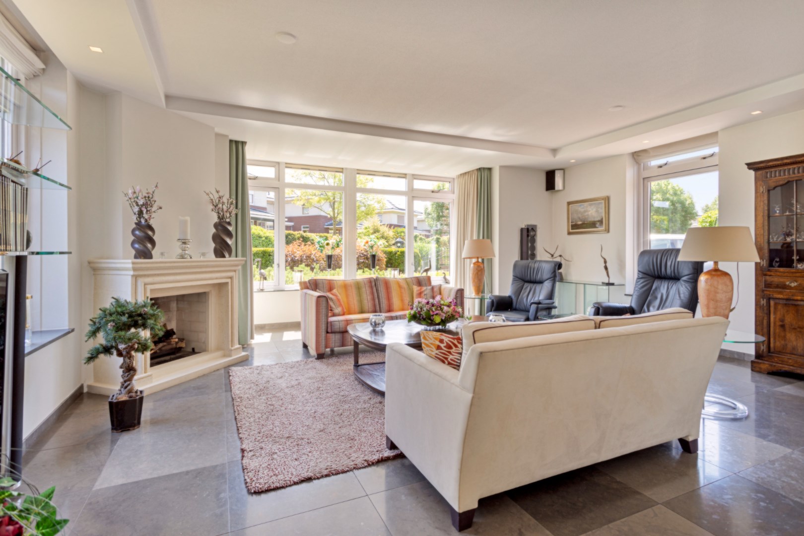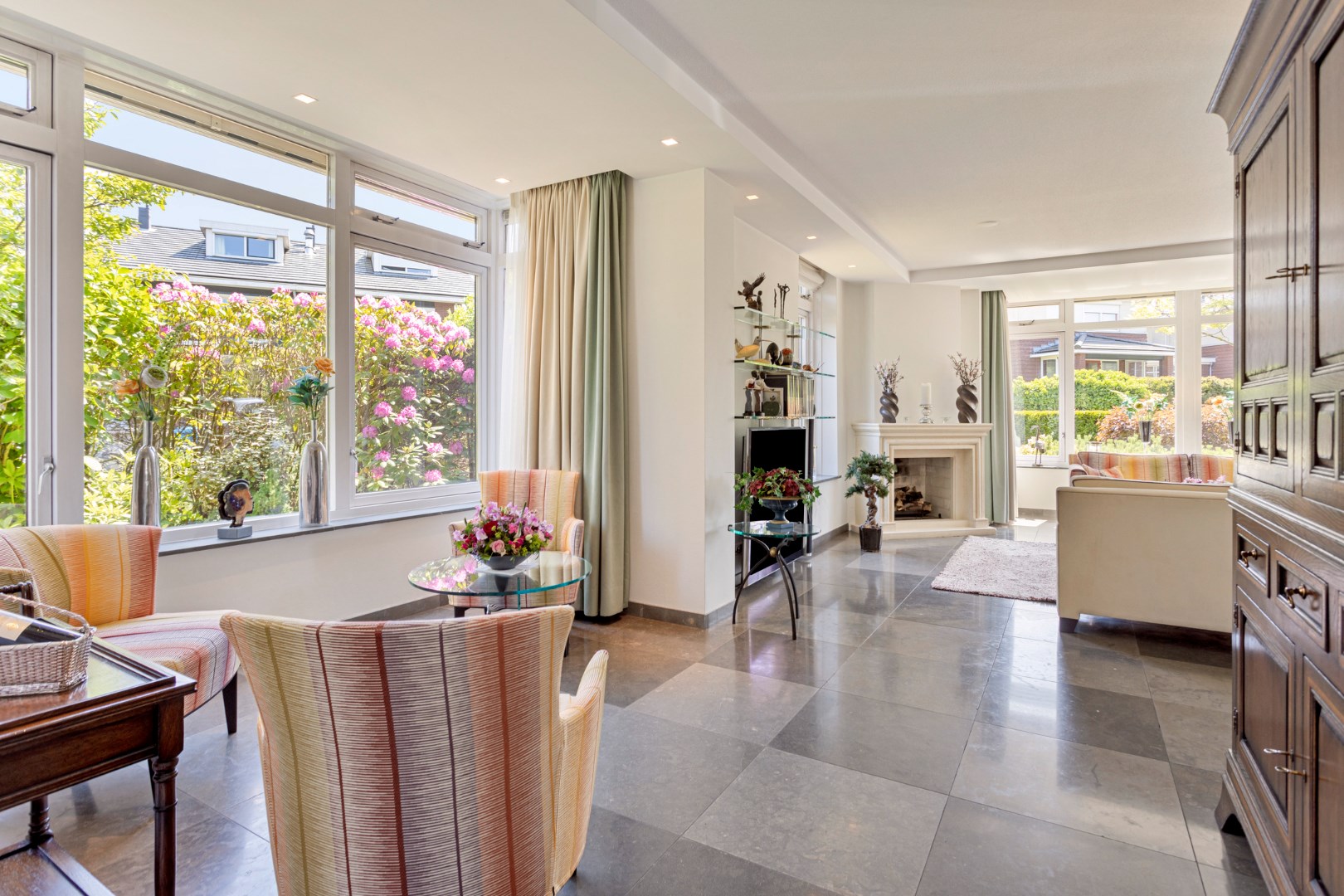 The bright, spacious living room with large windows has a gas fireplace and a bay window where you can sit with a cup of coffee. The dining room with large fixed cupboard wall is located at the rear and gives access to the great garden through French doors. The open kitchen is equipped with the built-in appliances that you would expect from a home like this. The entire ground floor has a tiled floor with underfloor heating.