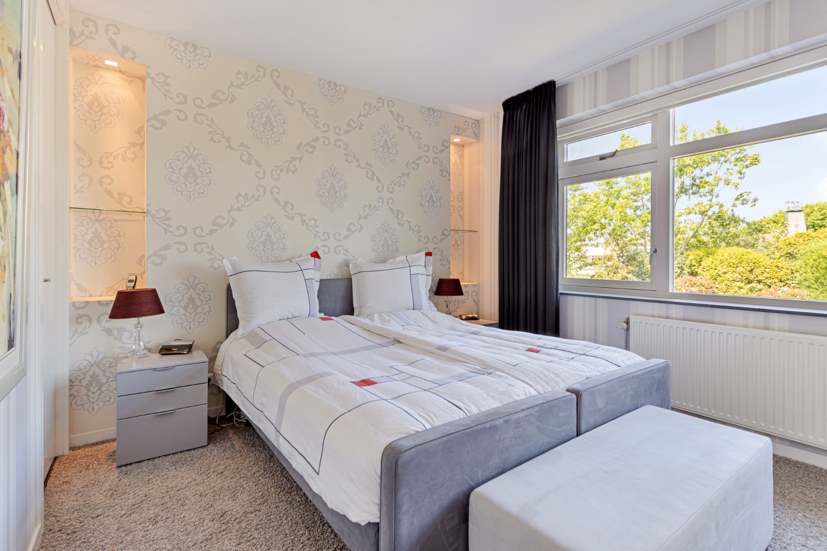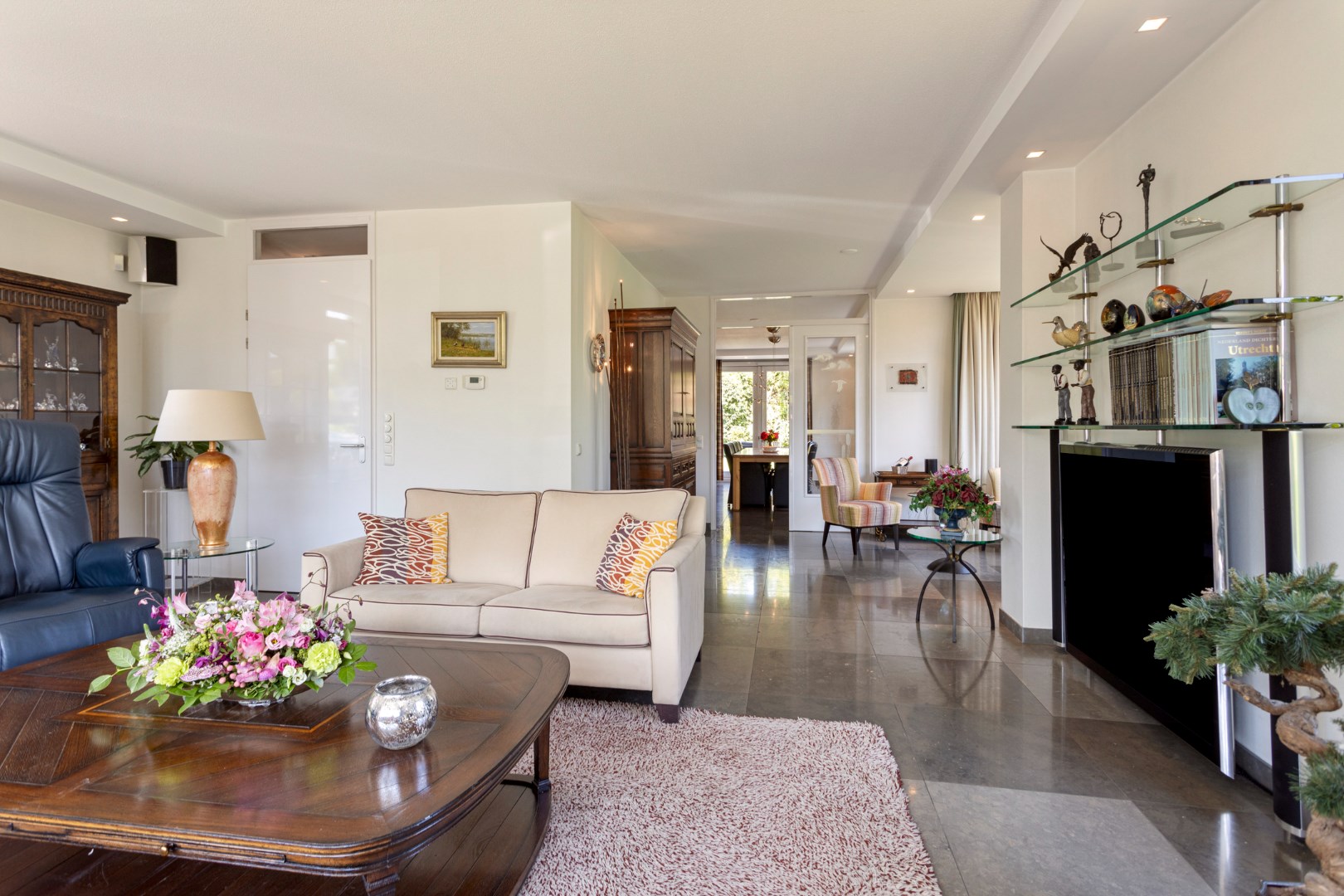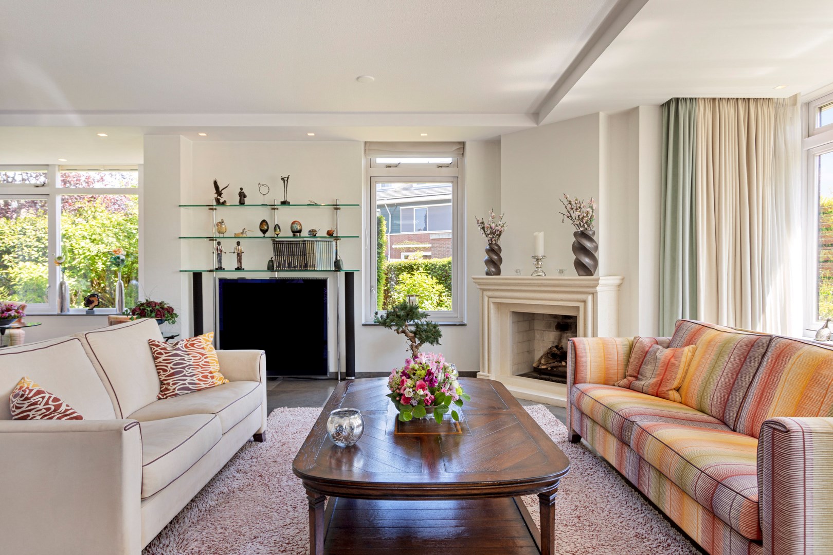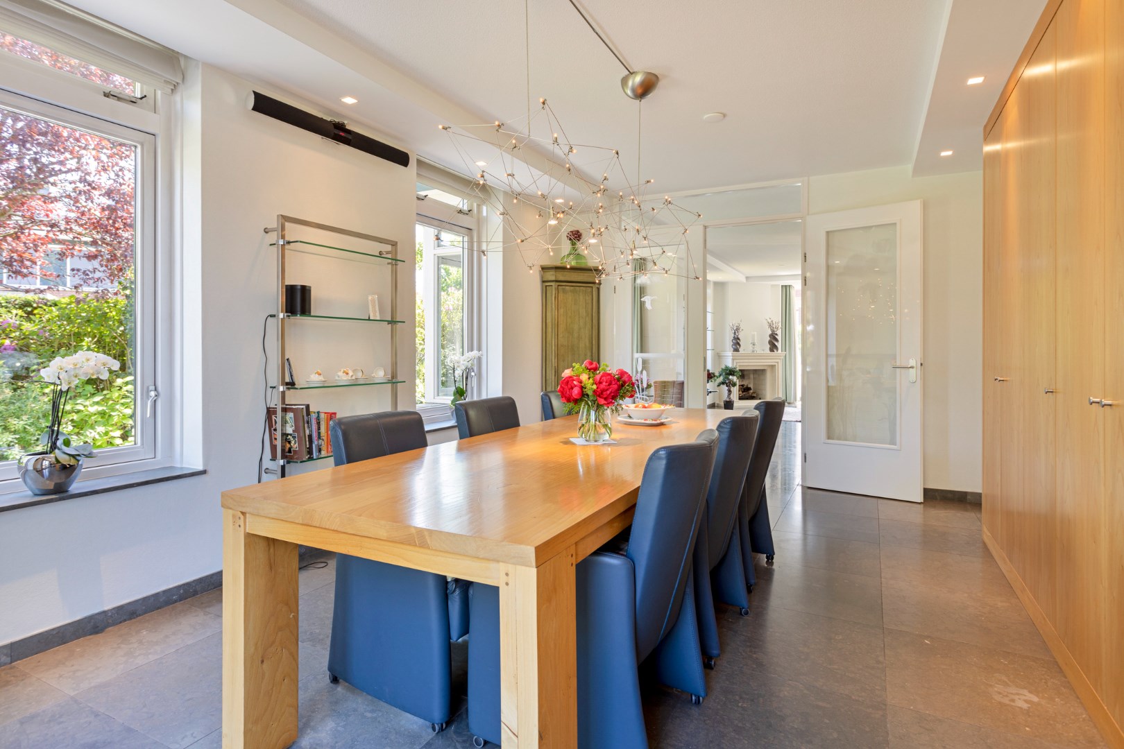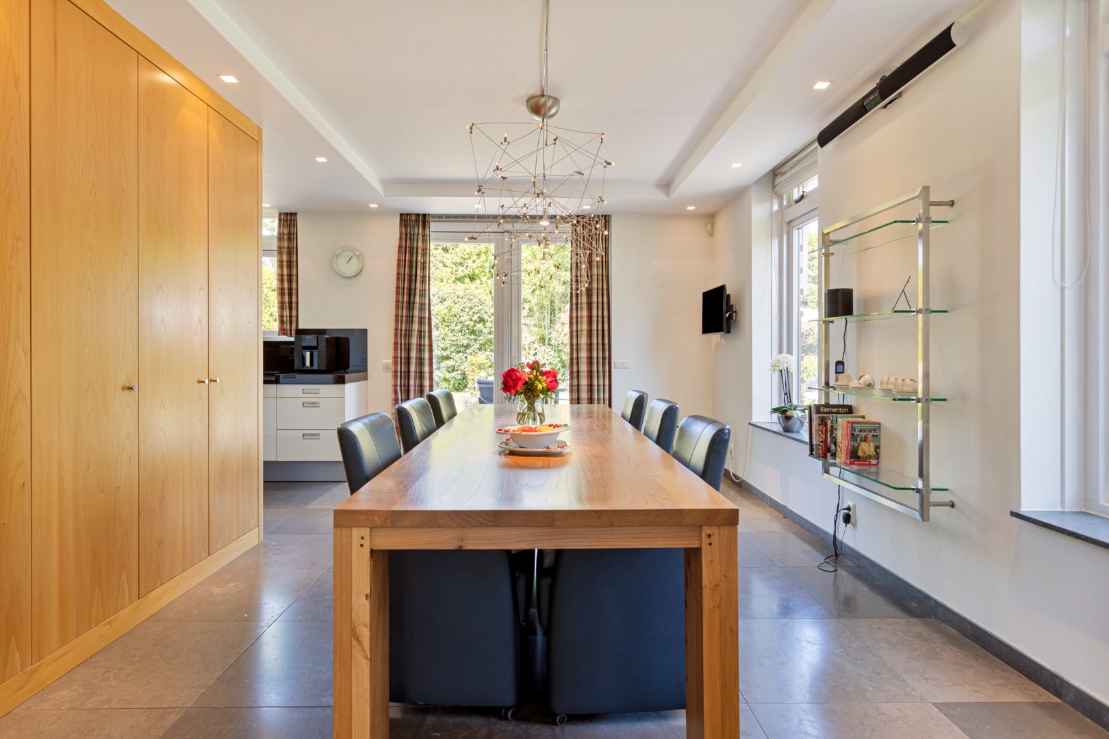 The bright, spacious living room with large windows has a gas fireplace and a bay window where you can sit with a cup of coffee. The dining room with large fixed cupboard wall is located at the rear and gives access to the great garden through French doors. The open kitchen is equipped with the built-in appliances that you would expect from a home like this. The entire ground floor has a tiled floor with underfloor heating.