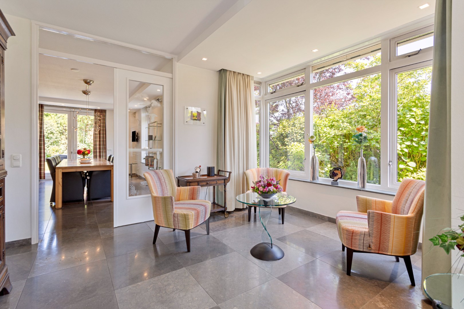 De lichte, riante woonkamer met grote raampartijen heeft een gashaard en een erker waar het heerlijk zitten is met een kopje koffie. De eetkamer met grote vaste kastenwand bevindt zich aan de achterzijde en geeft met openslaande deuren toegang tot de geweldige tuin. De open keuken is voorzien van de inbouwapparatuur welke u mag verwachten van een woning als deze. De volledige begane grond is voorzien van een tegelvloer met vloerverwarming.