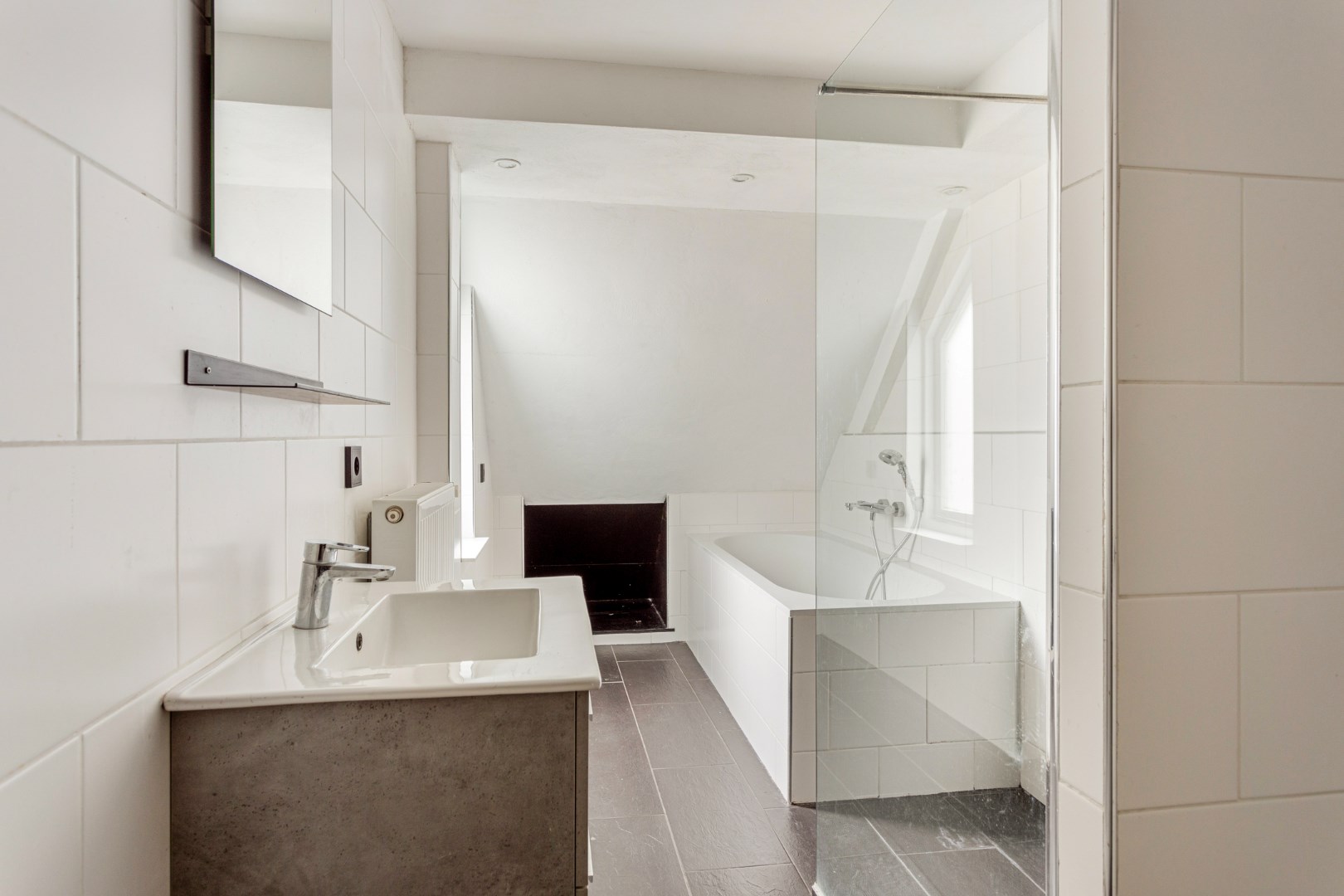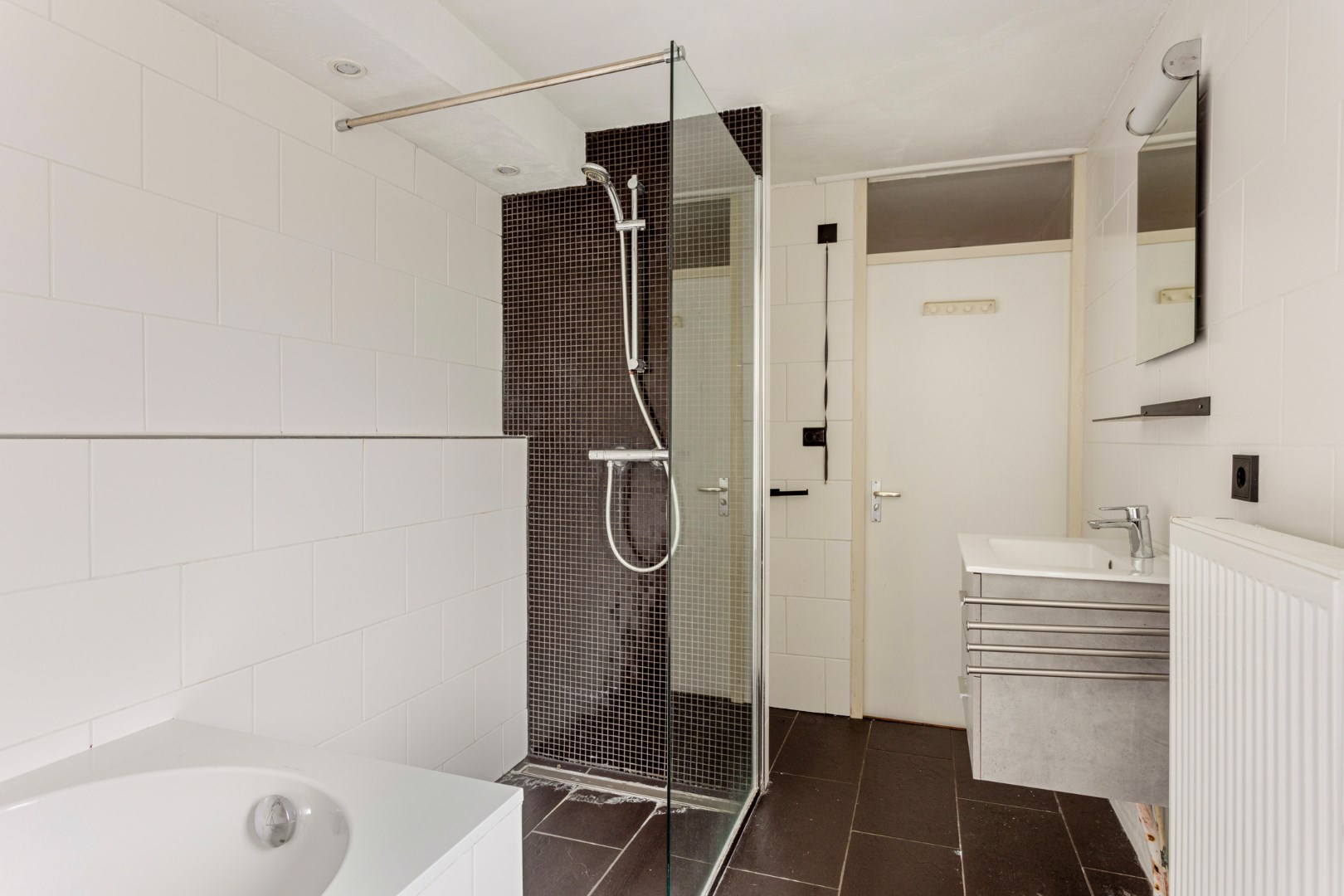 De badkamer met bad, douche, 2e toilet en wastafel bevindt zich tevens aan de achterzijde.