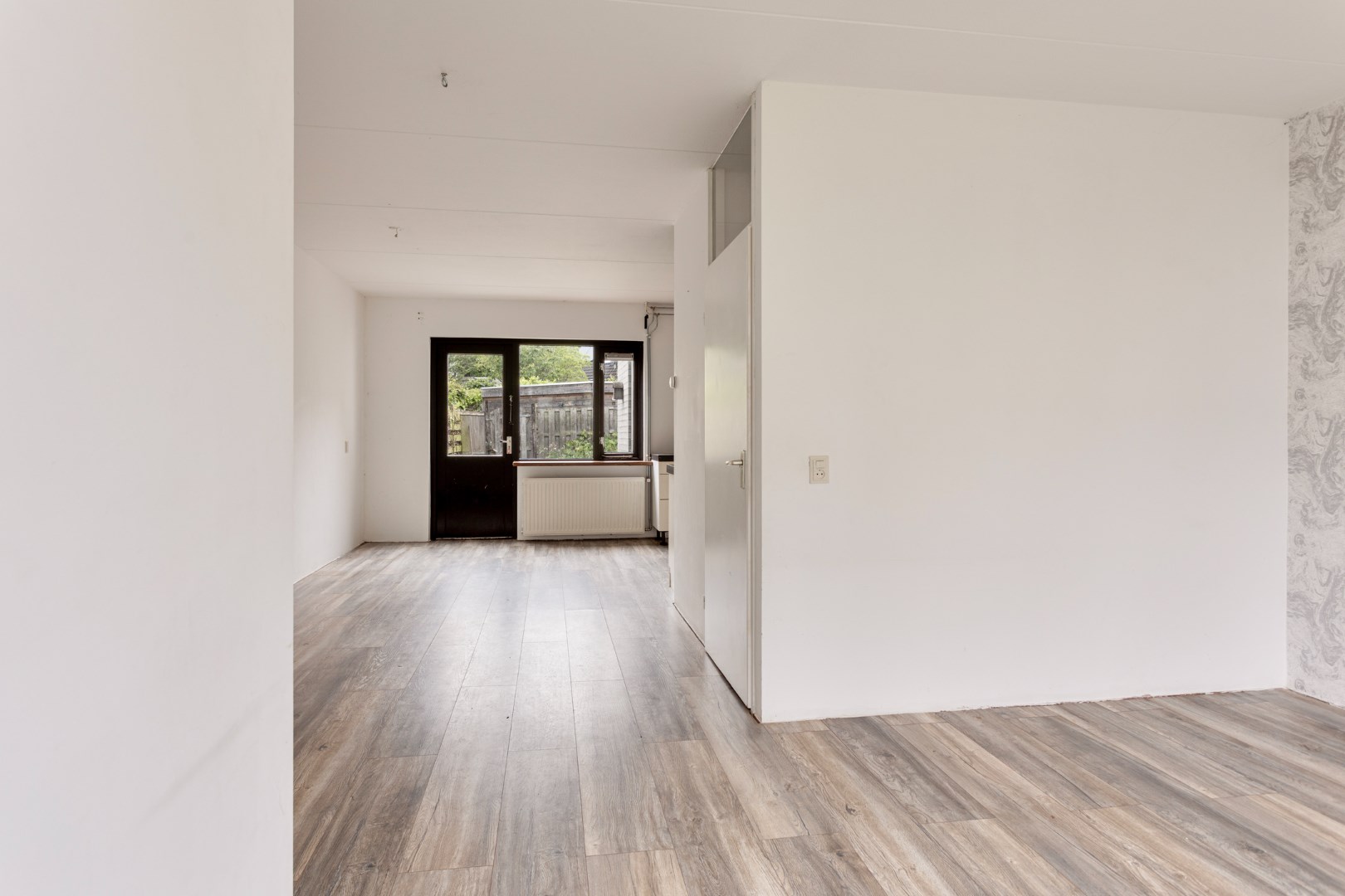Entree, gang, meterkast, L-vormige woonkamer met toegang tot de achtertuin, open keuken, berging, hal met toilet en trap naar de 1e verdieping